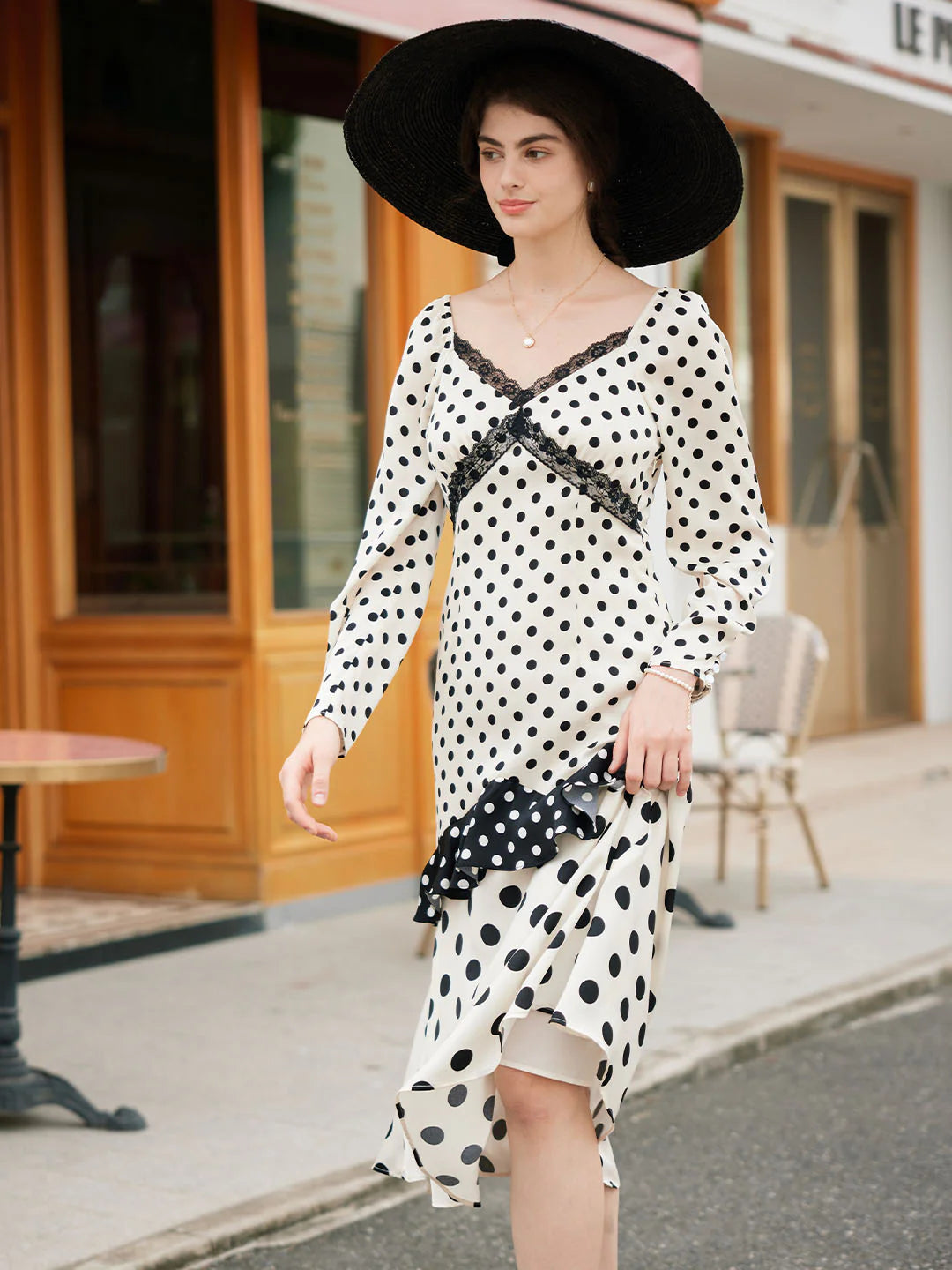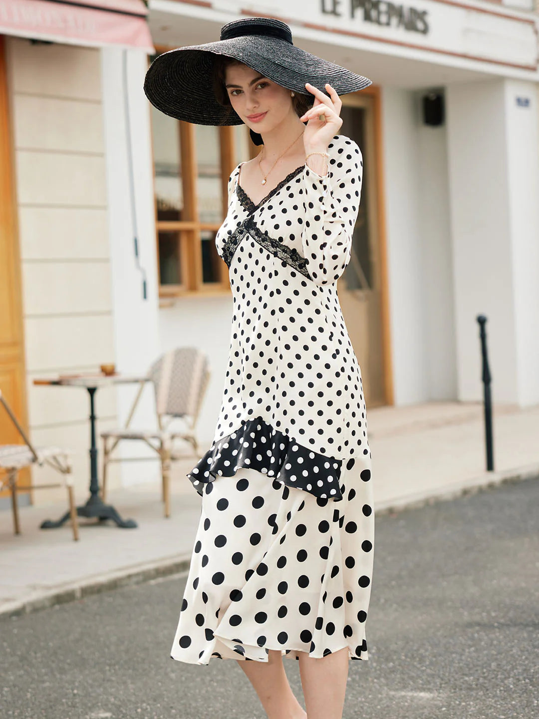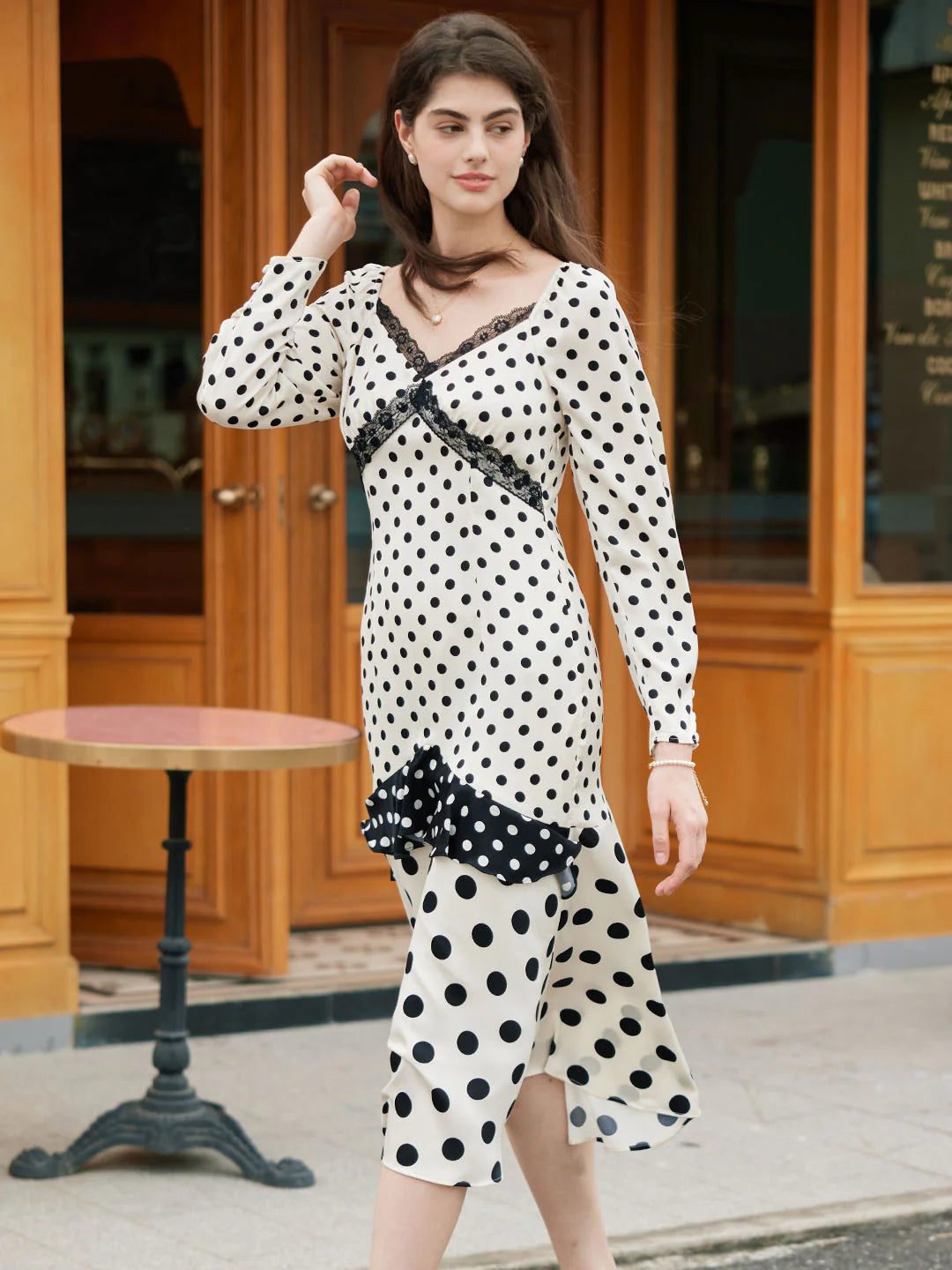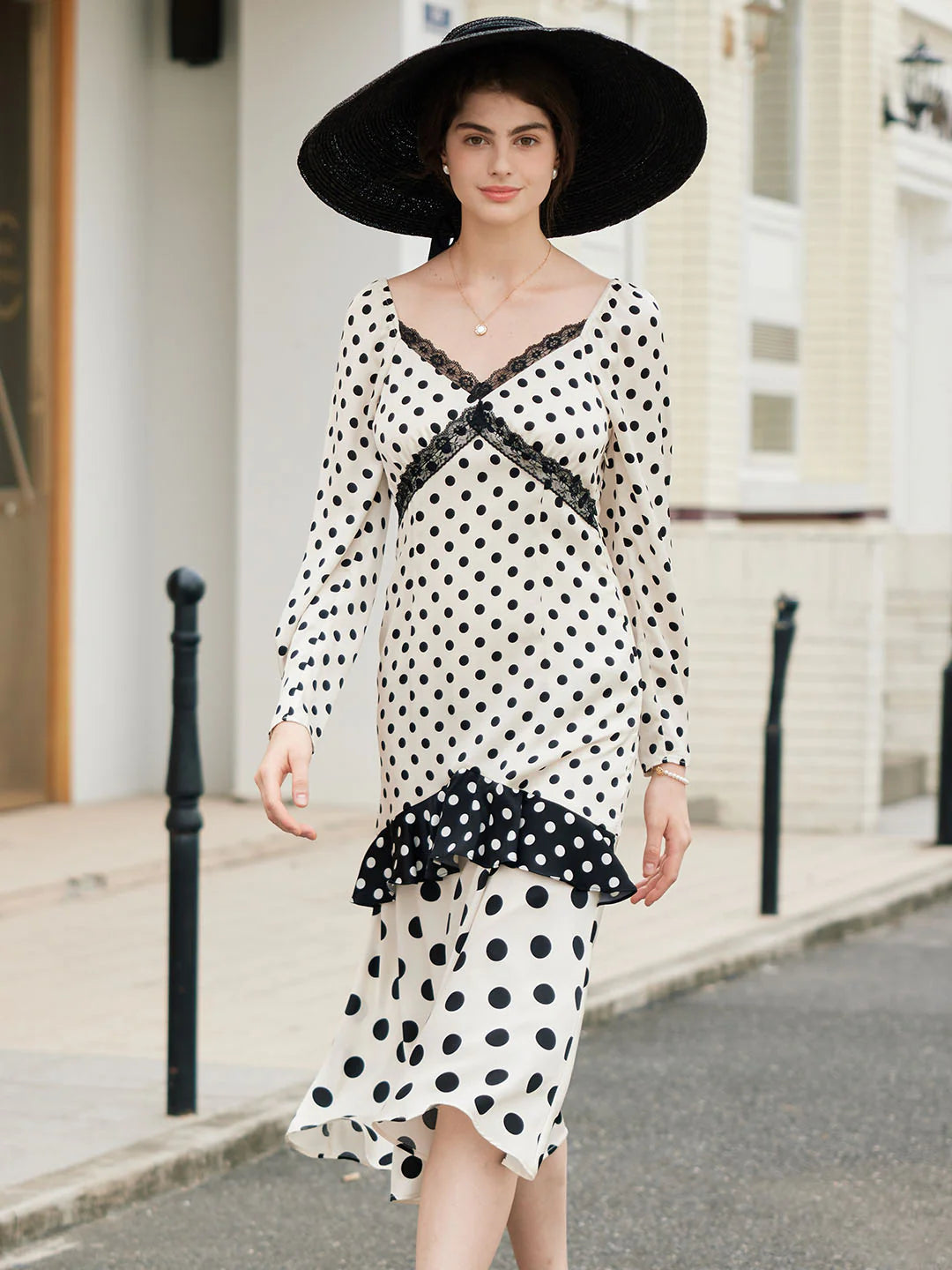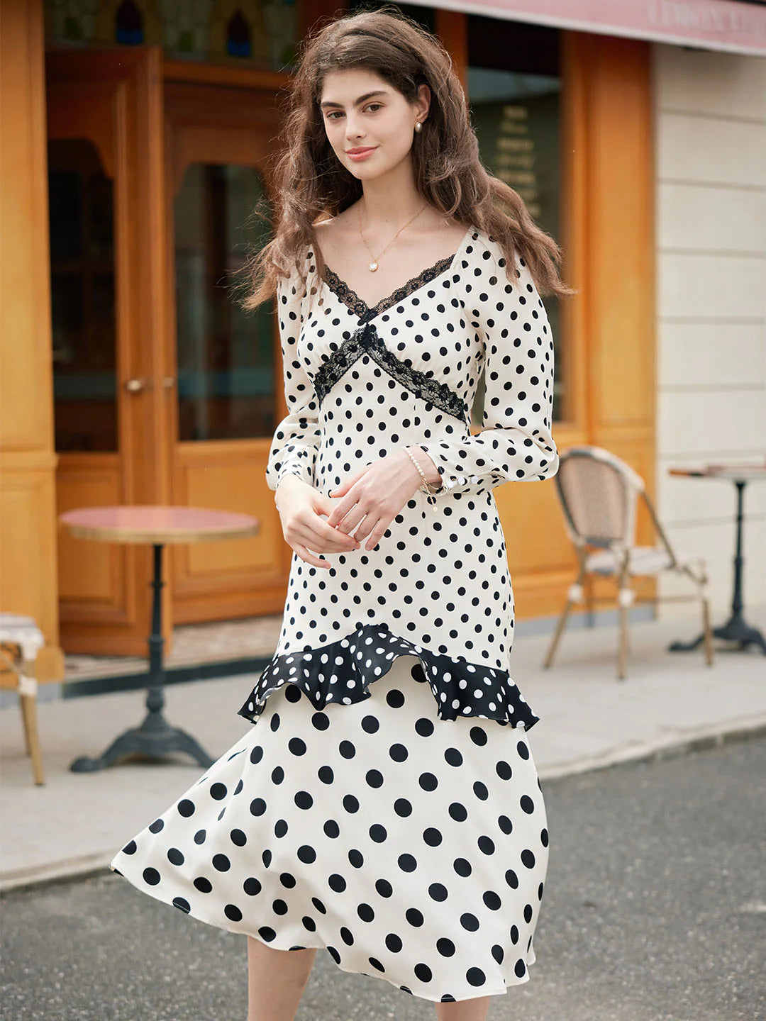 | Detail | Classic black and white polka dots, polka dots jumping to the retro beat, compose a round variation on the body, listening to the rhythm of time; the high-waisted A-line version, improves the waistline, and visually optimizes the proportion of the figure; the elegant V-neck properly exposes the skin, Modified the lines of shoulder and neck, embellished with lace on the collar, exuding romantic and feminine temperament; three types of polka-dot stitching on the skirt, full of layered beauty, and slender figure; the fabric is delicate and soft, comfortable and skin-friendly, light and elegant; lined | |||