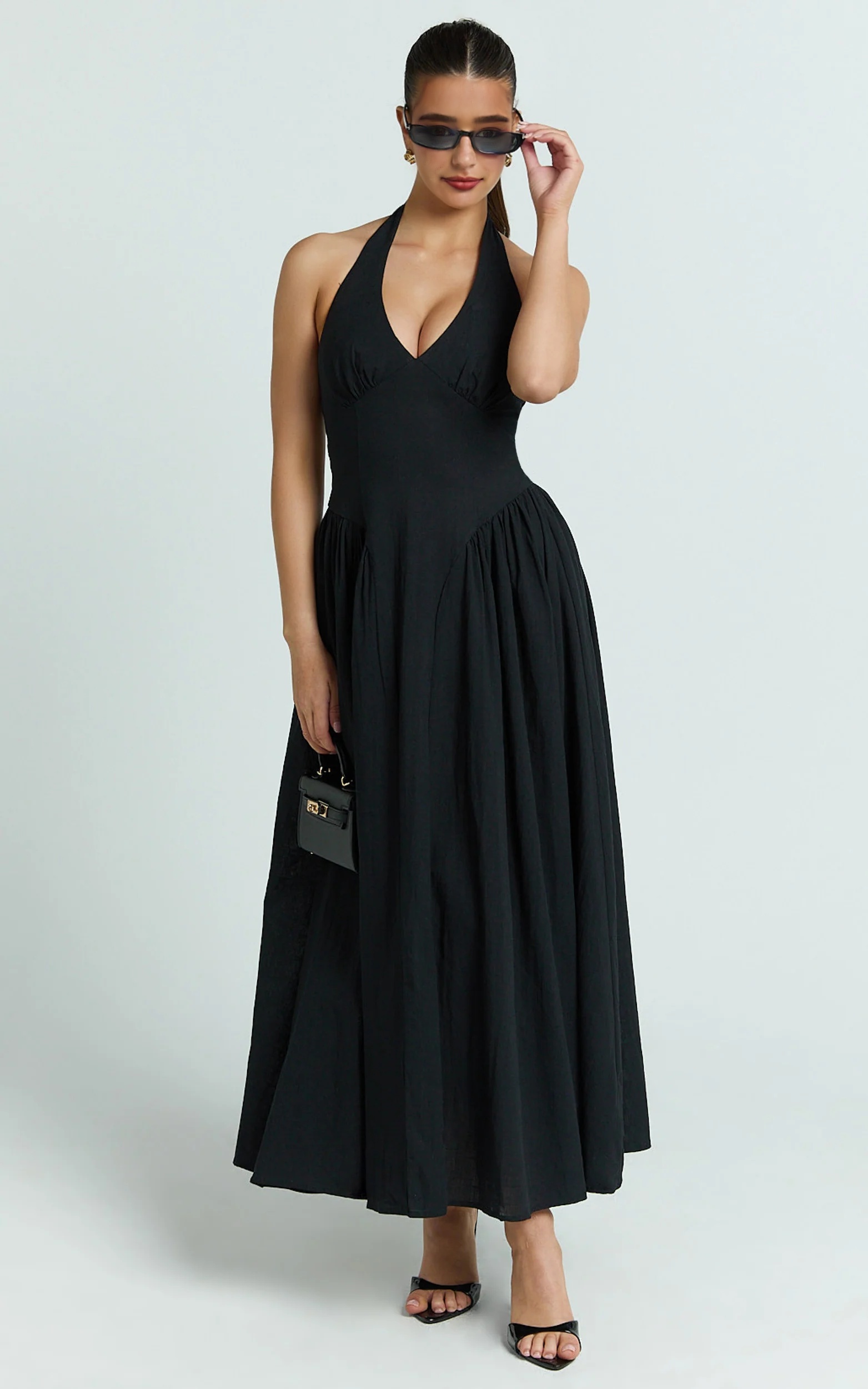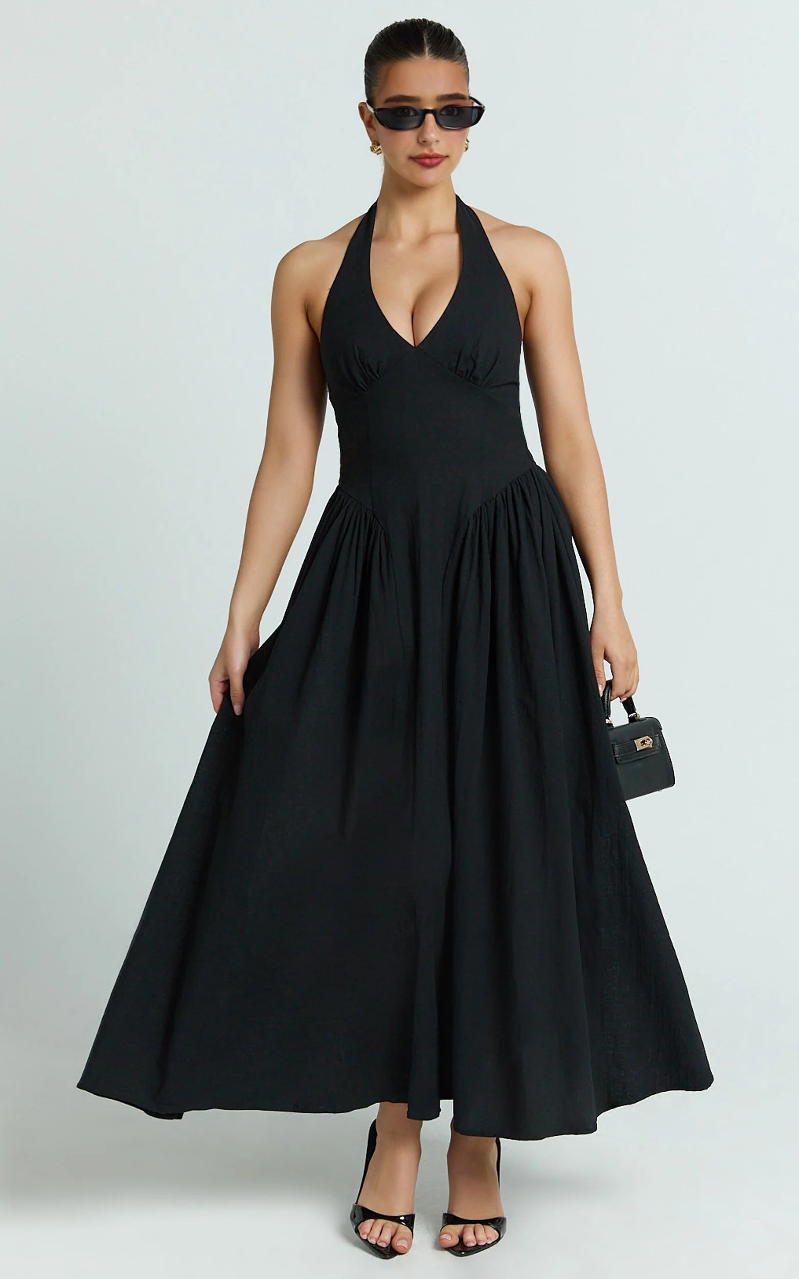 A smooth black design hugs the shoulders, features a charming open back, and flows into a gentle, swaying skirt, ideal for evening outings and romantic dinners. The dropped waistline makes your torso look longer, and the halter tie allows you to adjust the fit for a comfortable and secure feeling. It's the kind of dress that looks elegant with little effort.