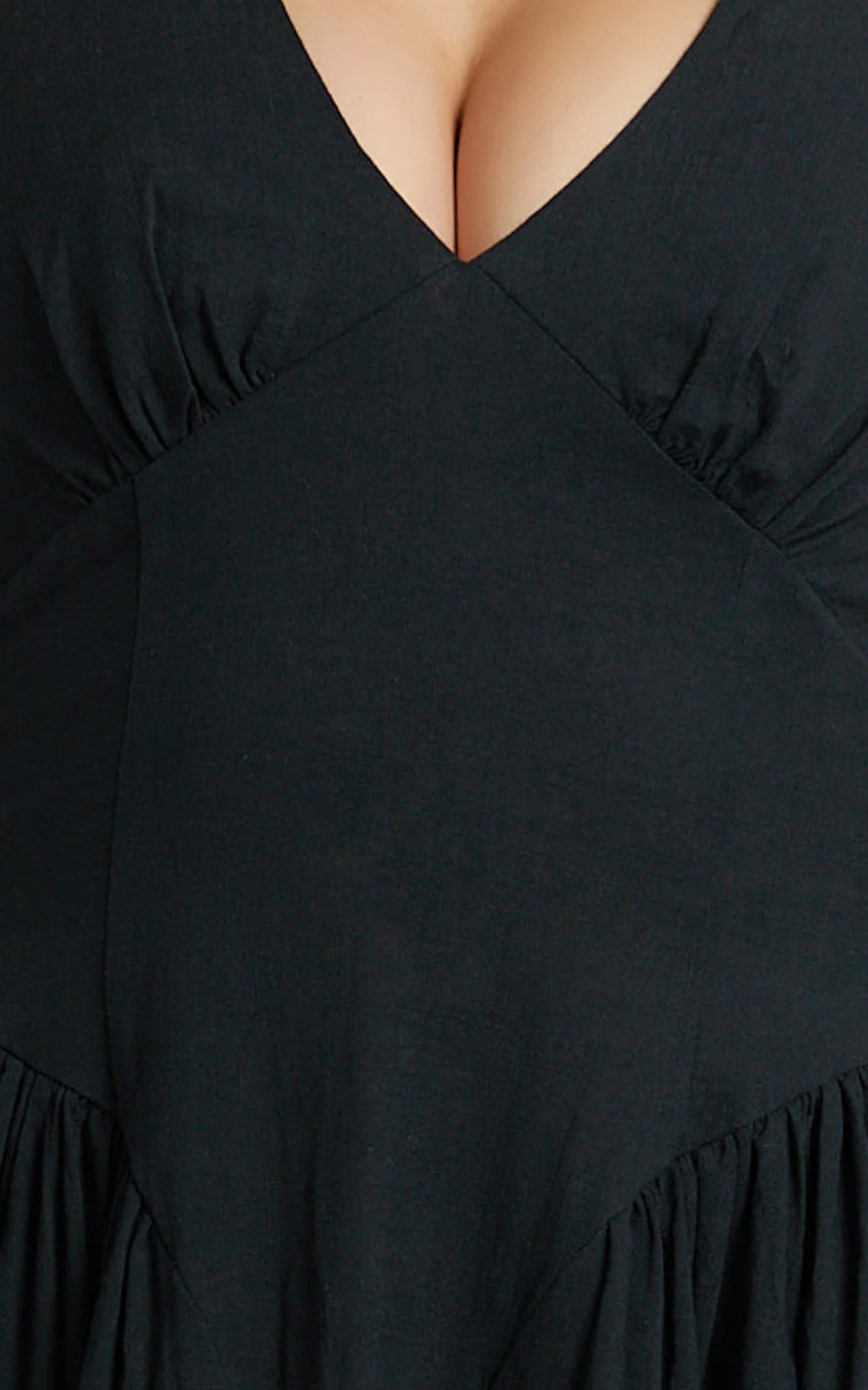 This black midi dress is a great choice for special occasions. Pair it with patent leather pumps for a shiny look and wear shield sunglasses on the way to add an air of mystery. From cocktail parties to art gallery events, this dress goes well with all your favorite items and looks amazing in photos.