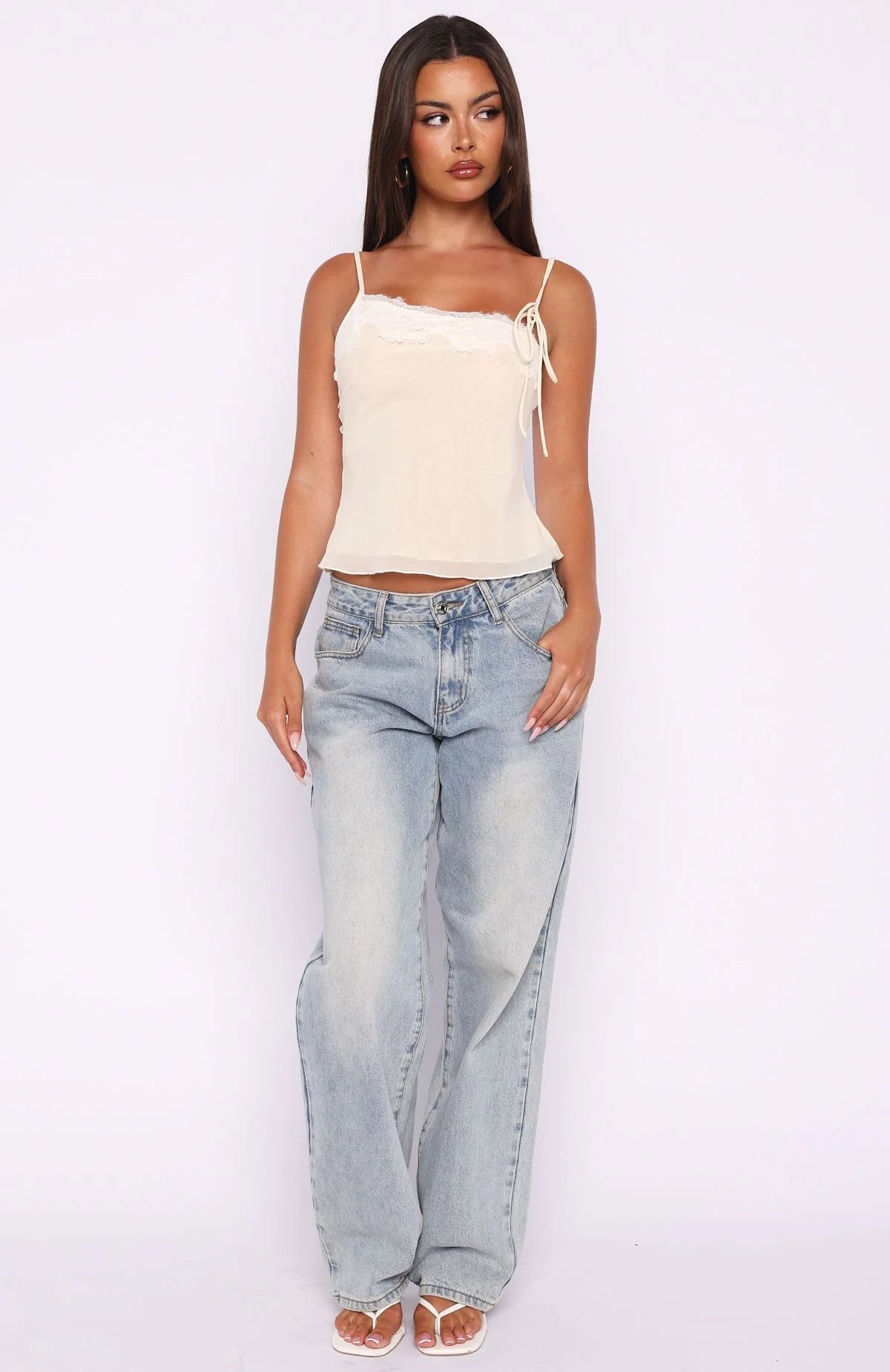 Made to be seen, remembered, and talked about. The Blissfully Bold Lace Cami Top Cream features thin, adjustable shoulder straps, an asymmetrical neckline with lace detailing, lined material, lettuce hem design and side self tie detailing at bust. Pair with the low rise jeans and layered gold accessories!