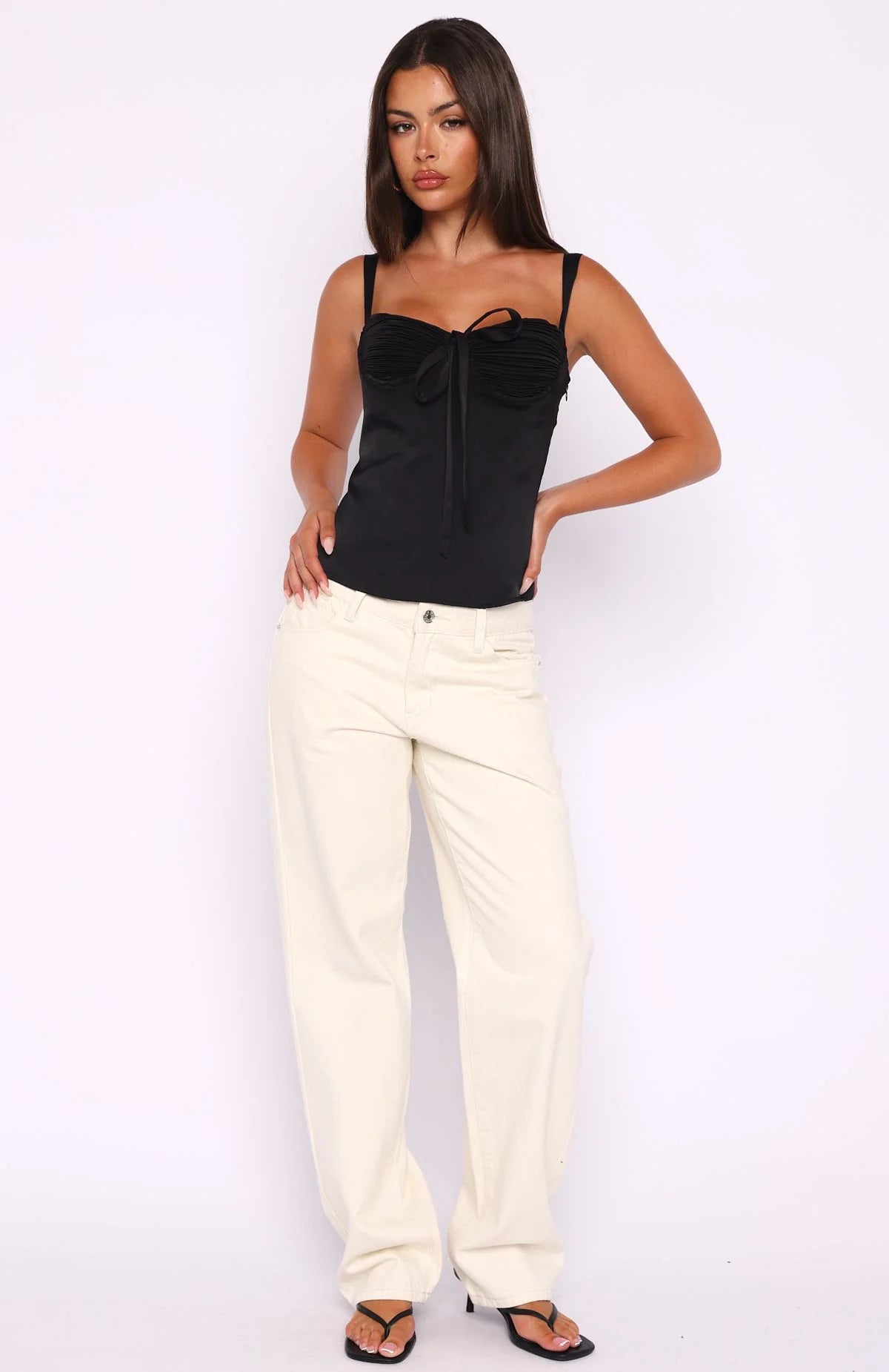 Love is in the air with our Blushing Belle Top in Black! Featuring a sweetheart neckline with front bow detailing, thick adjustable shoulder straps, figure hugging design, underwire at bust and invisible side zipper and clasp closure. Pair with low rise jeans and a shoulder bag for a look we adore!