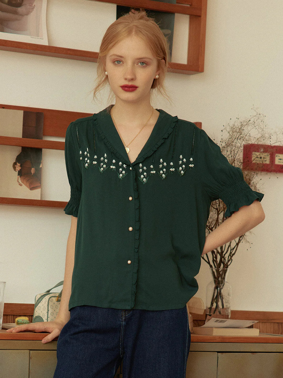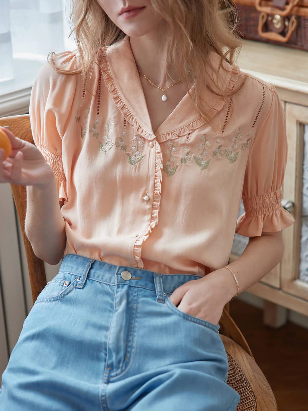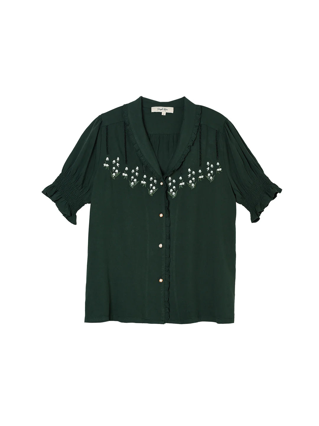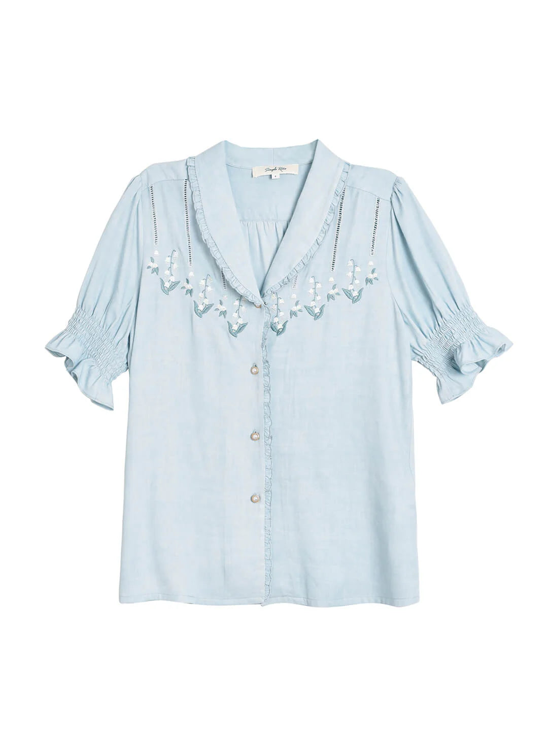 | Detail | Ruffled Shawl Collar , Lily of the Valley Embroideries, Puff Sleeves, Elastic Cuffs |