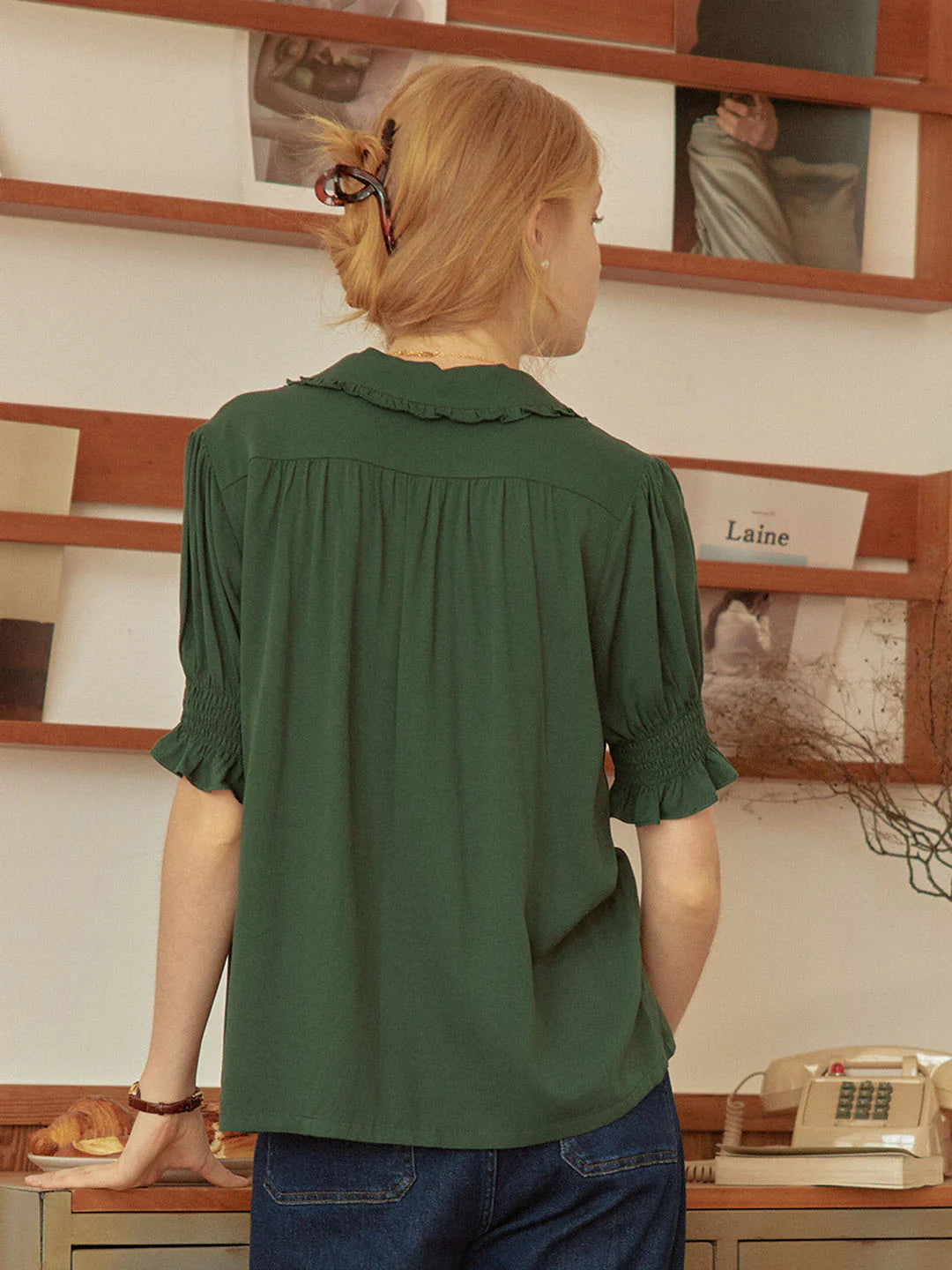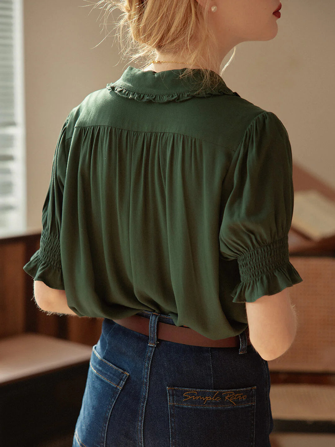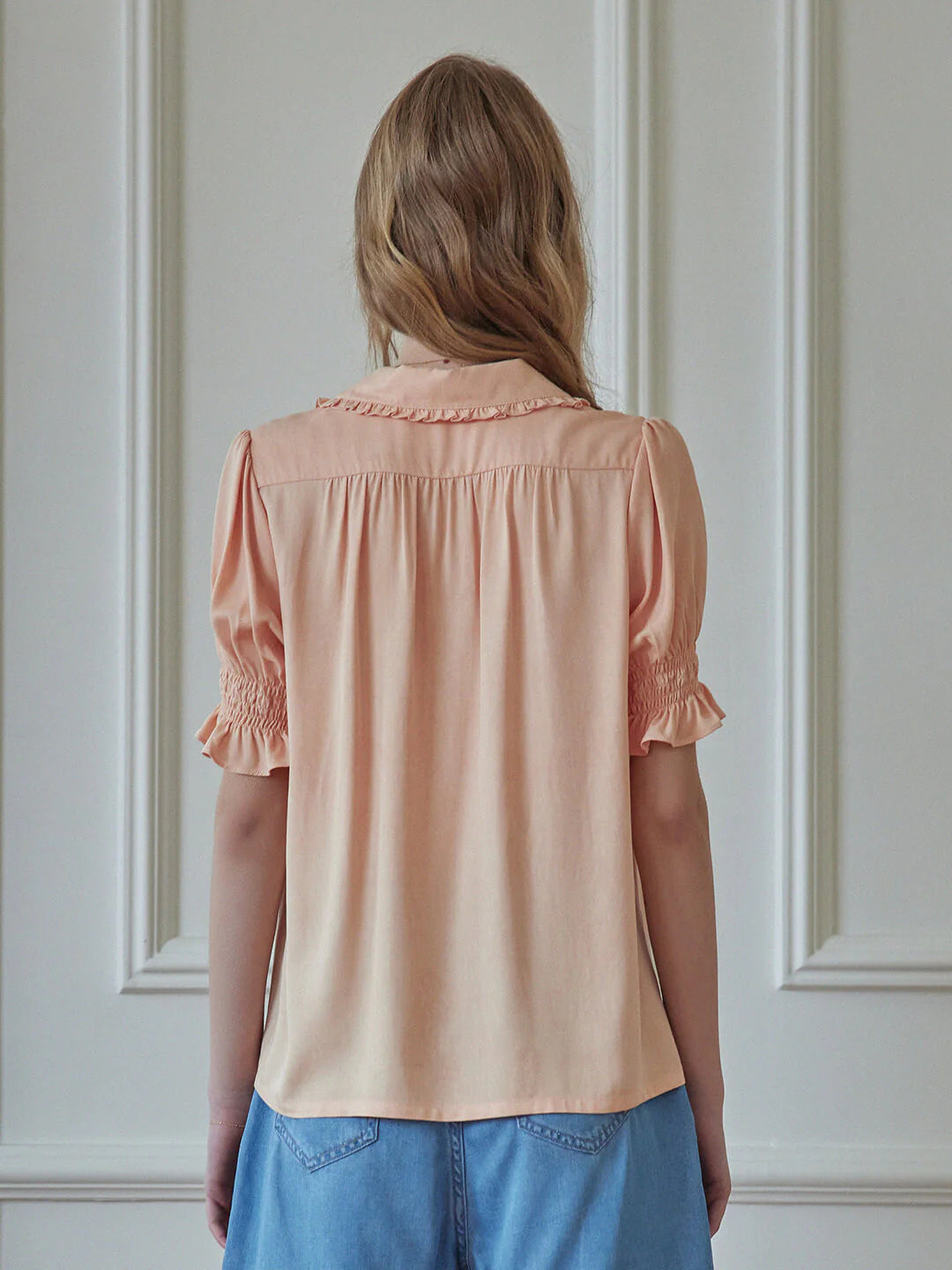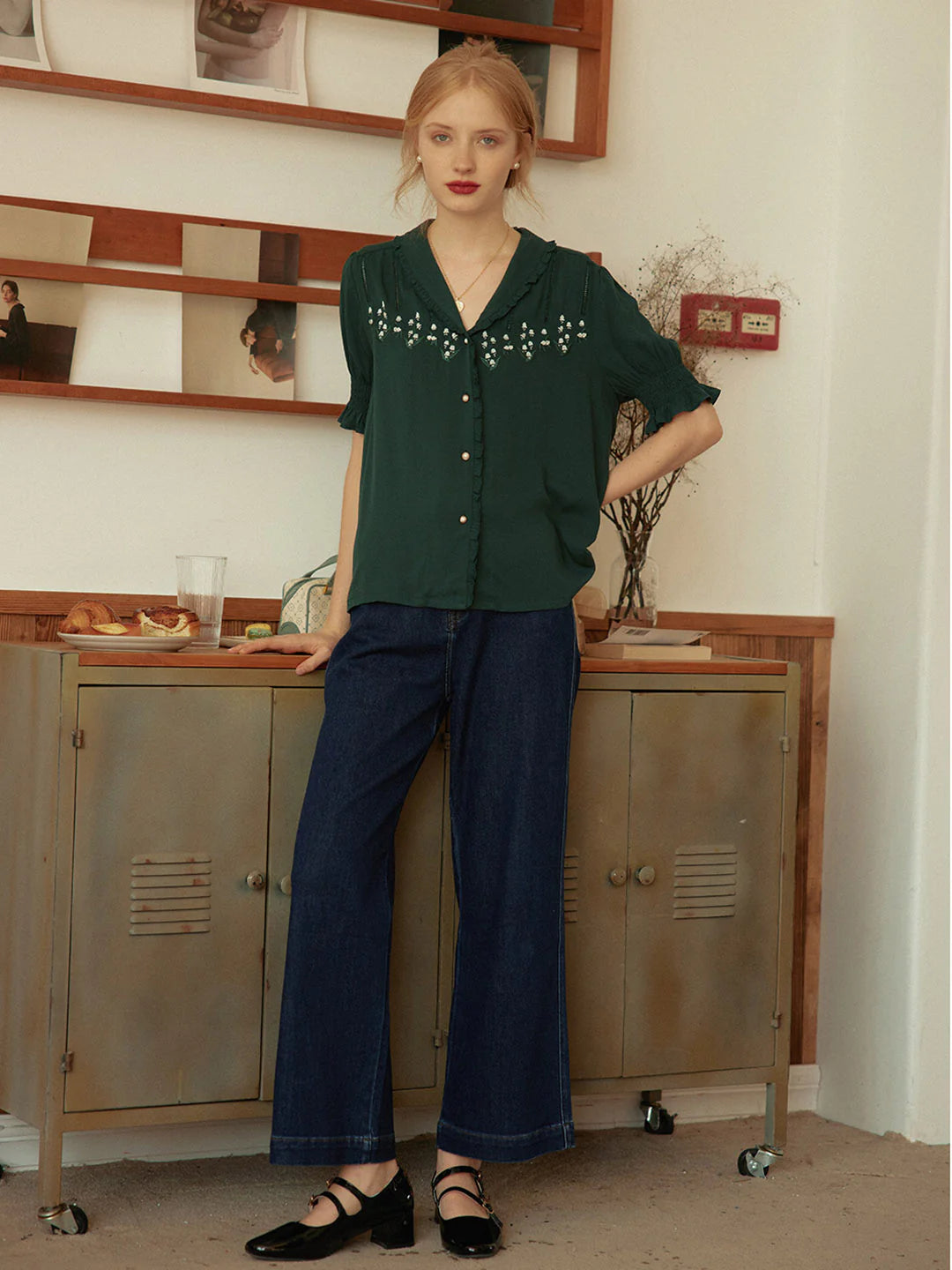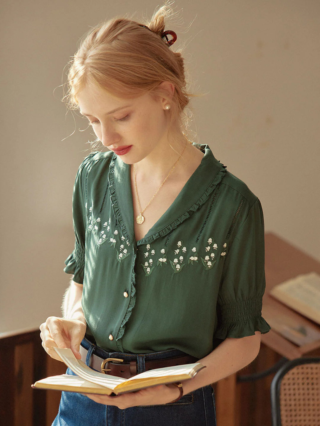 | Detail | Ruffled Shawl Collar , Lily of the Valley Embroideries, Puff Sleeves, Elastic Cuffs |