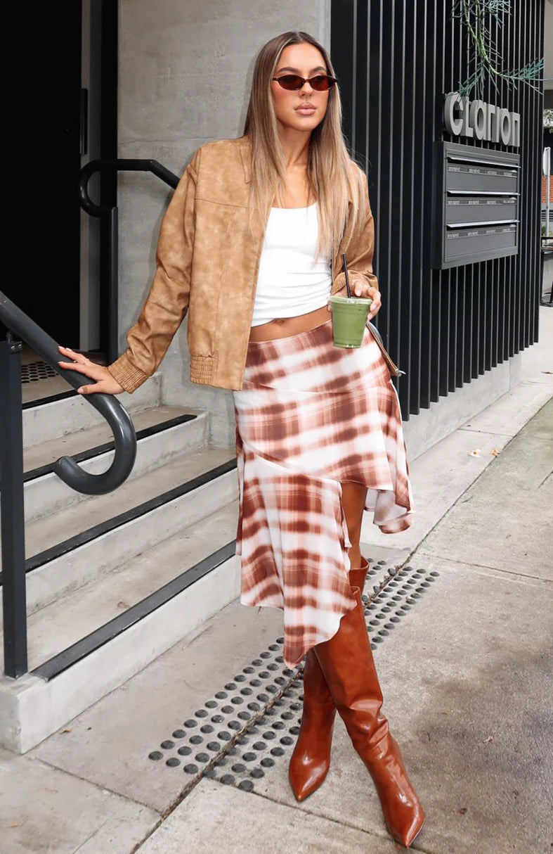 The Crazy Romantic Midi Skirt in Chocolate Plaid is the summer wardrobe essential you will reach for time and time again! Features a balanced asymmetrical silhouette for dimension, invisible zipper with hook and eye closure and lined. Enhance the romantic feeling by pairing with a basic tank and sandals.