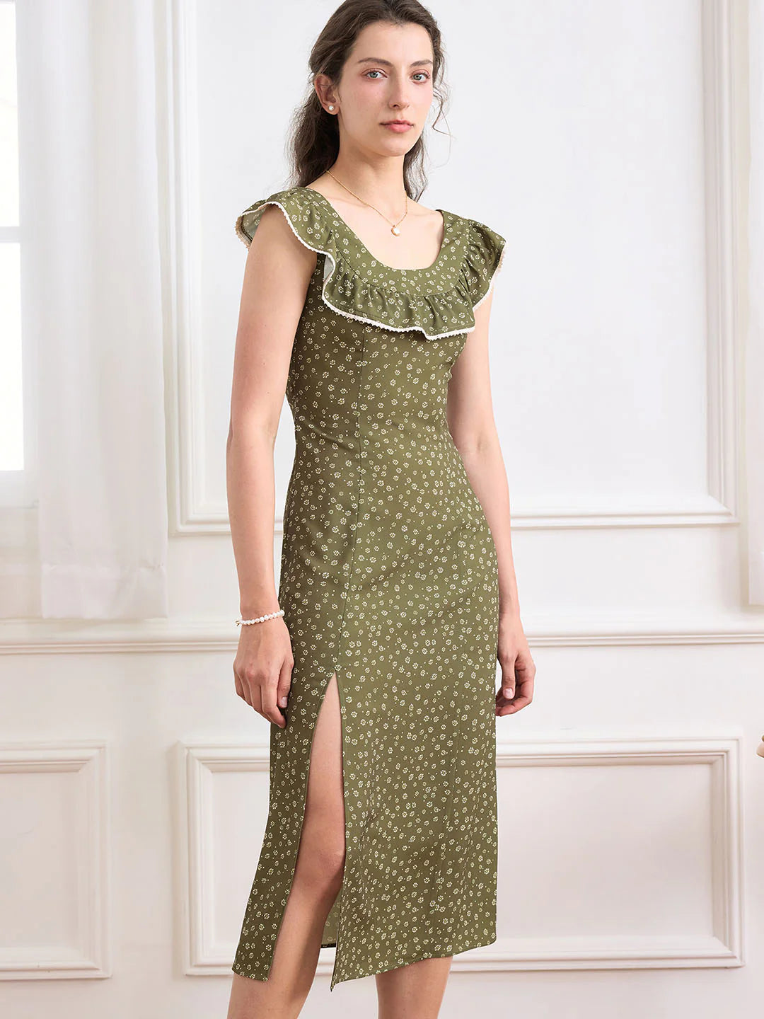 Details: Ruffle, Contrast Lace, Zipper, Split Thigh