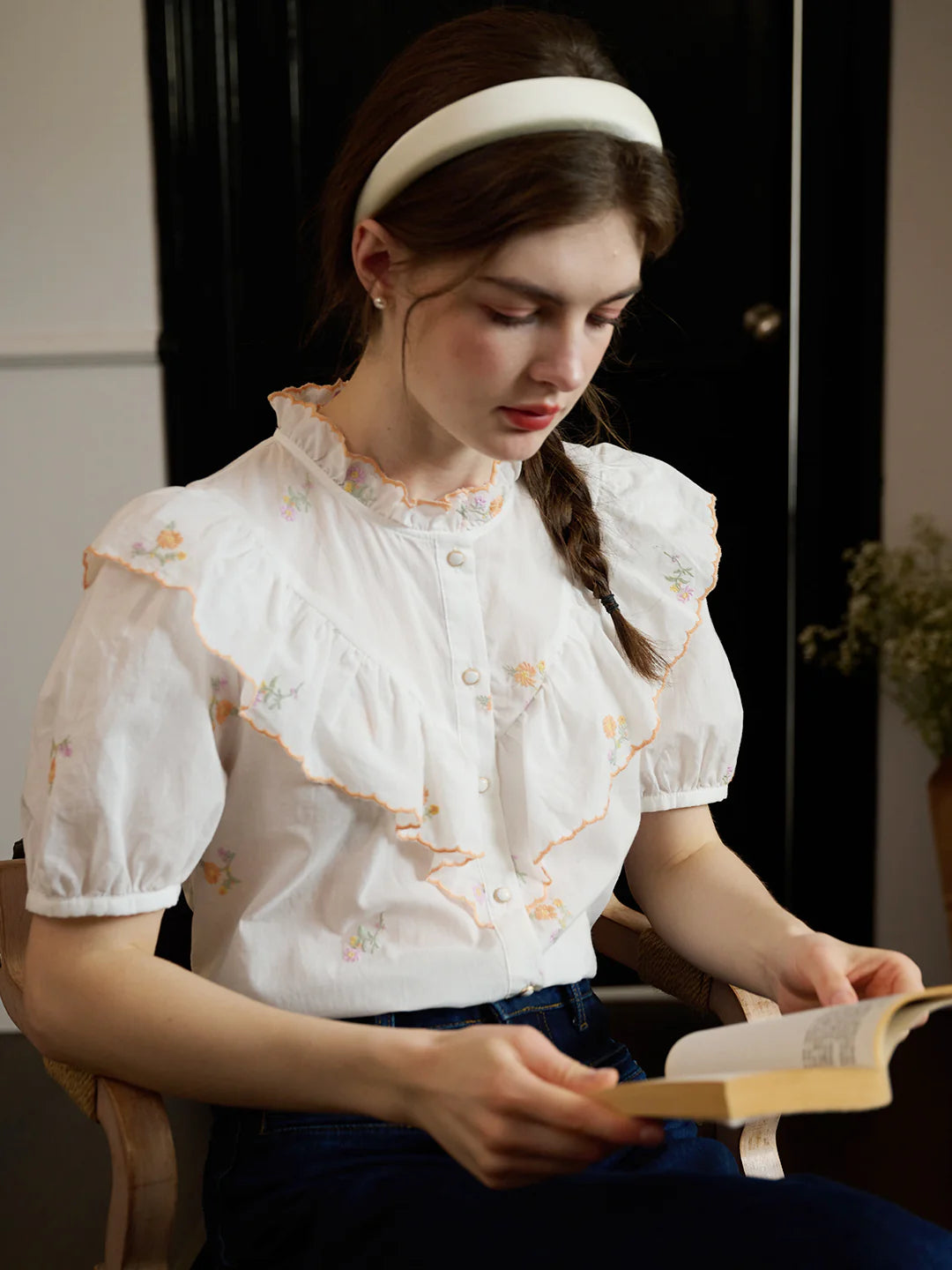 | Detail | The classic H-shaped silhouette is suitable for a variety of body shapes; the retro lotus leaf collar pays homage to the classics and highlights the artistic taste of the minority; the puff sleeve design modifies the arm line; embellished with retro metal buckles, exquisite small details; exquisite all-over daisy embroidery, fresh and sweet, full of romantic atmosphere; the fabric is delicate and comfortable, light and breathable | |||