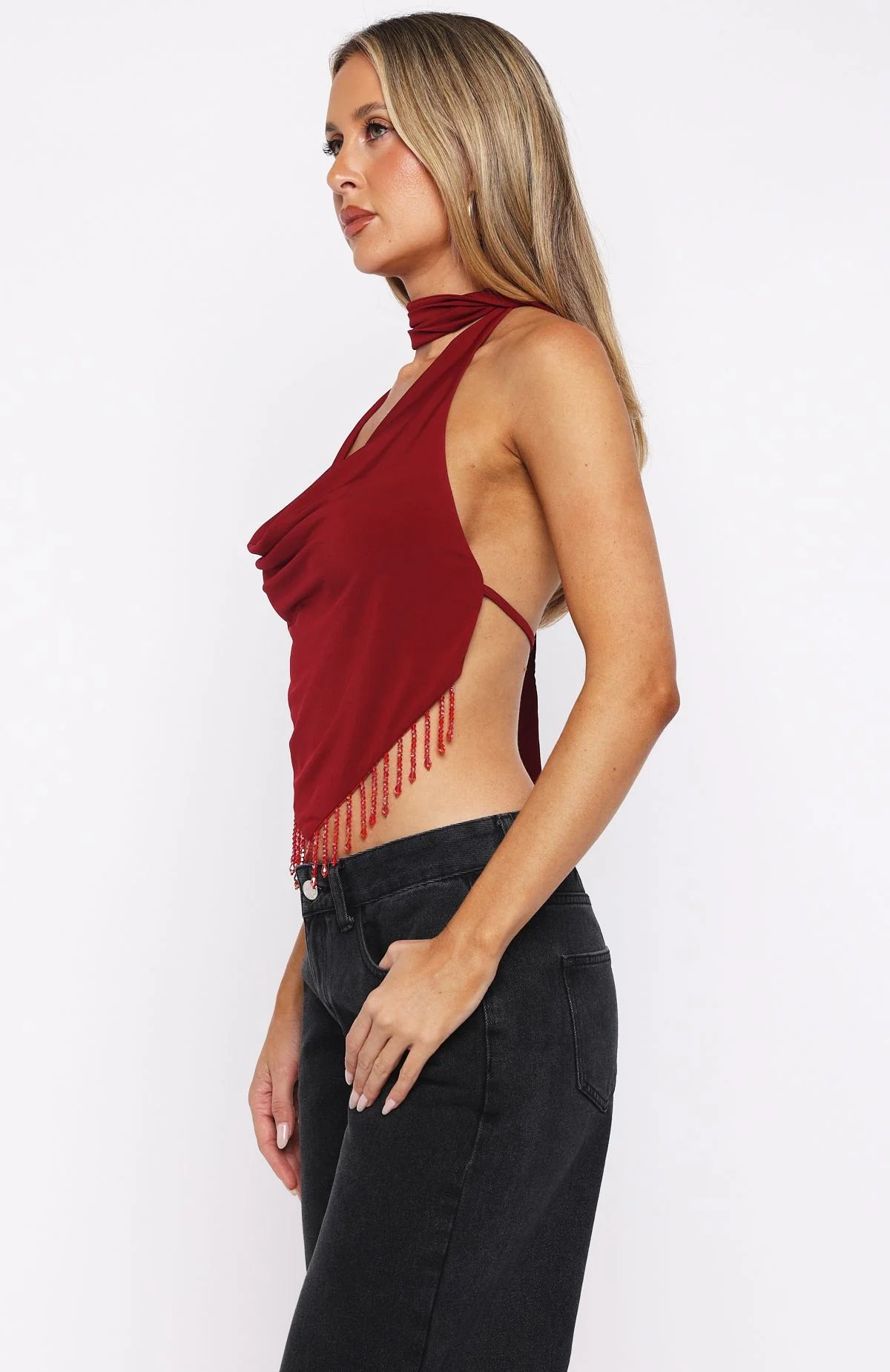 Summer lovin’ in the Eyes For You Halter Top in Dark Red. This standout piece features adjustable halter straps and a flattering cowl neckline for soft, draped style. A matching adjustable fixed back strap ensures a perfect fit. The design is finished with a beaded hemline for subtle sparkle, high-stretch fabrication, a fully lined interior, and a chic detached neck scarf. Style with low rise jeans and high shine accessories for a show stopping look!