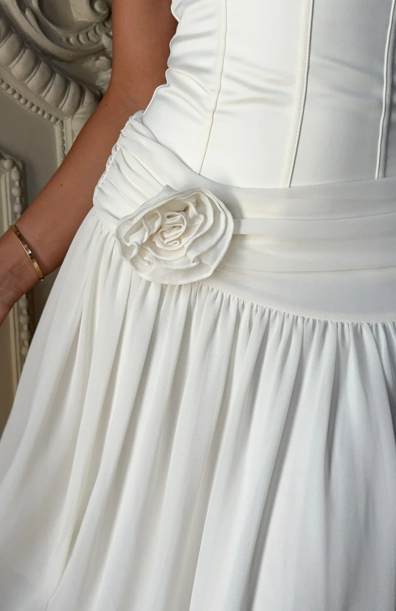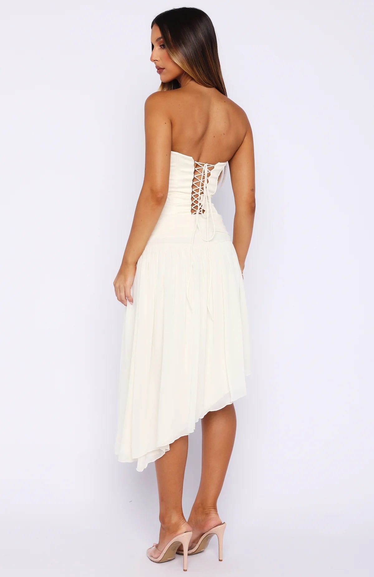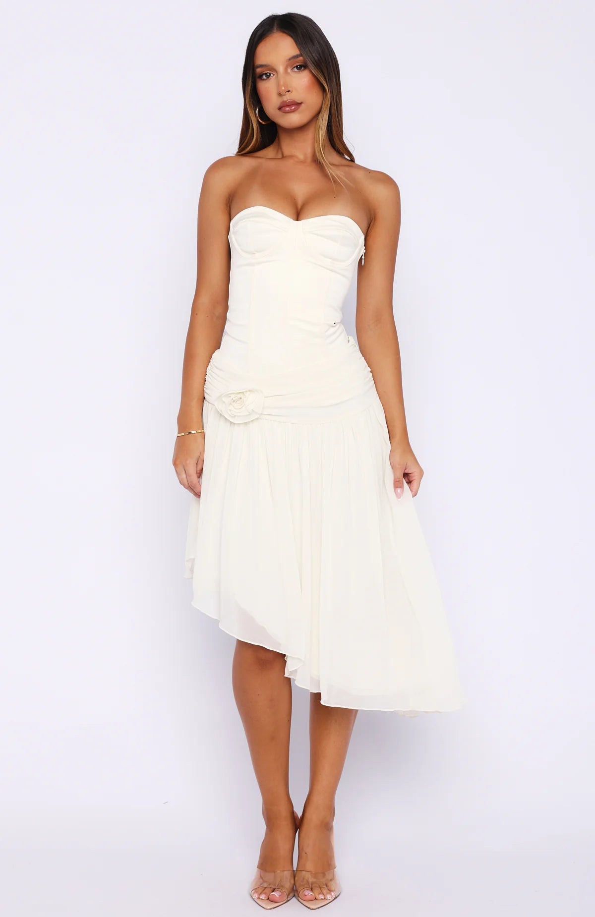 Warning: our Forever Love Midi Skirt Off White may cause excessive compliments! Featuring a thin elasticated waistband with side ruched detailing and flower embellishment, fully lined material, asymmetrical hemline and invisible side zipper and clasp closure. This midi pairs perfectly with our Forever Love Strapless Bustier Off White!