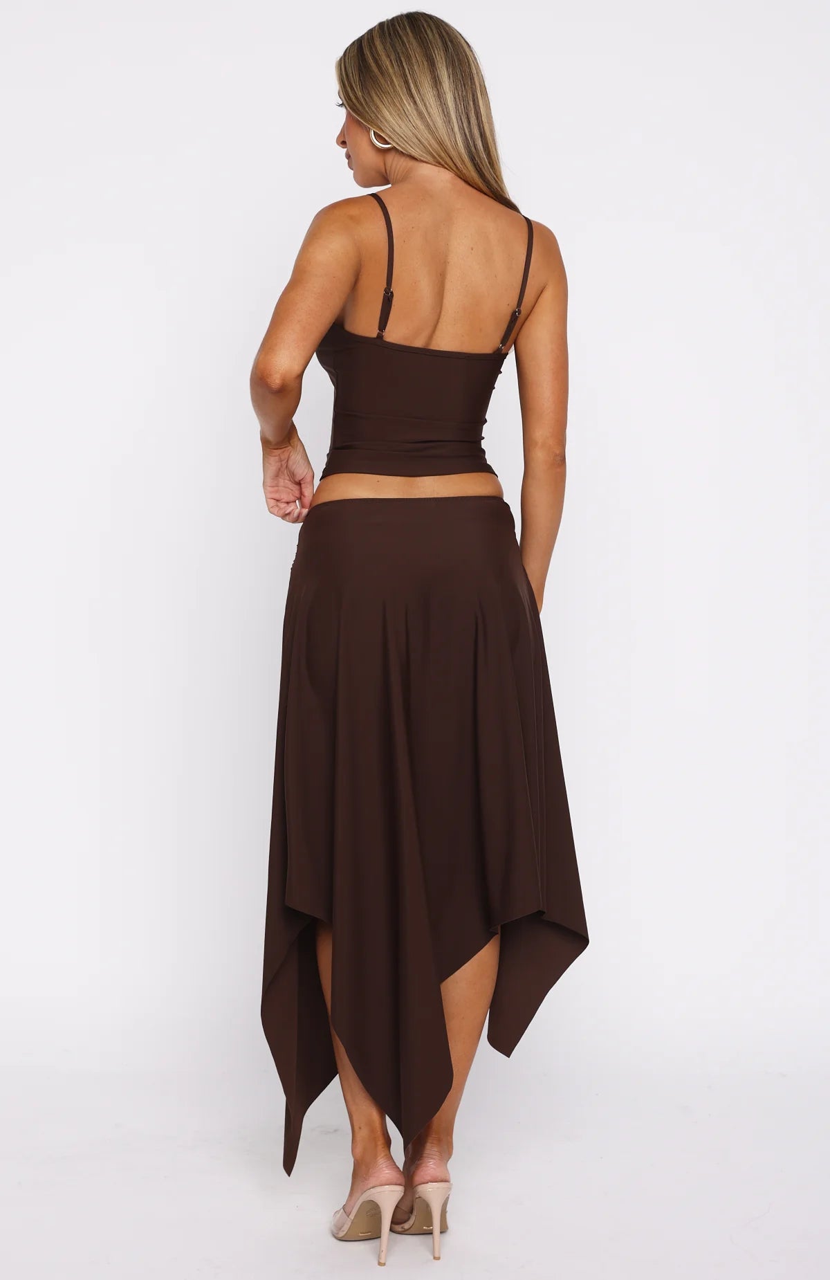 Meet the Free All Night Midi Skirt in Chocolate, your effortless summer staple. Designed for breezy wear, it features a slim elastic waistband with a sash tie, soft stretch fabric, elegantly offset by an asymmetrical hemline that brings modern movement. Pair with the Lifetime Top for sun-soaked days and balmy evenings alike.