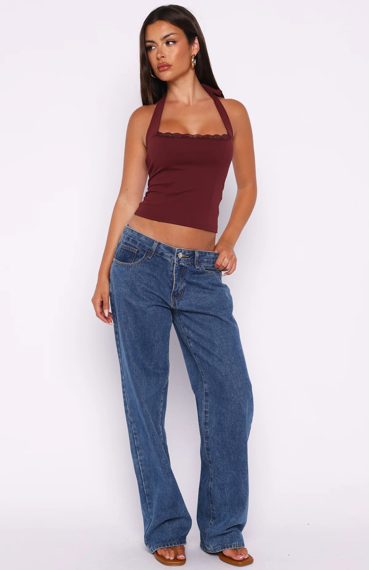 Golden girl vibes in the Good Feels Halter Top in Burgundy, featuring thick self‑tie halter straps, a chic square neckline with delicate lace trim and a fitted silhouette in high‑stretch, unlined fabrication for a sleek fit. Style it with denim or a skirt and your favourite accessories for a sun‑soaked, feminine look.