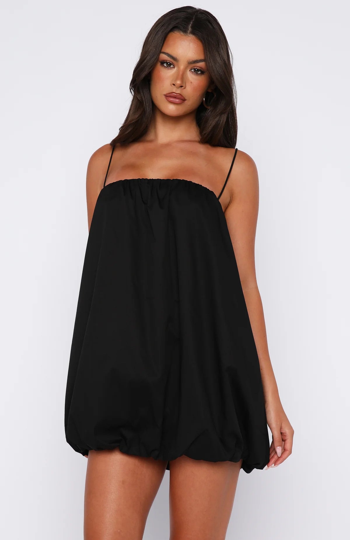 Echoes of summer with the Gravity Lost Mini Dress in Black. This flirty silhouette features adjustable shoulder straps for a custom fit, a softly elasticised neckline and hem that create a charming bubble shape, and a fully lined design. Pair it with chic kitten heels and layered gold jewellery for a sun‑soaked, stylish look.