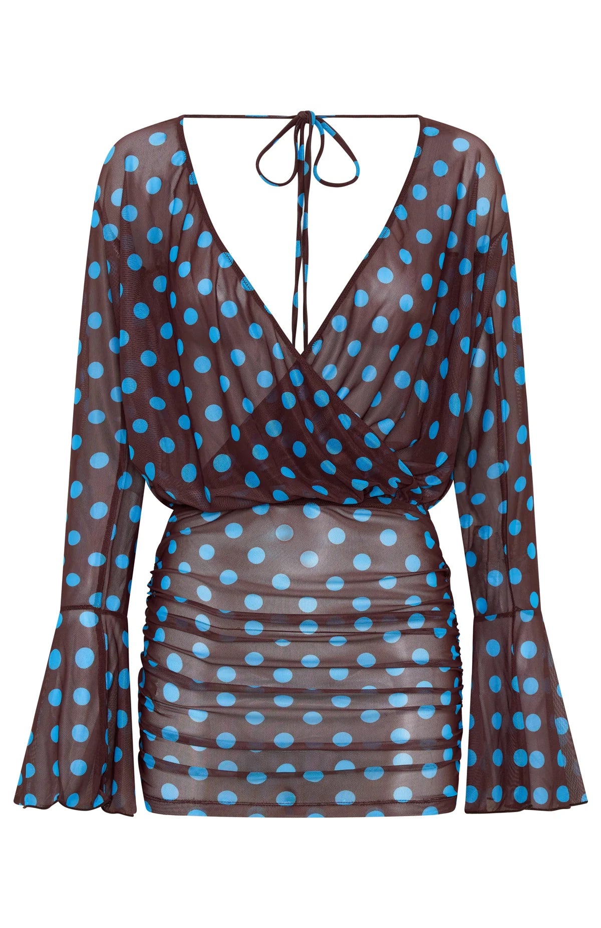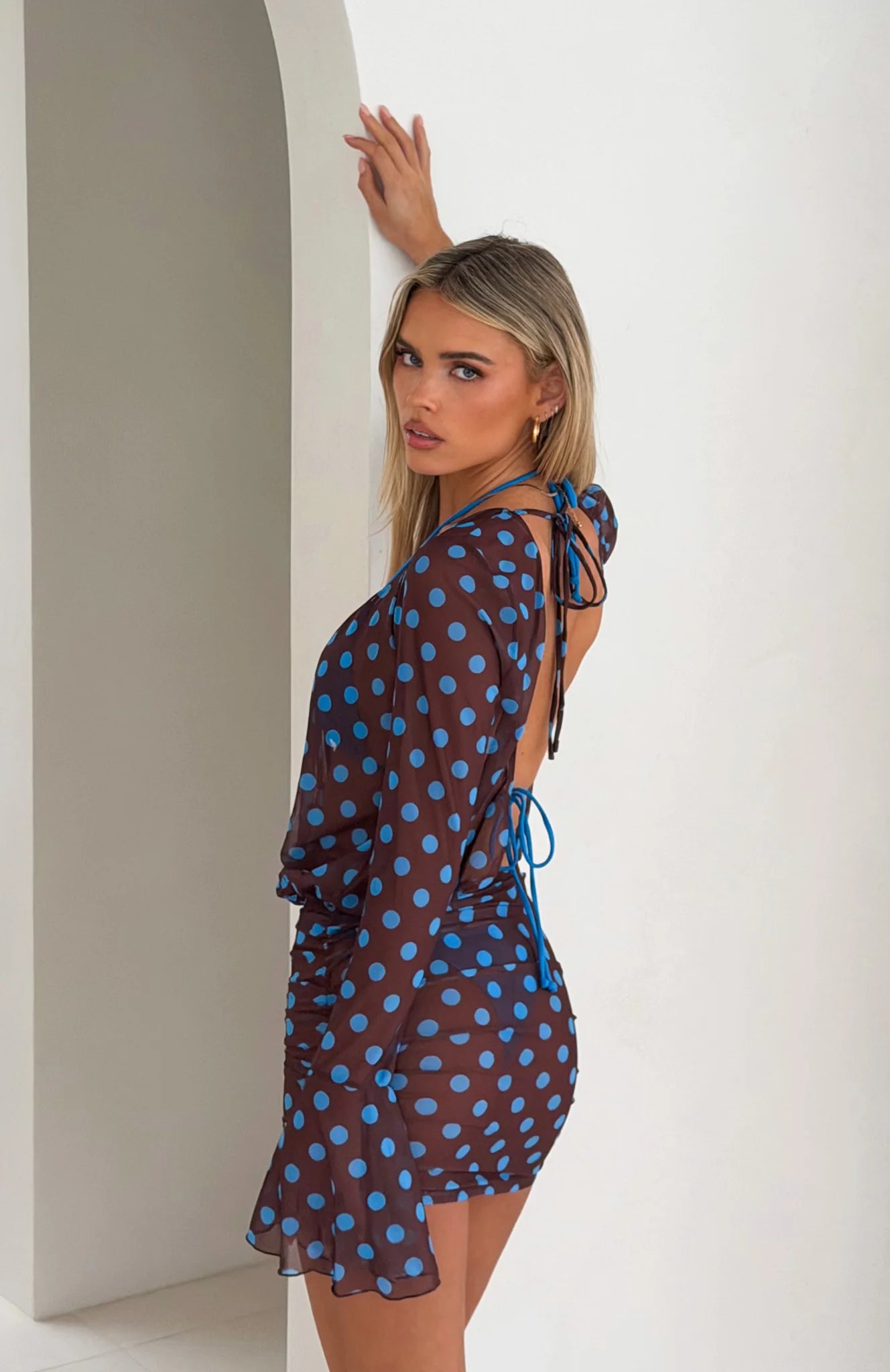 Heat wave season calls for the Half Moon Long Sleeve Mini Dress in Choc & Blue Polka Dot, featuring a sultry plunge neckline, long sleeves with frill cuffs and a fitted waist that flatters the figure. The open back with self-tie straps and sheer fabrication adds breezy, playful movement, while ruching along the skirt side creates soft texture. Style it with a matching bikini and sandals for a chic, sun-soaked look.