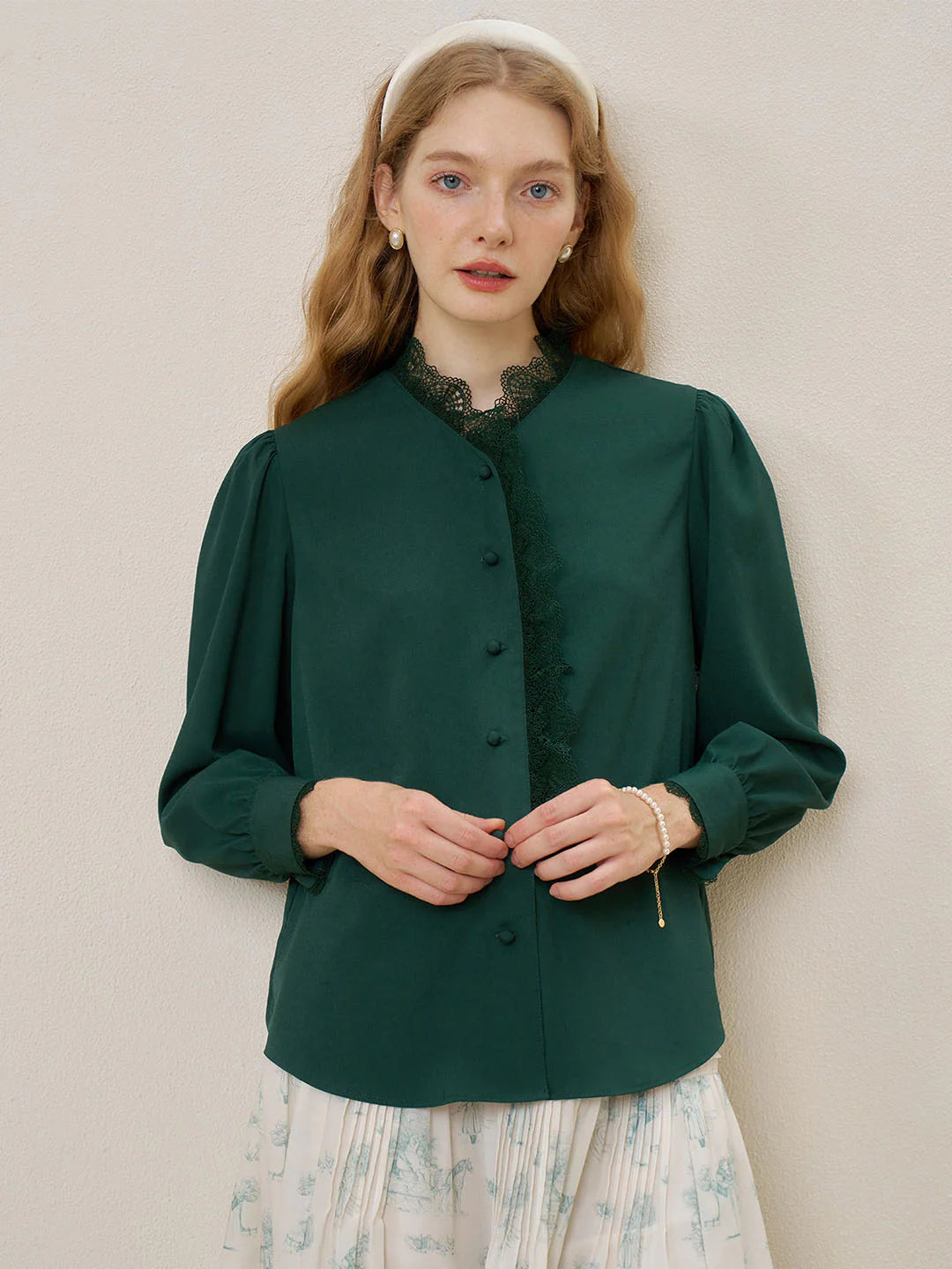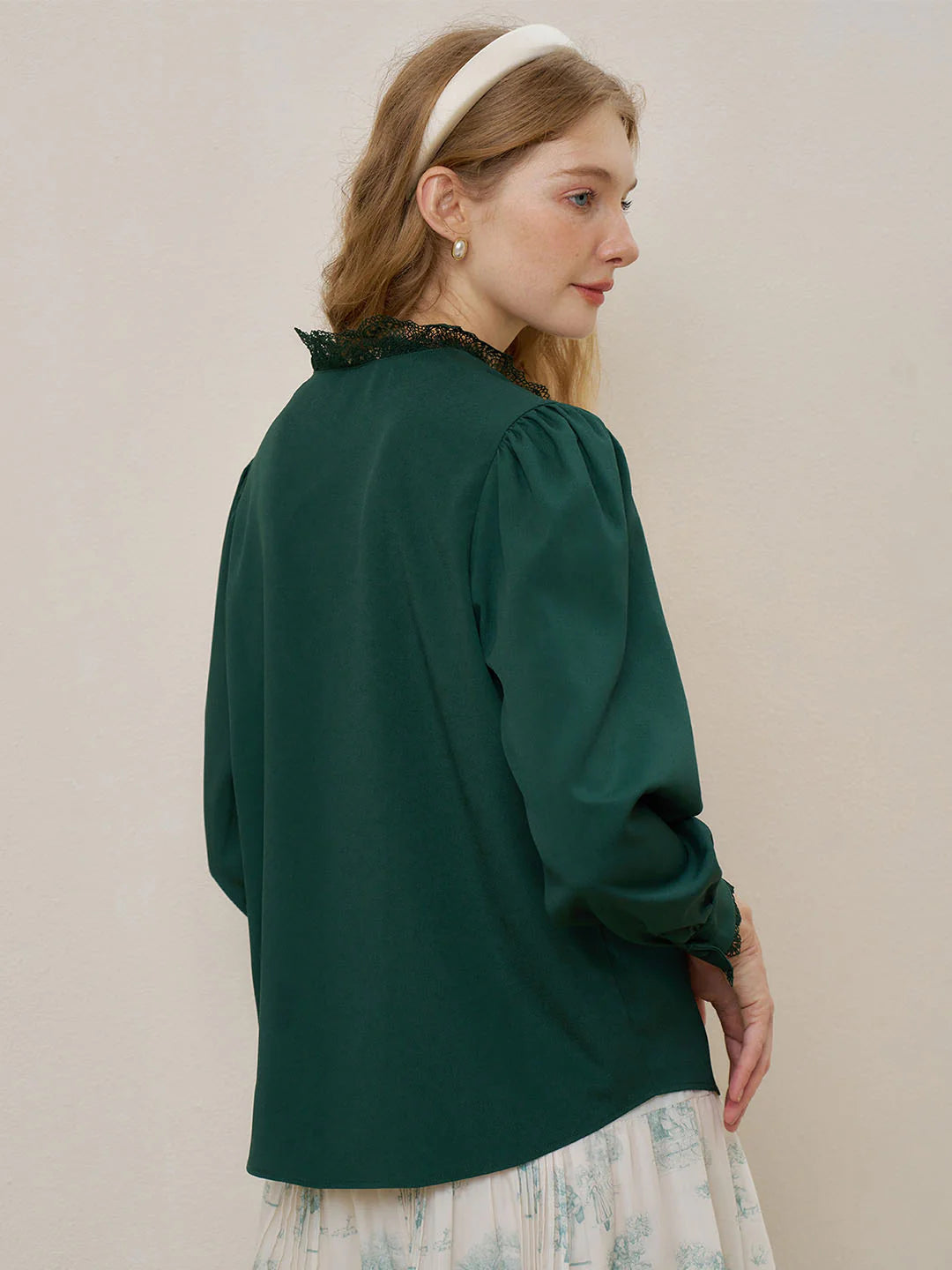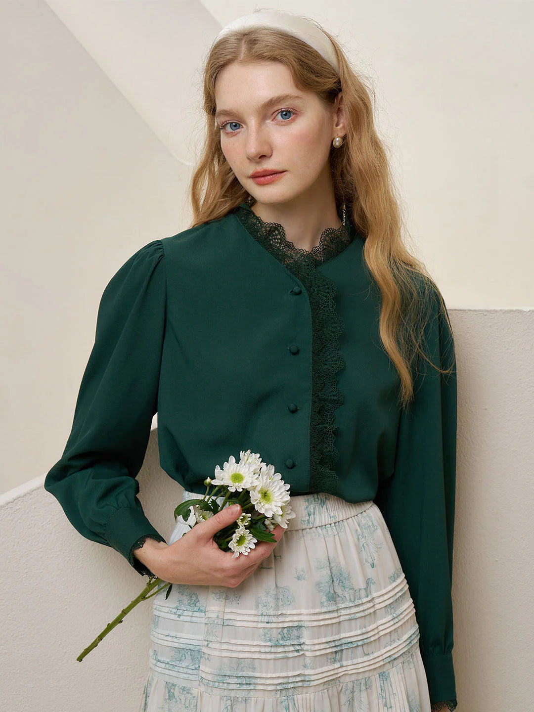 | Detail | Lace collar and placket; Two layers of openwork lace; Pearl buttons |