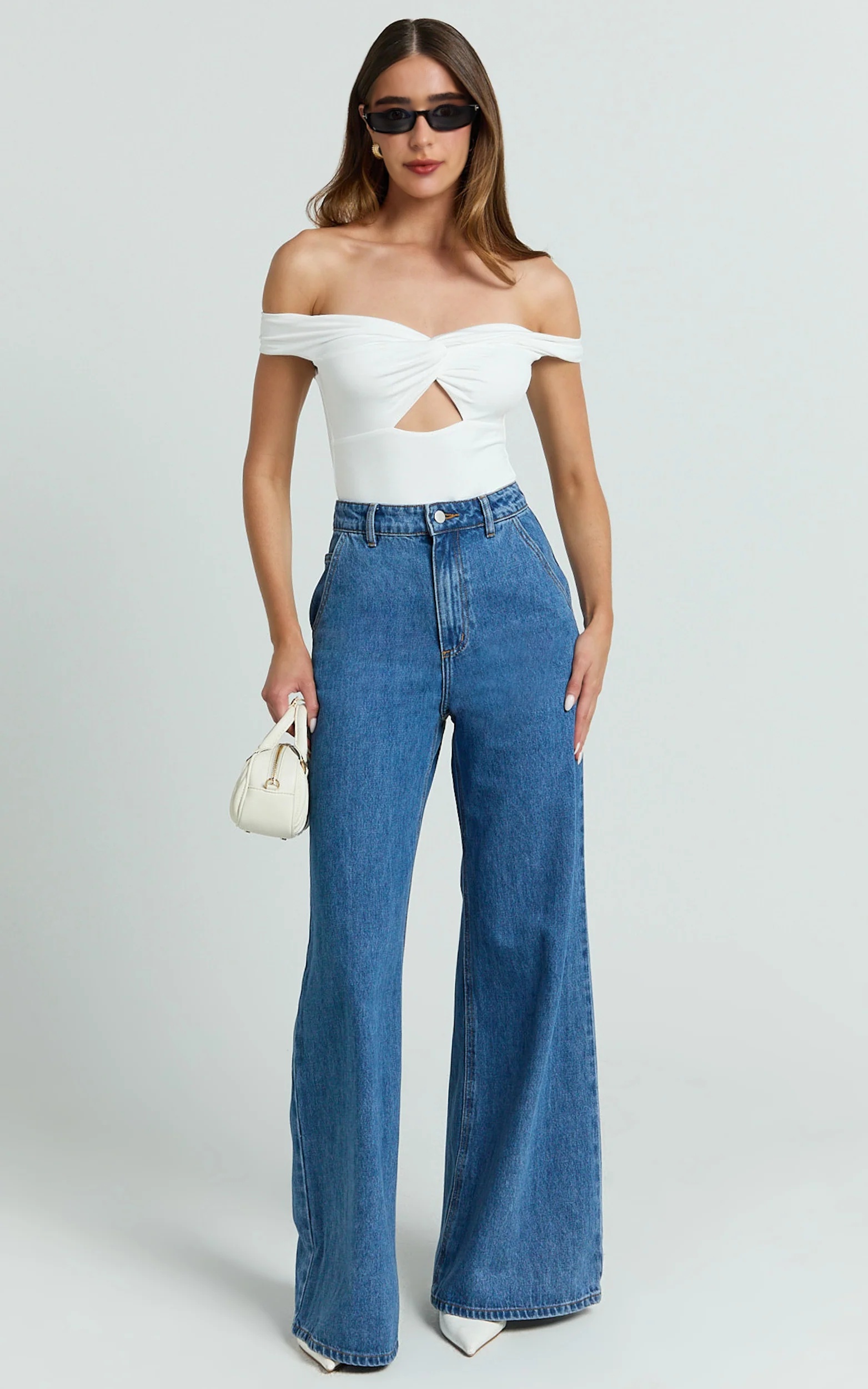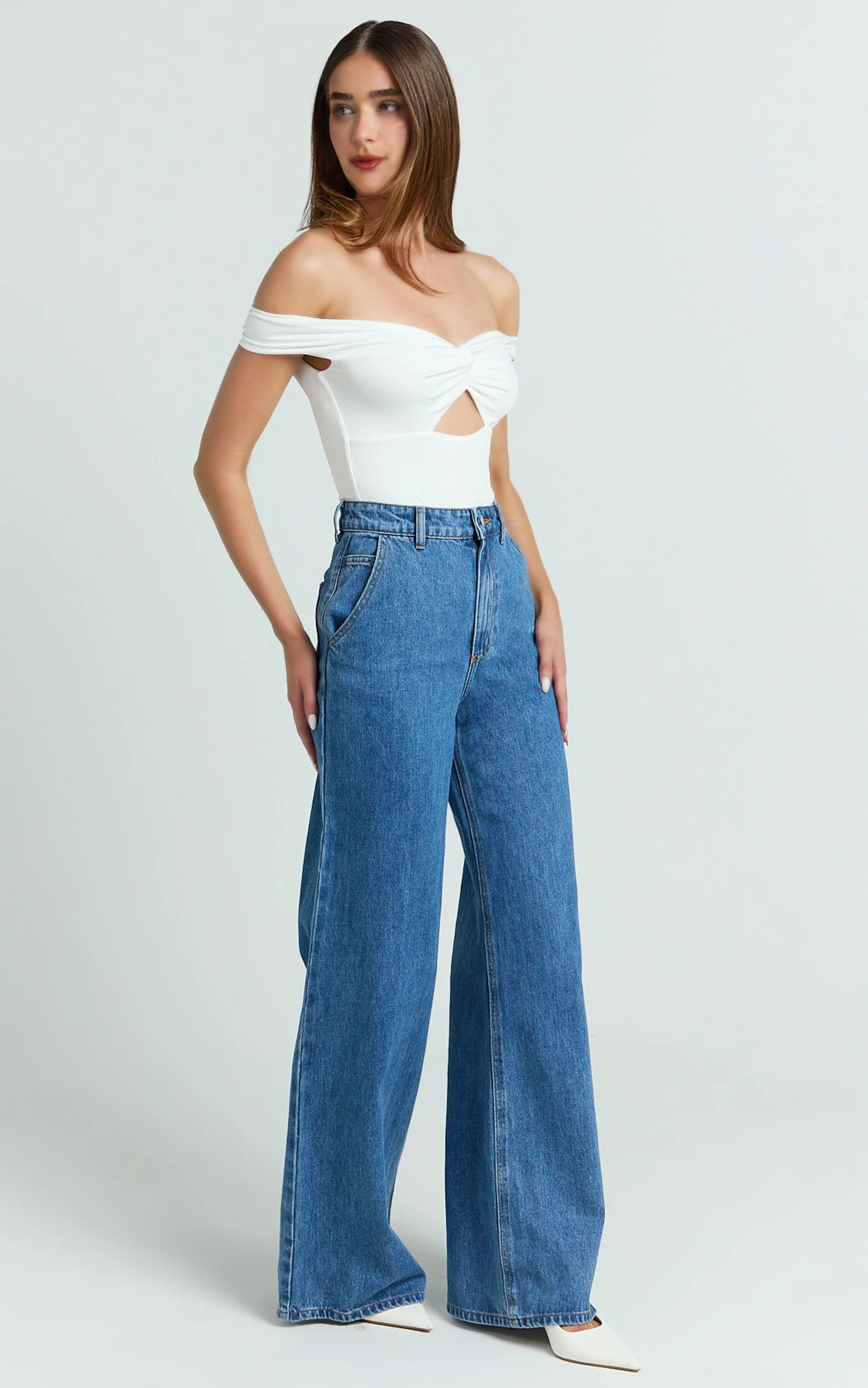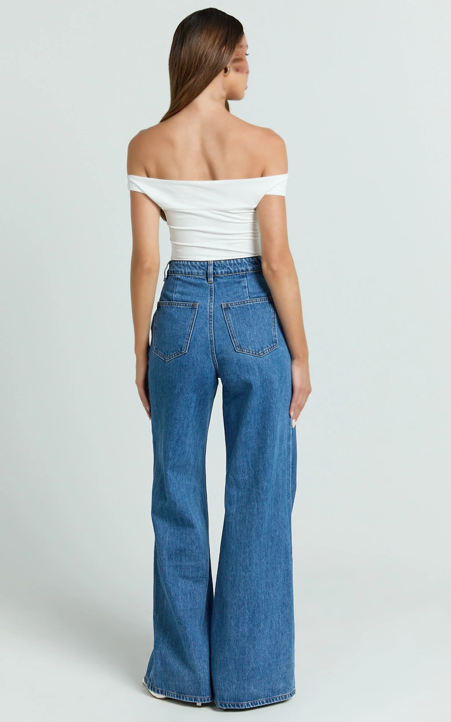 The jeans are snug at the waist, loose from the legs down, and feature a flowing hem that can easily cover heels or sneakers. Made from recycled denim, they are an essential item you'll wear again and again.