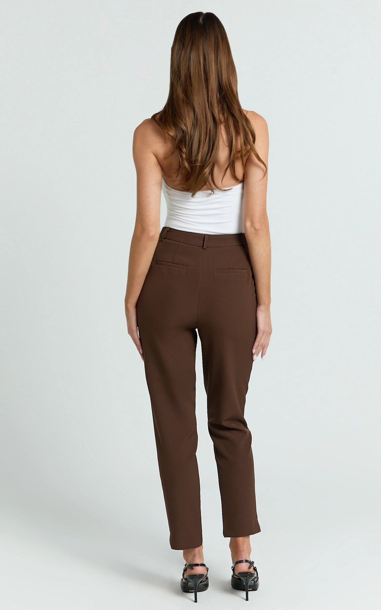 These pants in rich brown add a touch of sophistication to daily outfits. Brown is a versatile neutral color that can be paired with tonal clothing or a bright top for a pop of color. Style them with a fitted tank and oversized sunglasses for a minimalist street style, or add a sheer shirt for a similar aesthetic without the transparency. They are easy to dress up and comfortable for repeated wear.