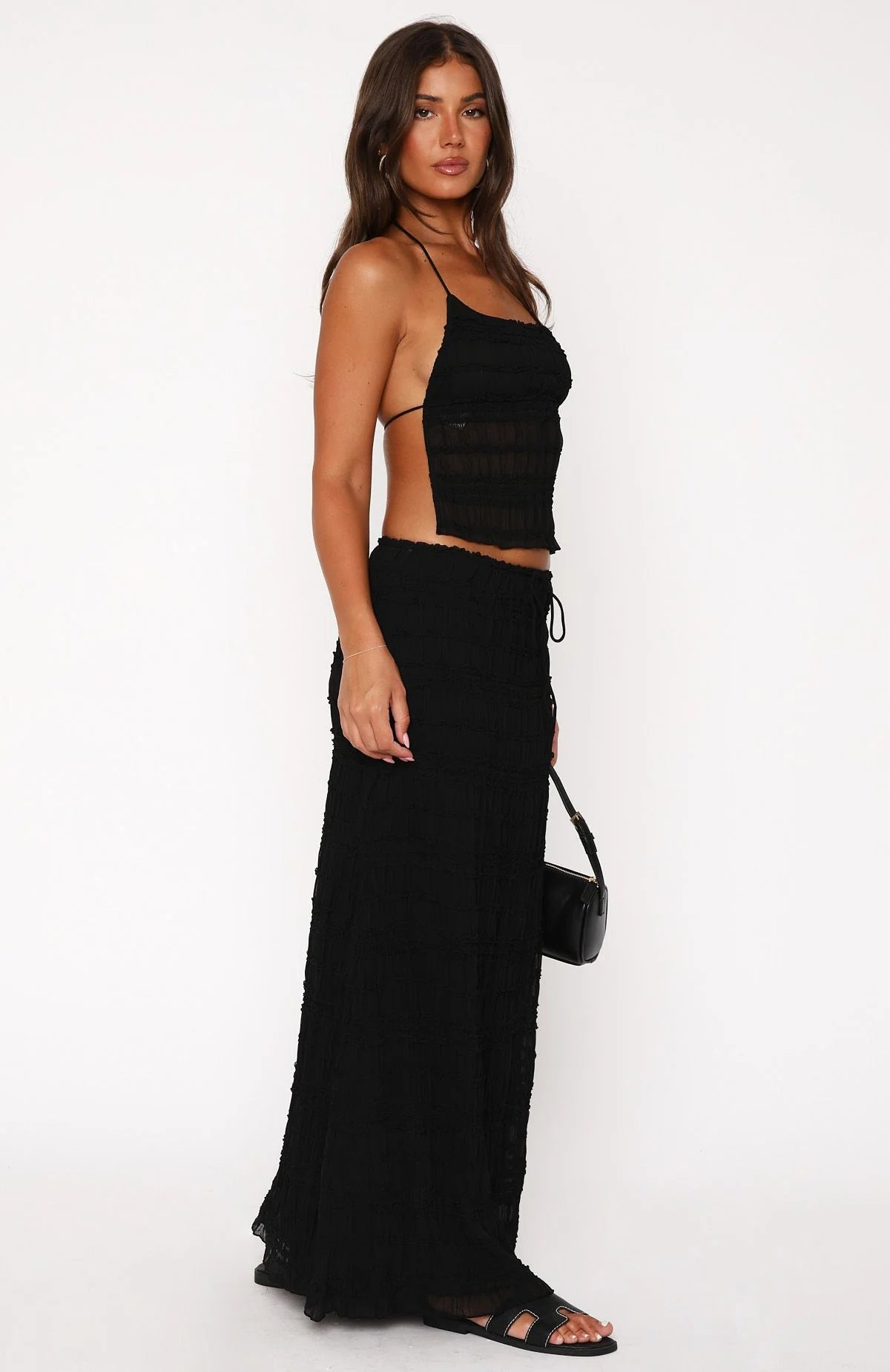 Your go-to for those chic afternoons. The Hold Out Maxi Skirt Black features a thin elasticated waistband, front adjustable drawstring, maxi length, lined fabric, gorgeous textured fabric and lightweight. Pair with the matching Hold Out Halter Top Black for a super chic look!