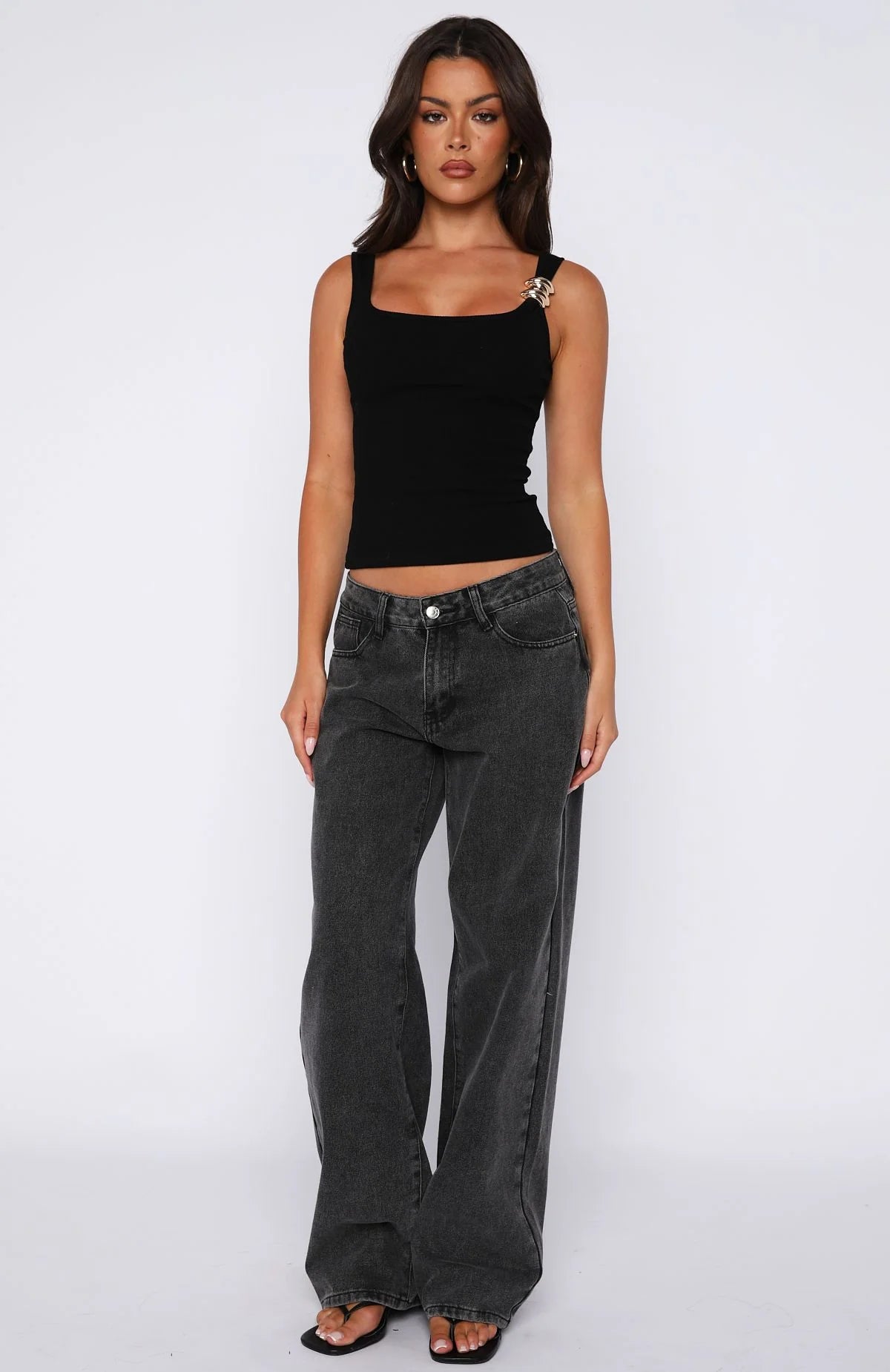 The Horizon Heat Tank Top in Black offers a modern twist on a classic wardrobe staple. Designed with thick shoulder straps and gold hardware detailing on one side, it features a square neckline and ribbed fabrication for added texture. The fully lined, high-stretch fabric ensures a fitted silhouette that flatters the figure. Style with the jeans, sandals and sunnies for the perfect shopping fit.