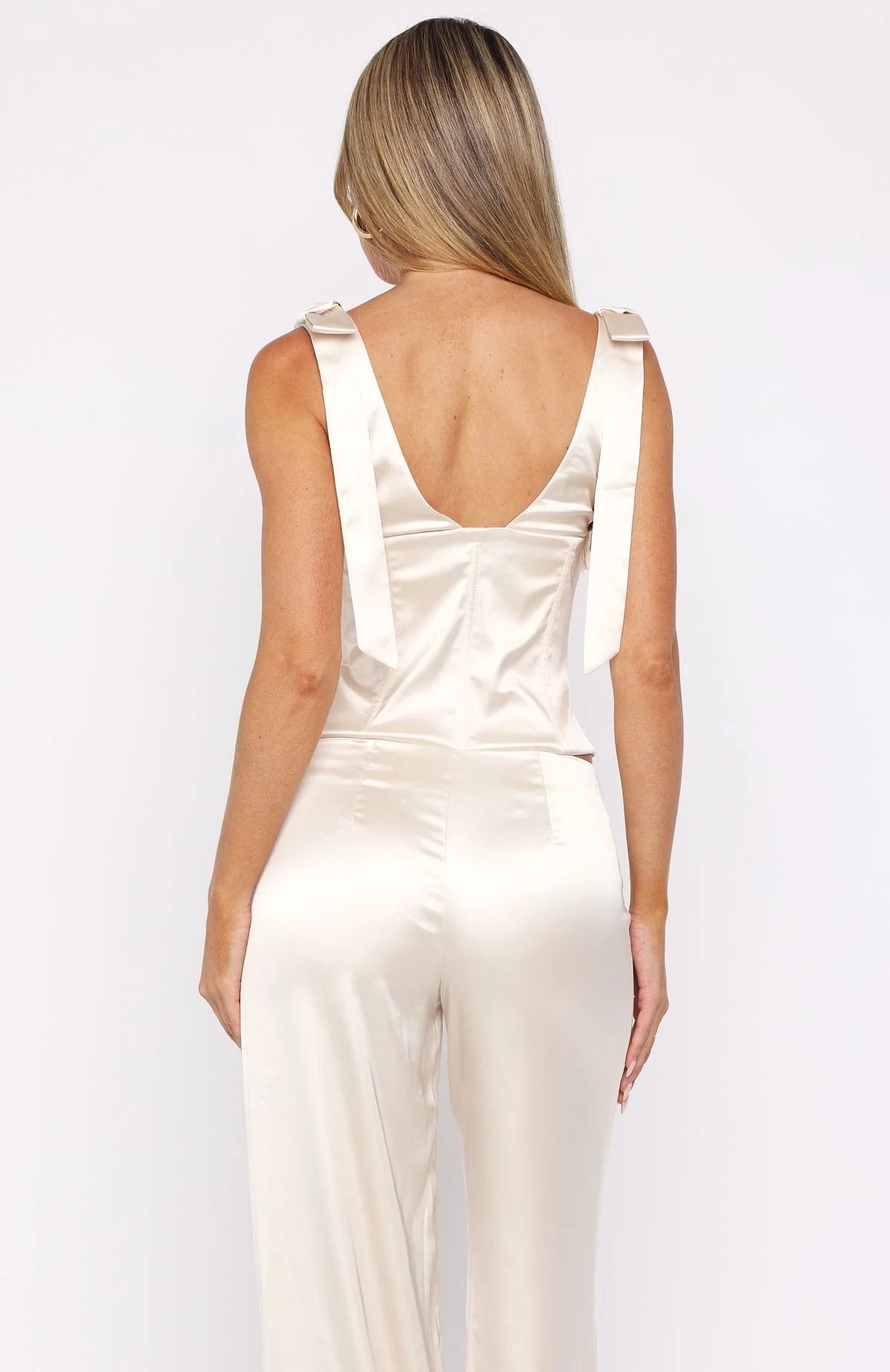 Holiday elegance in motion. The Keep It Lit Top Pearl elevates your festive wardrobe with its silky fabric, bow‑tied thick shoulder straps, a plunging V‑neckline, and a sculpted fitted bodice supported by internal boning. Fully lined and finished with a side zipper plus hook‑and‑eye closure for a flawless finish. Style it with the matching Keep It Lit Pants Pearl and statement heels for an effortless, ultra‑chic holiday look.