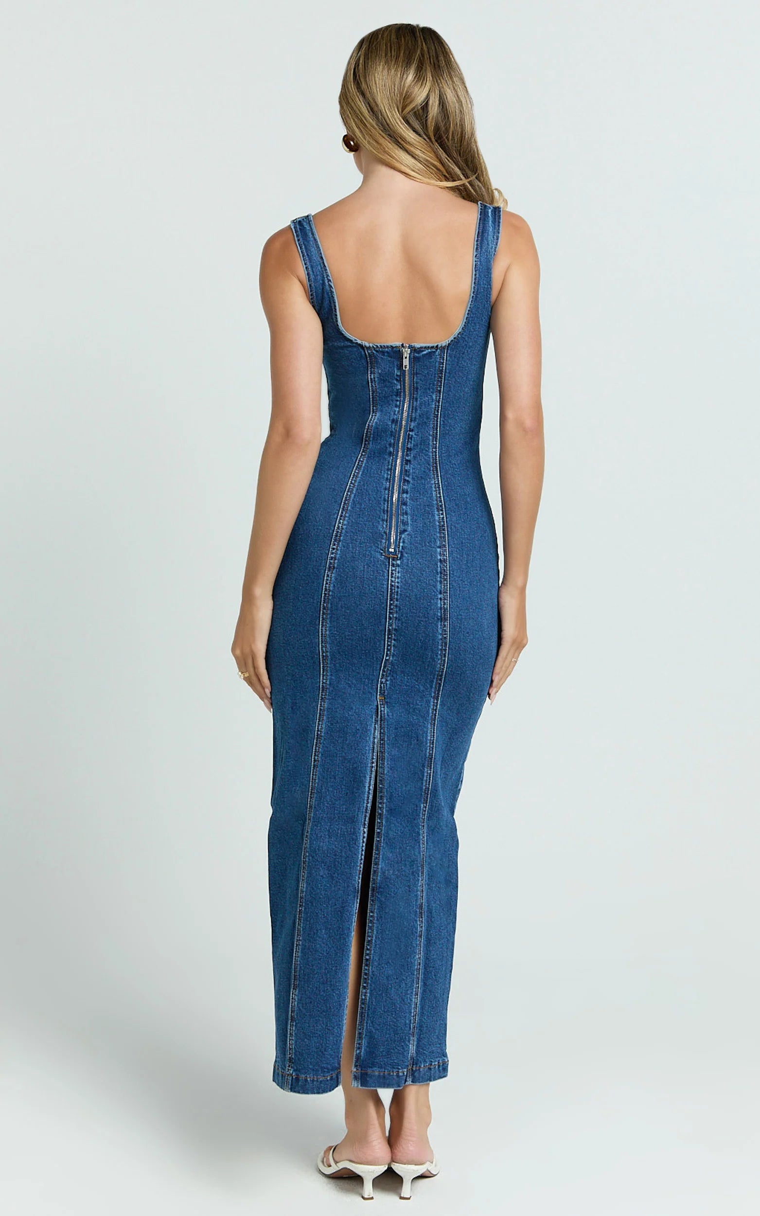 This wide neck, corset-detail maxi serves sculpted shape and effortless edge in a deep blue wash, snatched through the waist, sleek through the skirt, and made for big entrances. Think quiet luxury vibes with a hint of naked dressing thanks to that structured, curve-hugging bodice and clean lines that do the talking.
