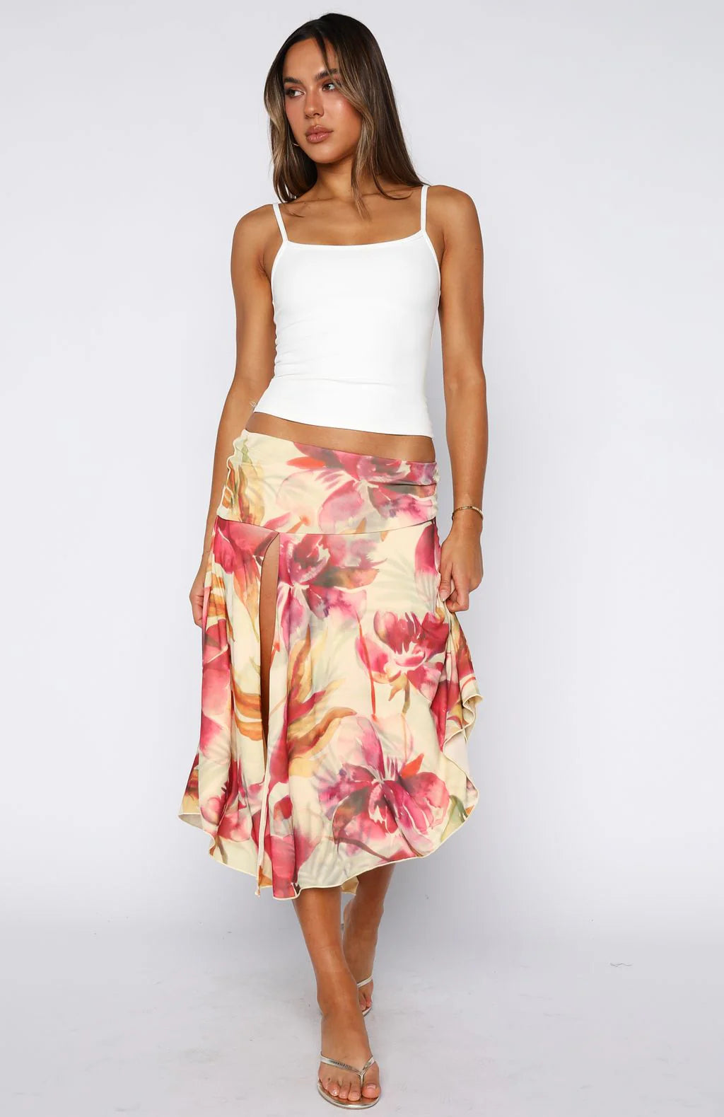 The skirt you planned your trip around! The Losing What We Had Midi Skirt in Sunlight Bloom is designed with a thin elasticated waistband and high front split that offers a cheeky glimpse of the leg. The skirt is fully lined, ensuring a smooth silhouette, and features a asymmetrical hem for dynamic movement. Pair with a basic tank and wedge heels for the ultimate summer vibe!