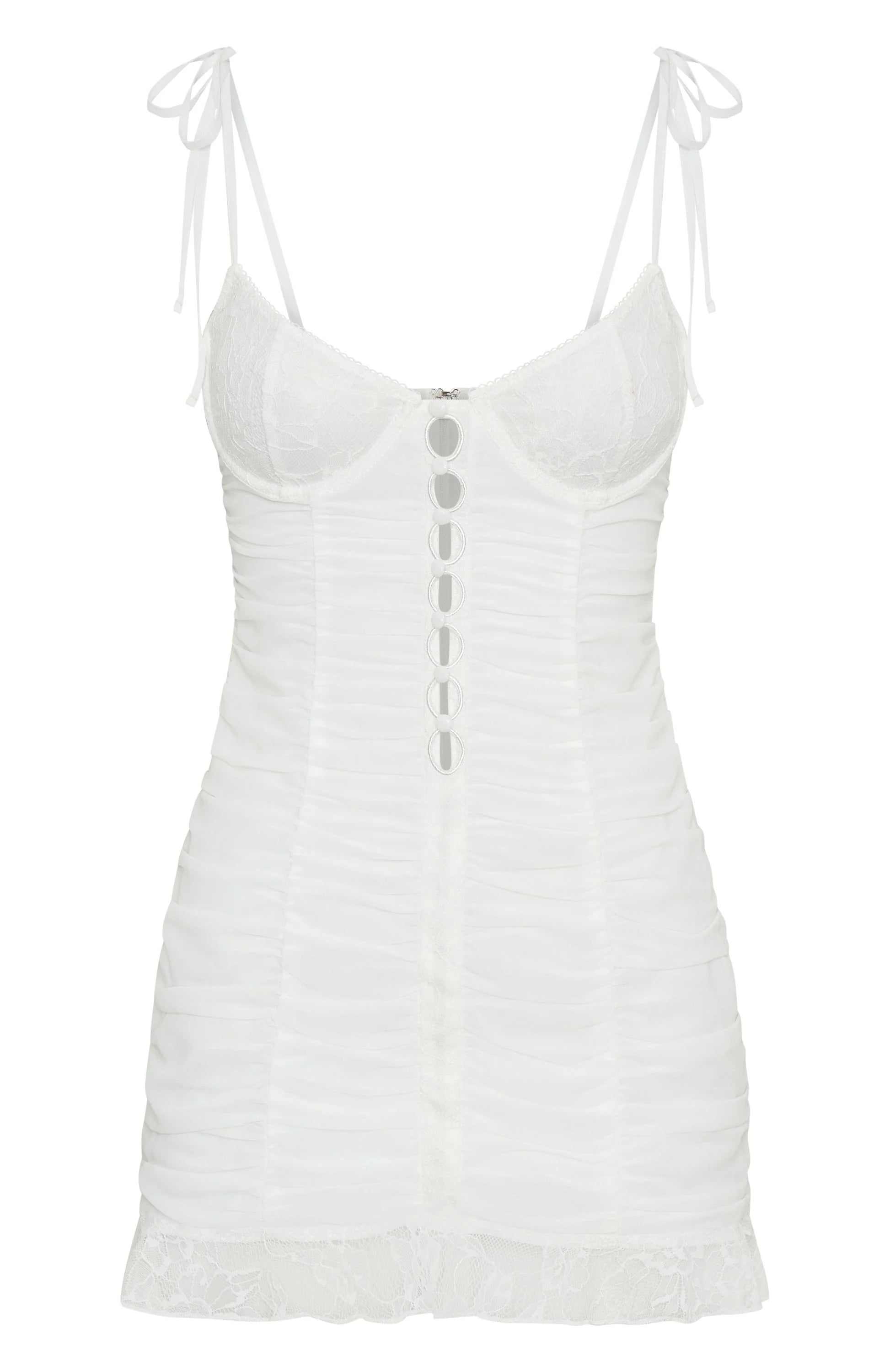 Vibes: Queen of the dessert. The Love Me Mini Dress White features thin, adjustable self tie straps, laced bust cups, lined, centre front faux button design, ruched detailing, invisible back zipper and clasp closure, and lace hem detailing. Style with kitten heels and a slick back bun for a look we adore!