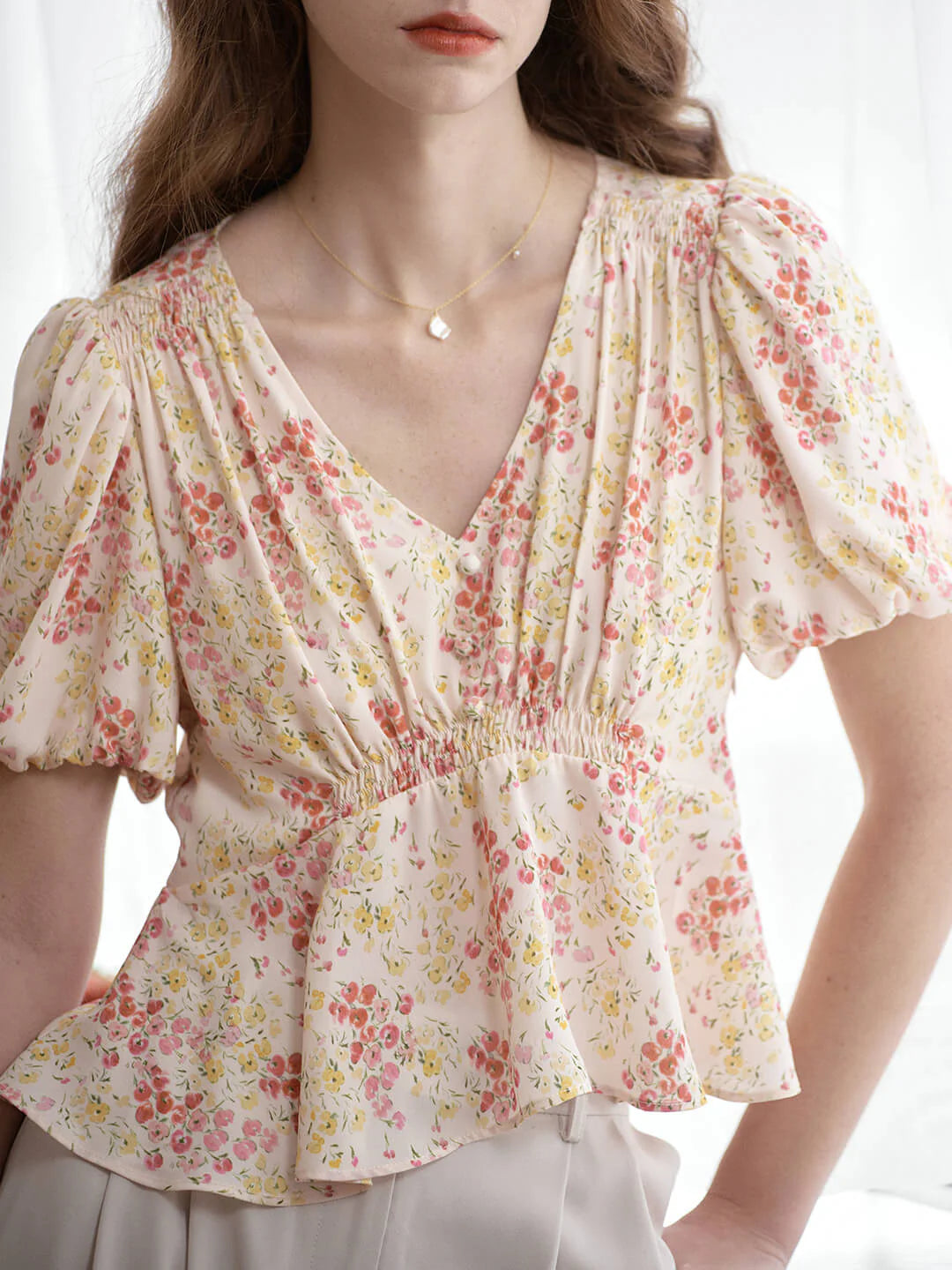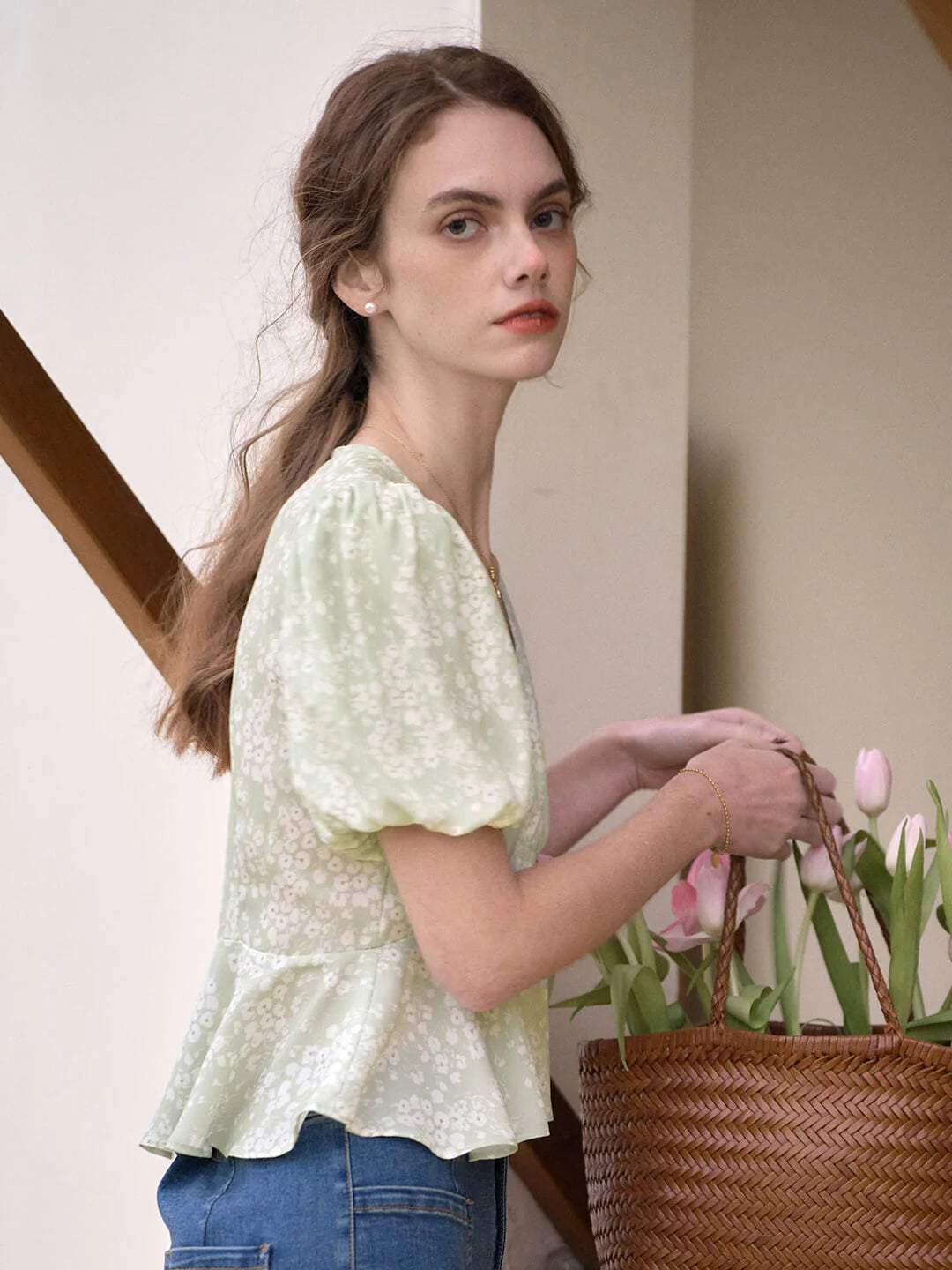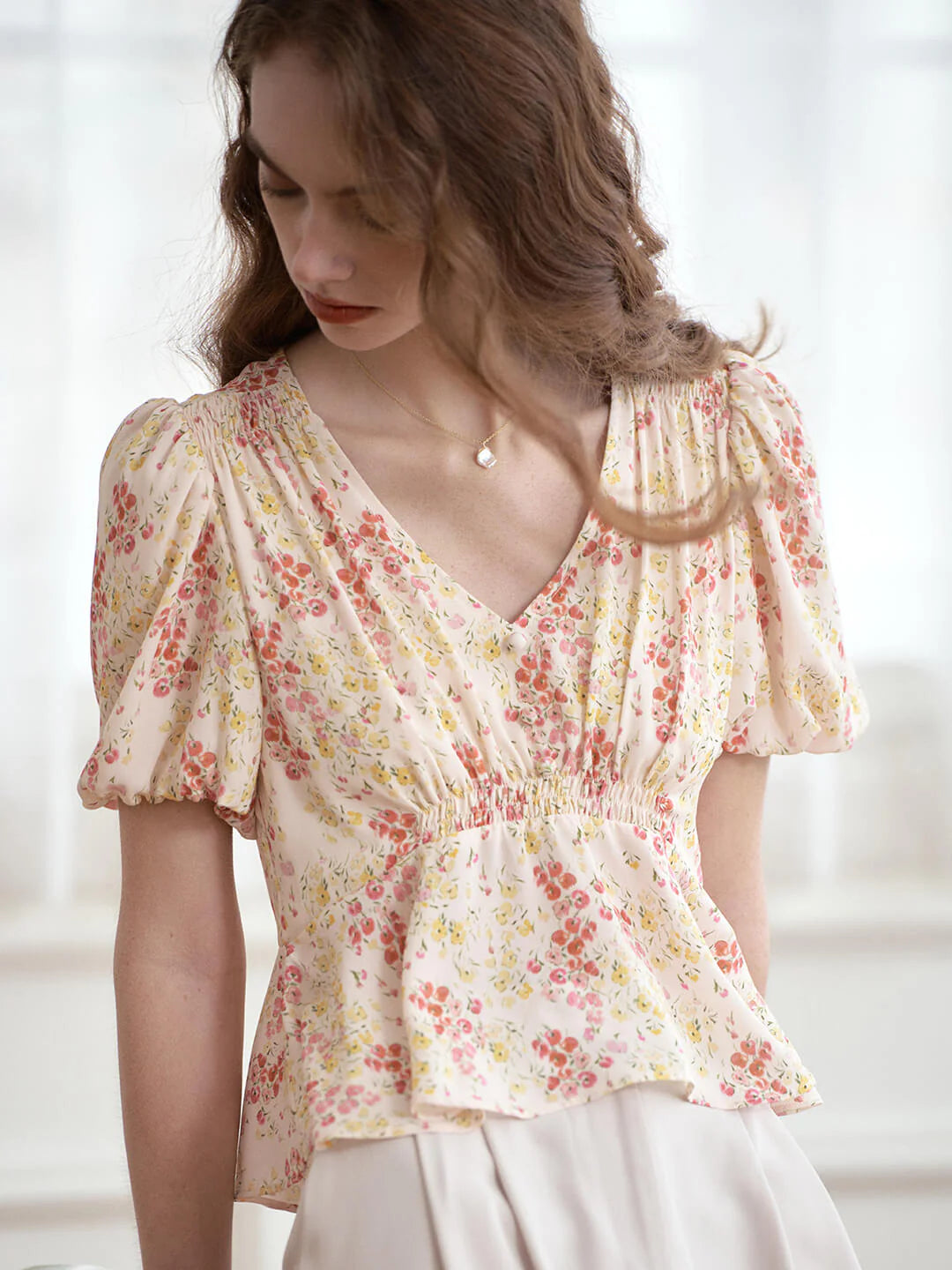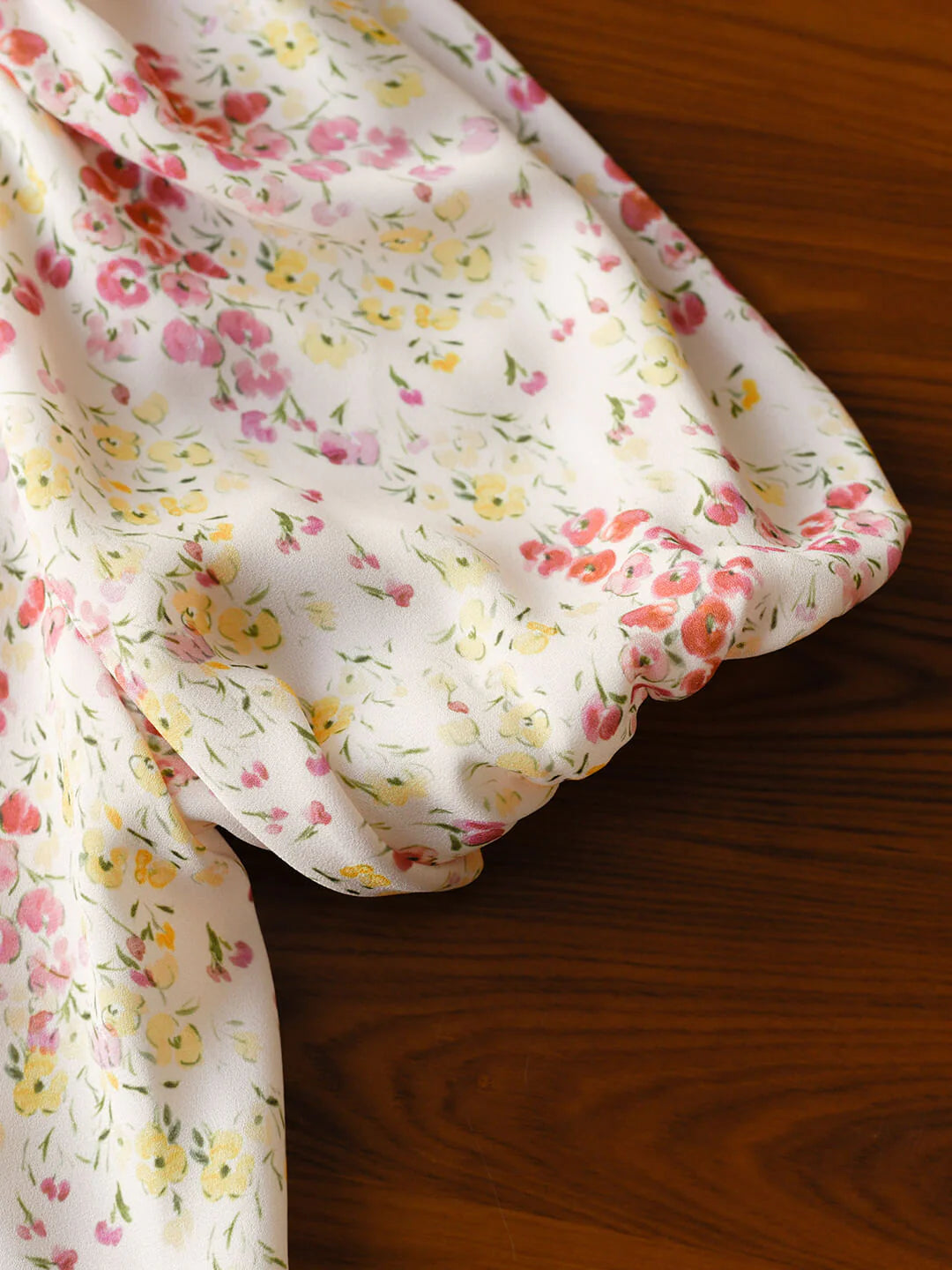 | Detail | SR original printing pattern, patchwork, romantic and natural; comfortable to wear, modifying body proportions; fluffy sleeves, dreaming back to the romance of the 19th century; large V-neck design, outlines the slender neck curve; light texture, elegant and cool | |||