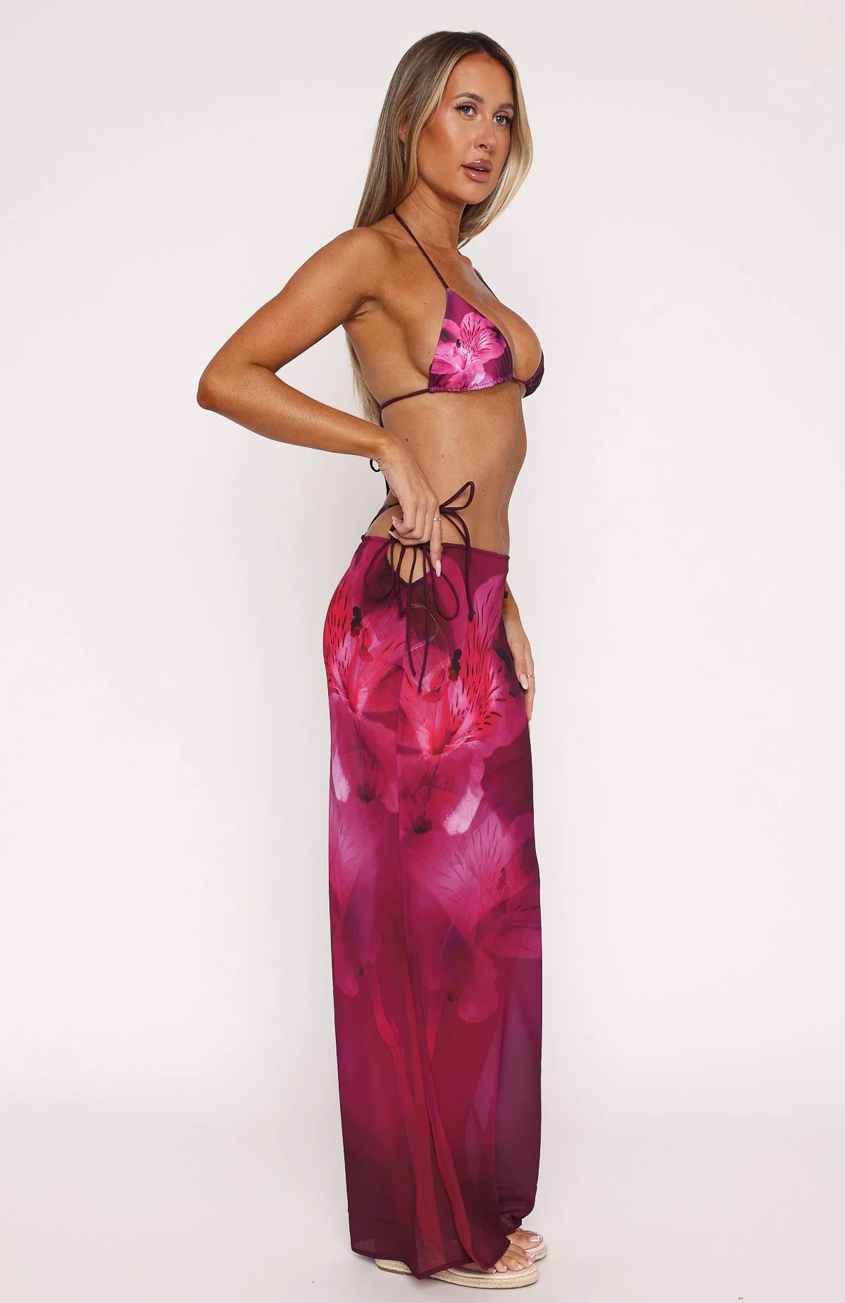 Whether it's cocktail hour under the summer sun or an insta photoshoot, the Luminous Maxi Skirt Berry Lush will soon be your go-to. Features a maxi length, cut-out waist design, side self-tie straps, unlined fabric and an easy slip on style. Pair with cool shades and gold accessories for a complete look.