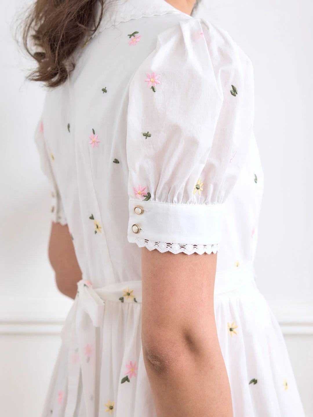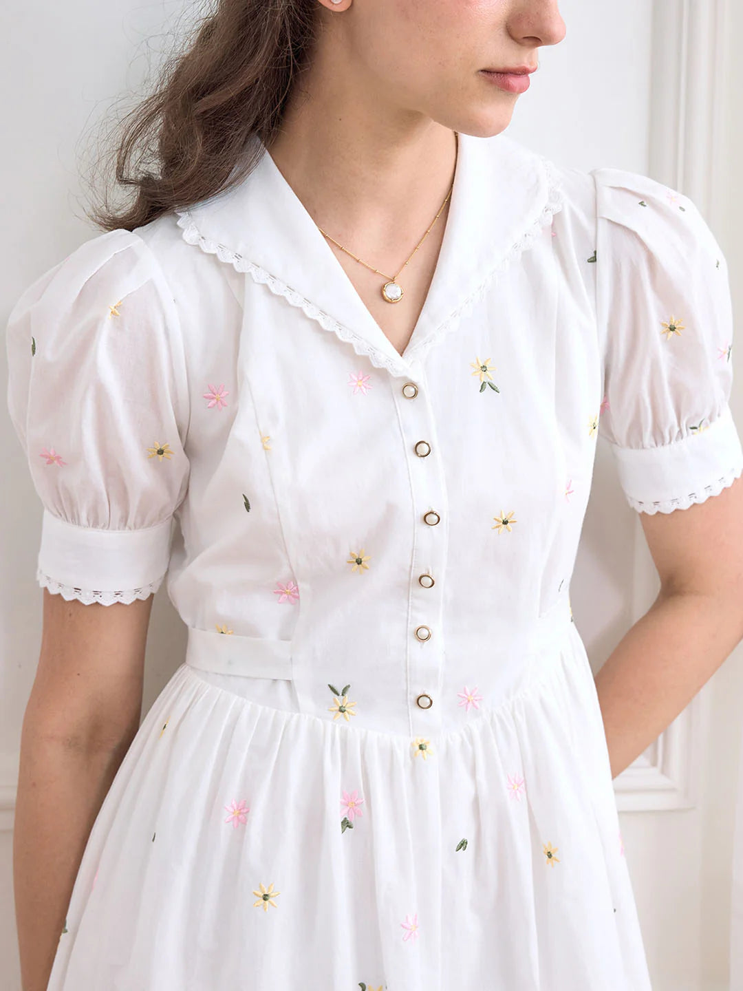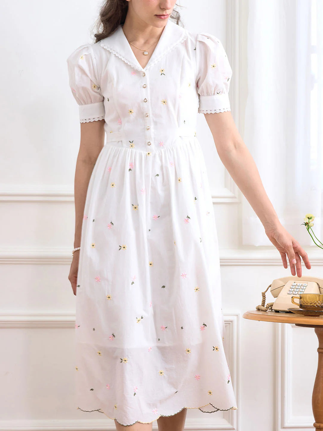 | Detail | Original flower embroidery, three-dimensional pattern; V-shaped lapel, outlines the elegant shoulders and neck; allover dress with floral embroidery, embroidery thread is tight and stylish; wavy hem, sweet and romantic; puff sleeve design, stitching lace, modifying the arm line; fine and dense fabric, light and comfortable, breathable and durable | |||