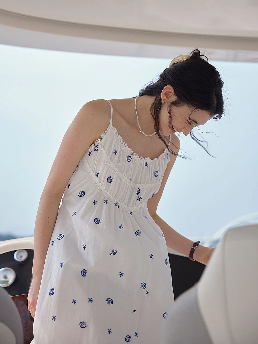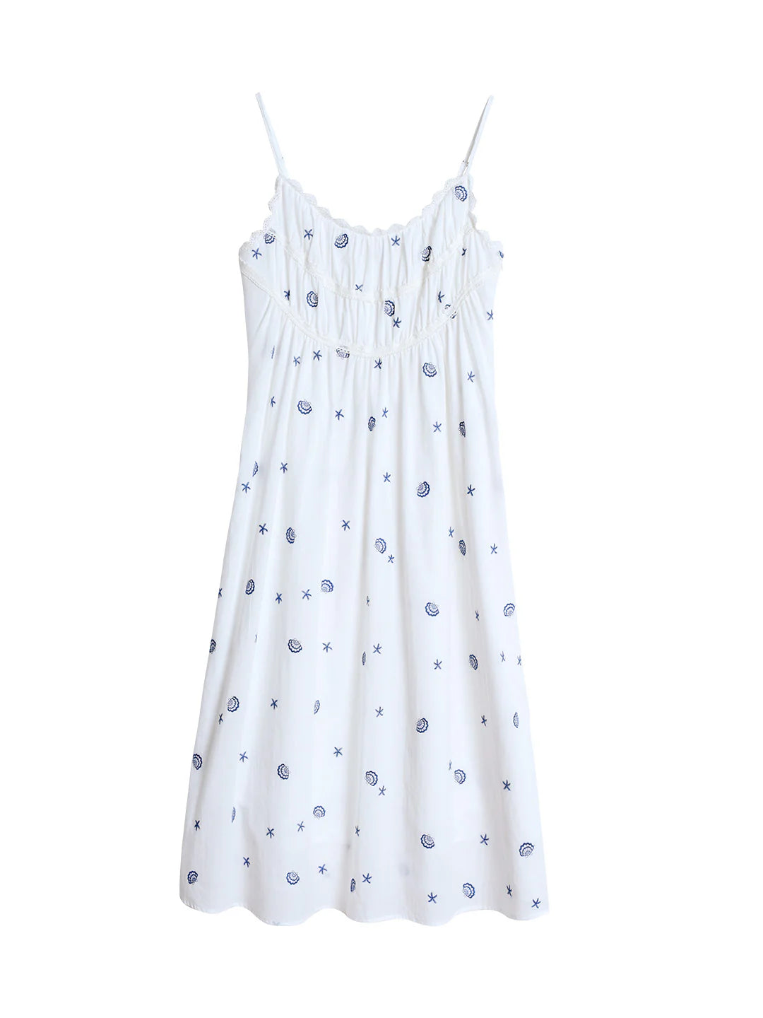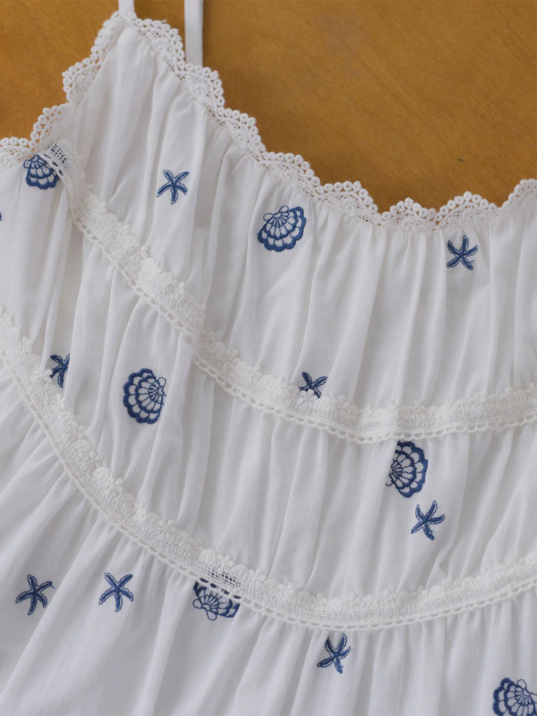 | Detail | Original shell embroidery, contrasting colors are fresh, natural, and vivid; micro-A-shaped version & high waistline design, loose and moderate, appear tall and thin and optimize body proportions; adjustable shoulder strap & belt, freely adjust the comfortable dimension; the back is lowered to open the one-line collar, and the back can also be loved at first sight; the fabric is soft and comfortable, moisture-absorbing and breathable, flat and crisp; lined | |||