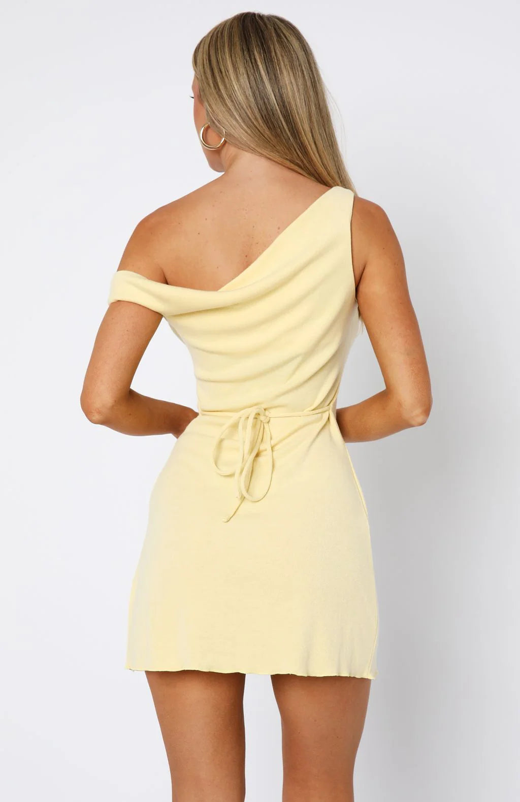 Fall in love with our Nights Away Mini Dress in Lemon! Features a one shoulder neckline, fitted bodice with side ties closing centre back and stretch fabrication for an easy slip on and off. Keep your style simple but chic by pairing with kitten heels and layered gold jewellery!