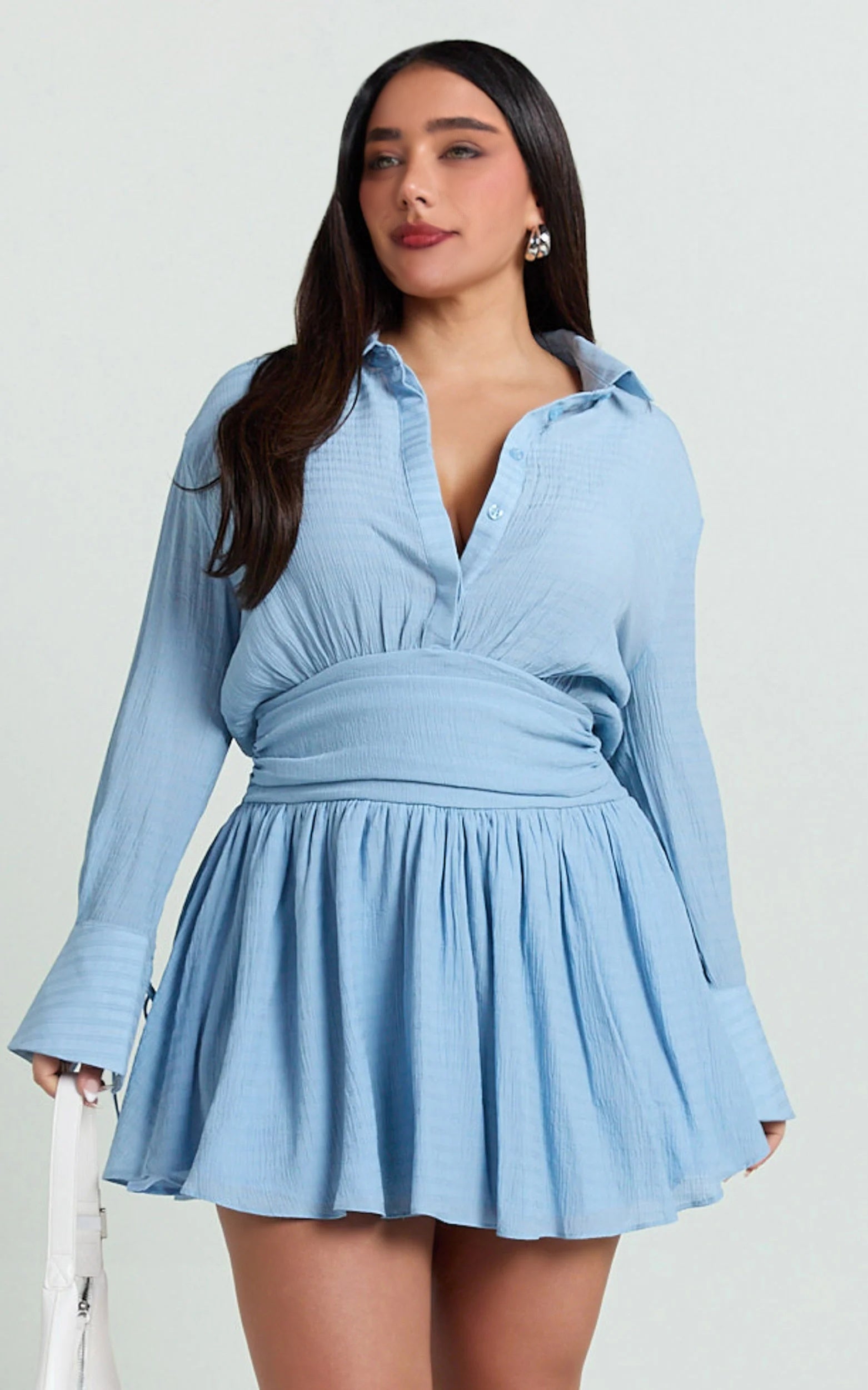 A collared neckline, long sleeves, and a cinched corset waist give it a trendy streetwear look. The shirt dress style makes it highly versatile. Whether it's a brunch date or a night out for cocktails, this dress can fit into any of your plans.