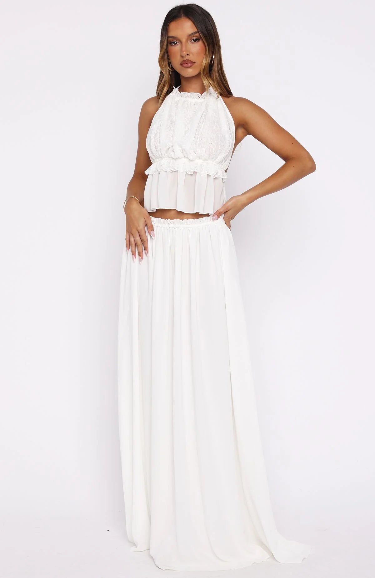Vibes: golden girl! The Pure Magic Maxi Skirt in White features a thin elastic waistband and frill hem, relaxed silhouette and full lining for effortless elegance. Style with matching Pure Magic Top and simple heels for a chic fit.