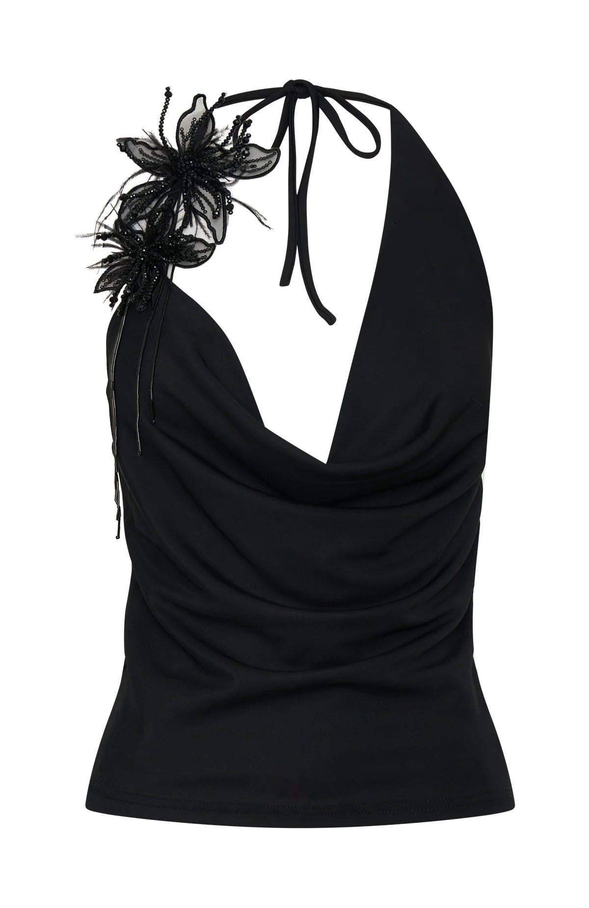 THE fit everyone will be talking about...Introducing the Rave Crave Halter Top Black. Featuring a halter neck design with back self tie straps and flower embellishments, backless design, low plunge cowl neckline and stretch material for an easy slip on design. Complete the look with the Let's Ride Mini Shorts Black and kitten heels for a statement fit.