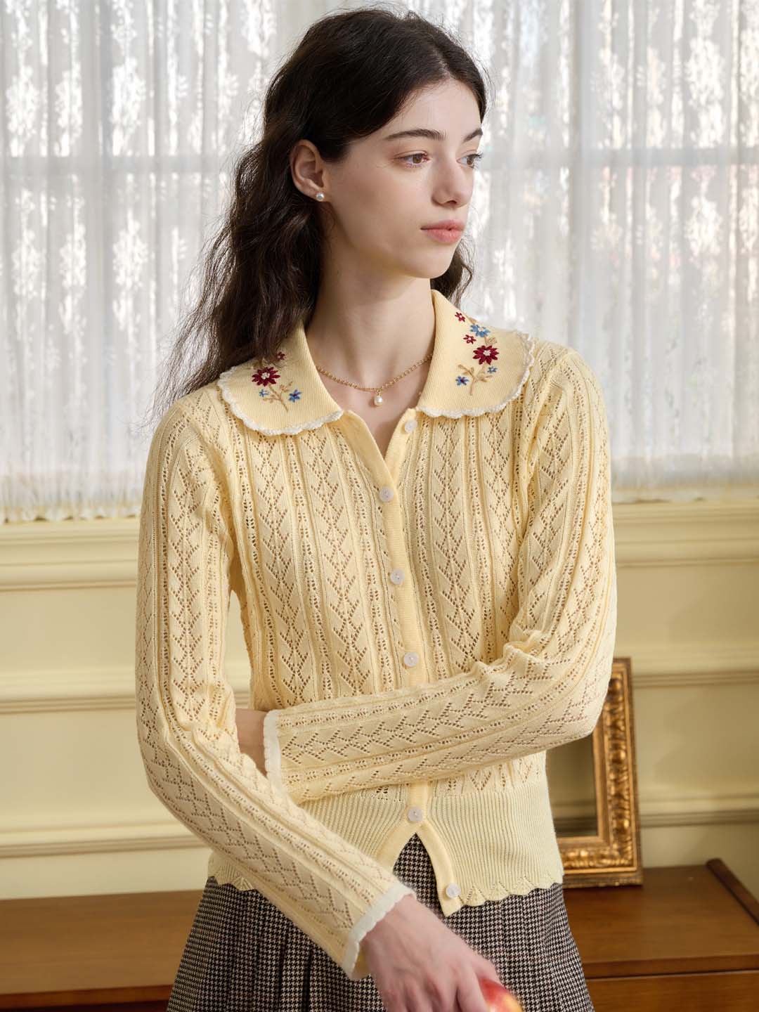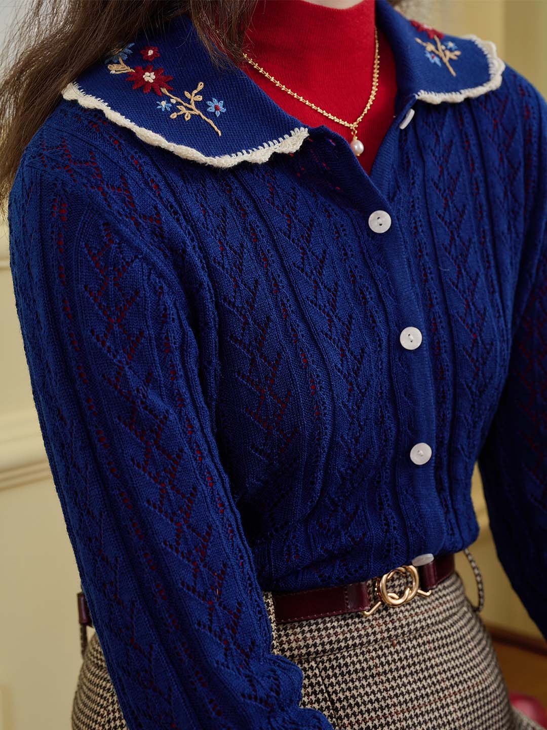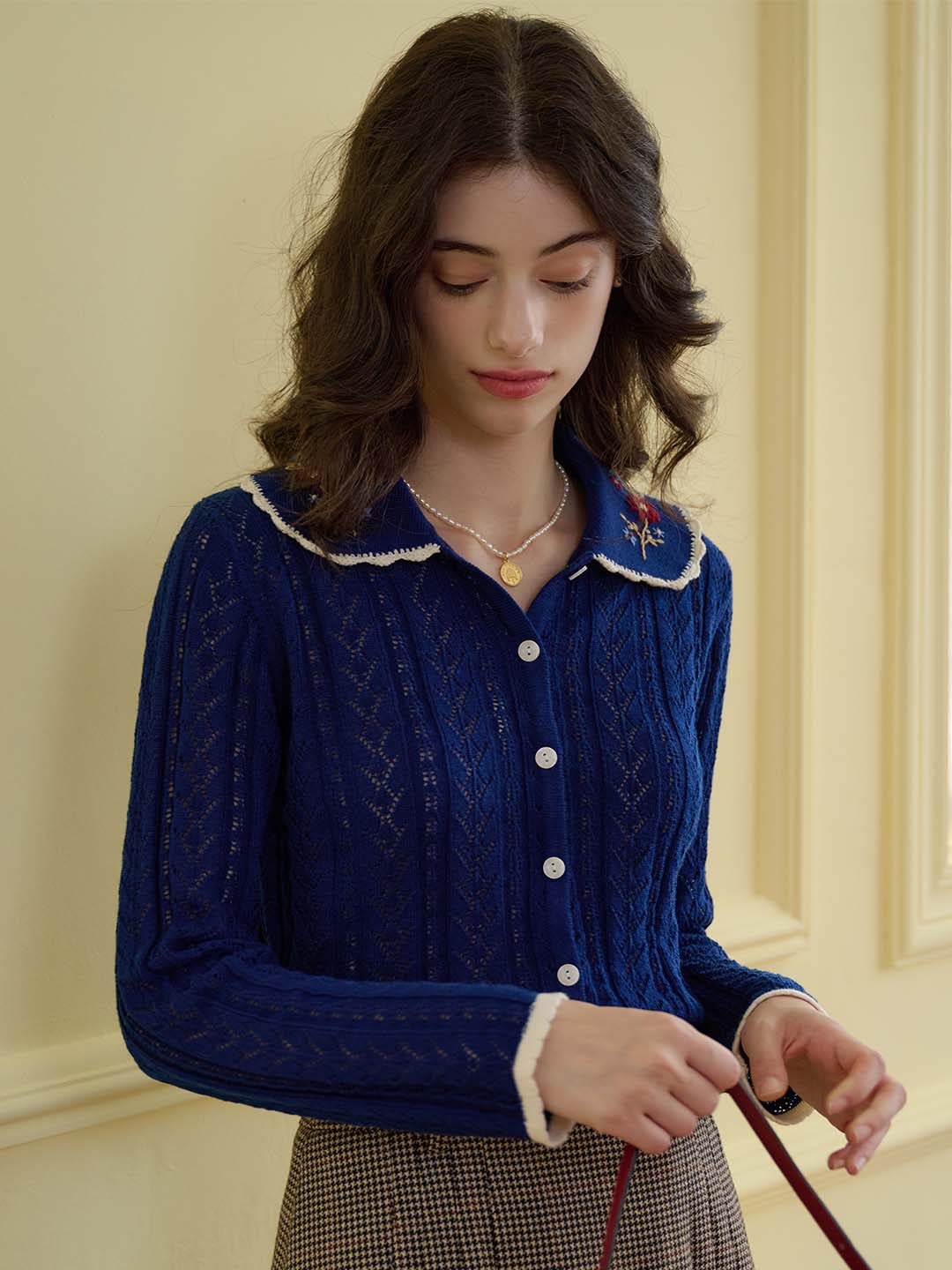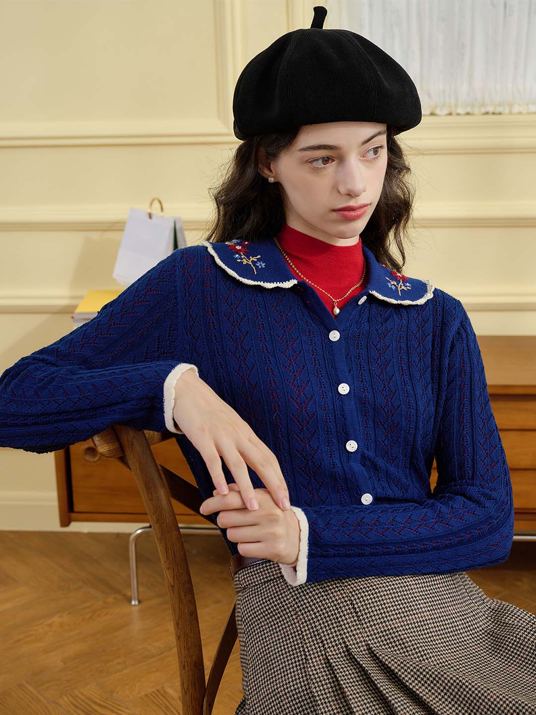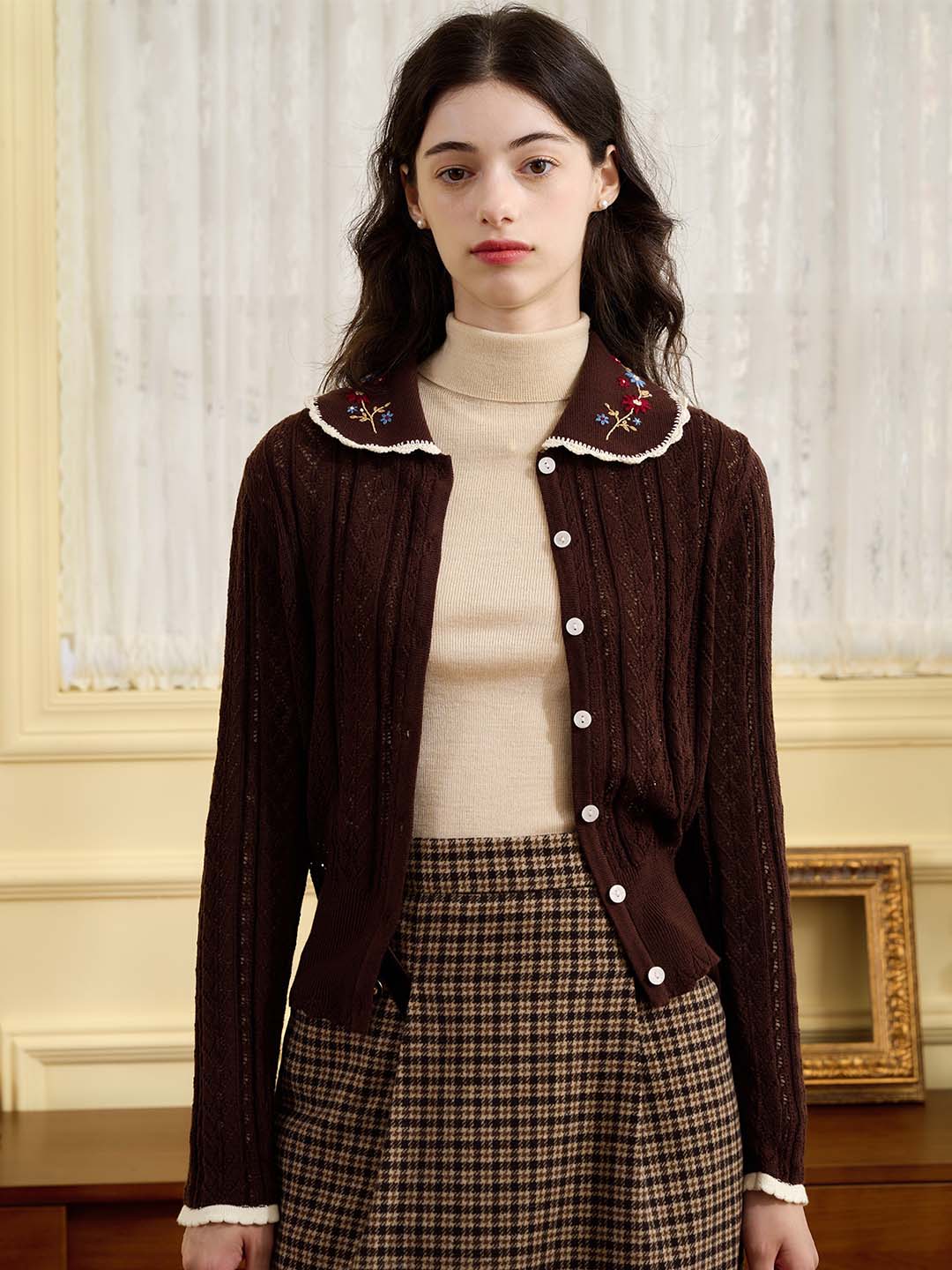 | Detail | The X-shaped waist shape fits the body shape and outlines a slender and curvy figure; the Peter Pan collar & color embroidery design softens the line of the neck, which is exquisite and sweet; the collar and cuffs are designed with wavy black edges, classic colors, and diffuse retro romantic tone; the full-width hollow weave of the cardigan enriches the design and exudes a sweet and flexible temperament; the wool fabric has excellent elasticity, and the texture is online, soft and comfortable | |||
