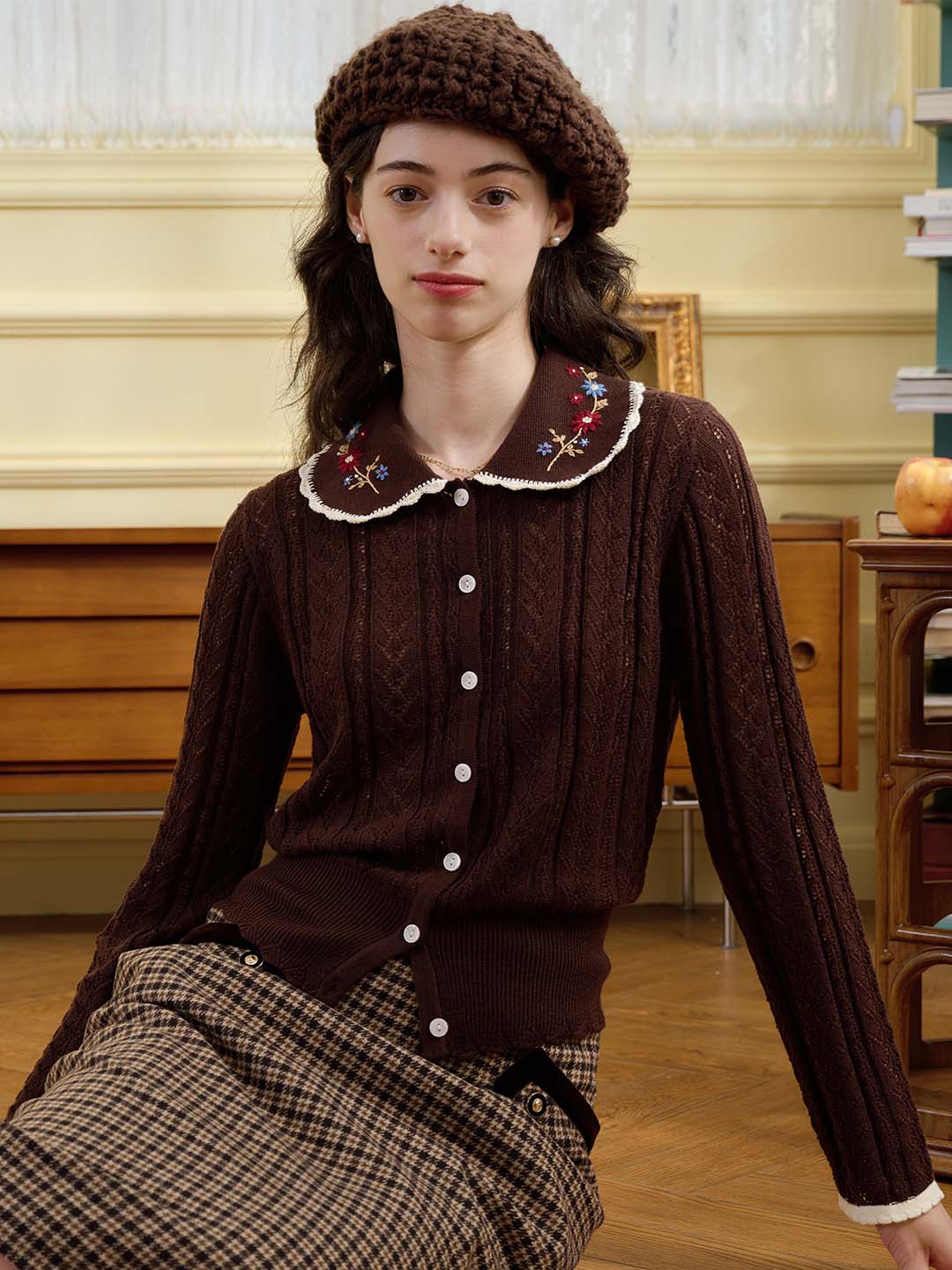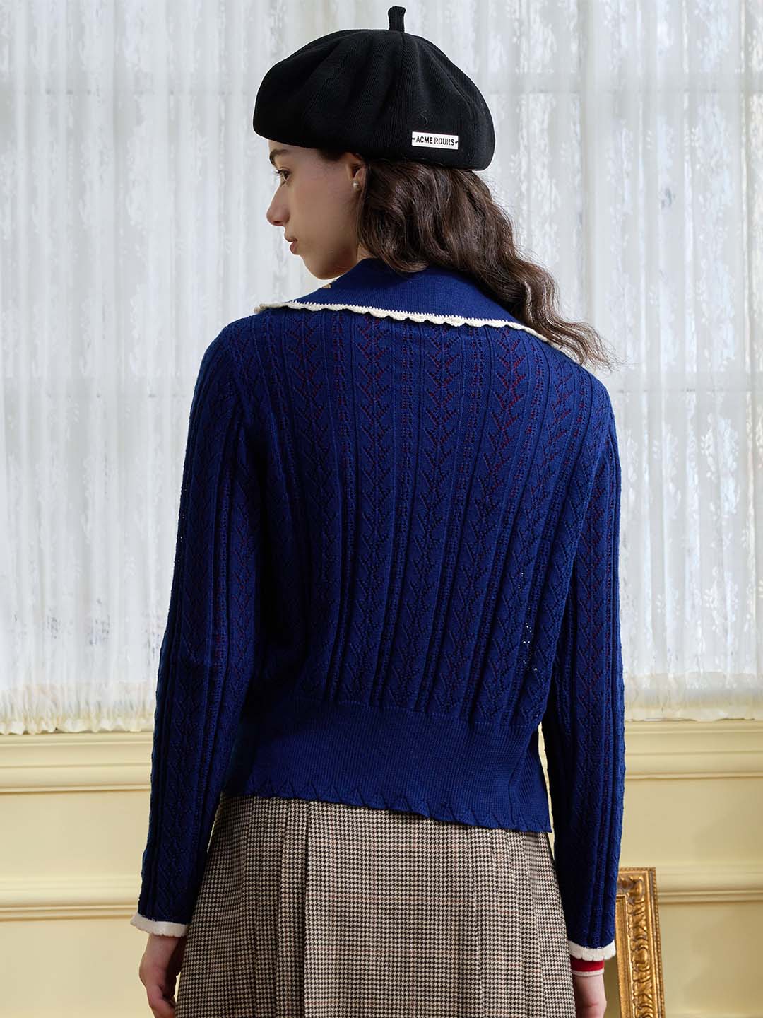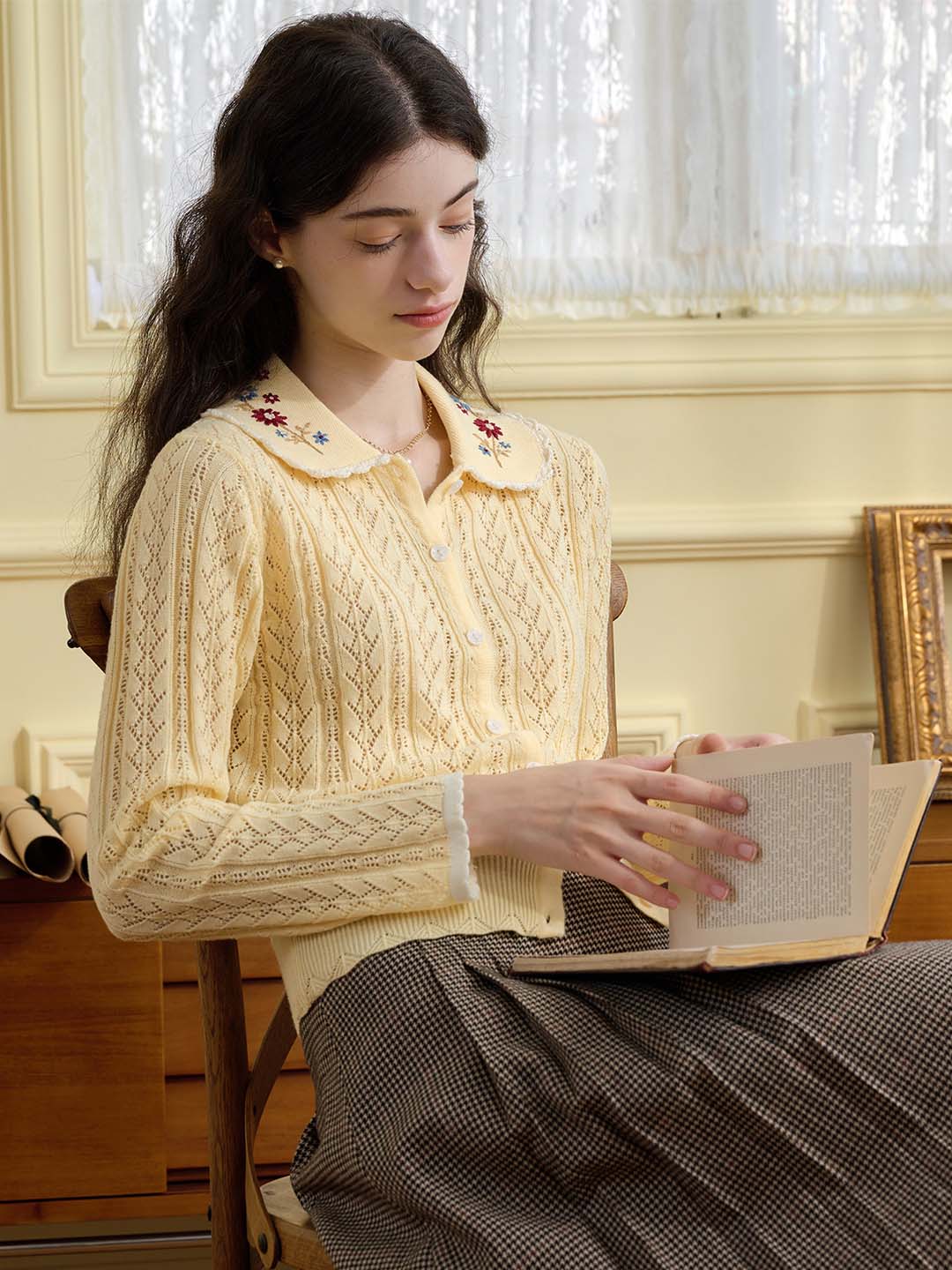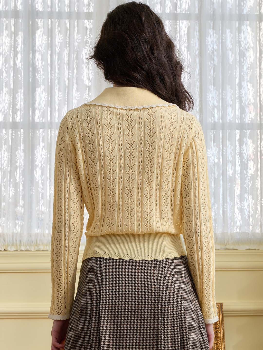 | Detail | The X-shaped waist shape fits the body shape and outlines a slender and curvy figure; the Peter Pan collar & color embroidery design softens the line of the neck, which is exquisite and sweet; the collar and cuffs are designed with wavy black edges, classic colors, and diffuse retro romantic tone; the full-width hollow weave of the cardigan enriches the design and exudes a sweet and flexible temperament; the wool fabric has excellent elasticity, and the texture is online, soft and comfortable | |||