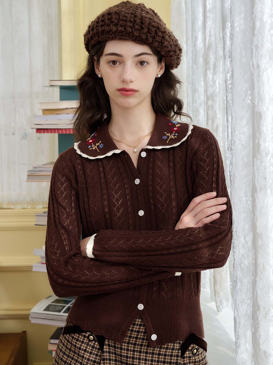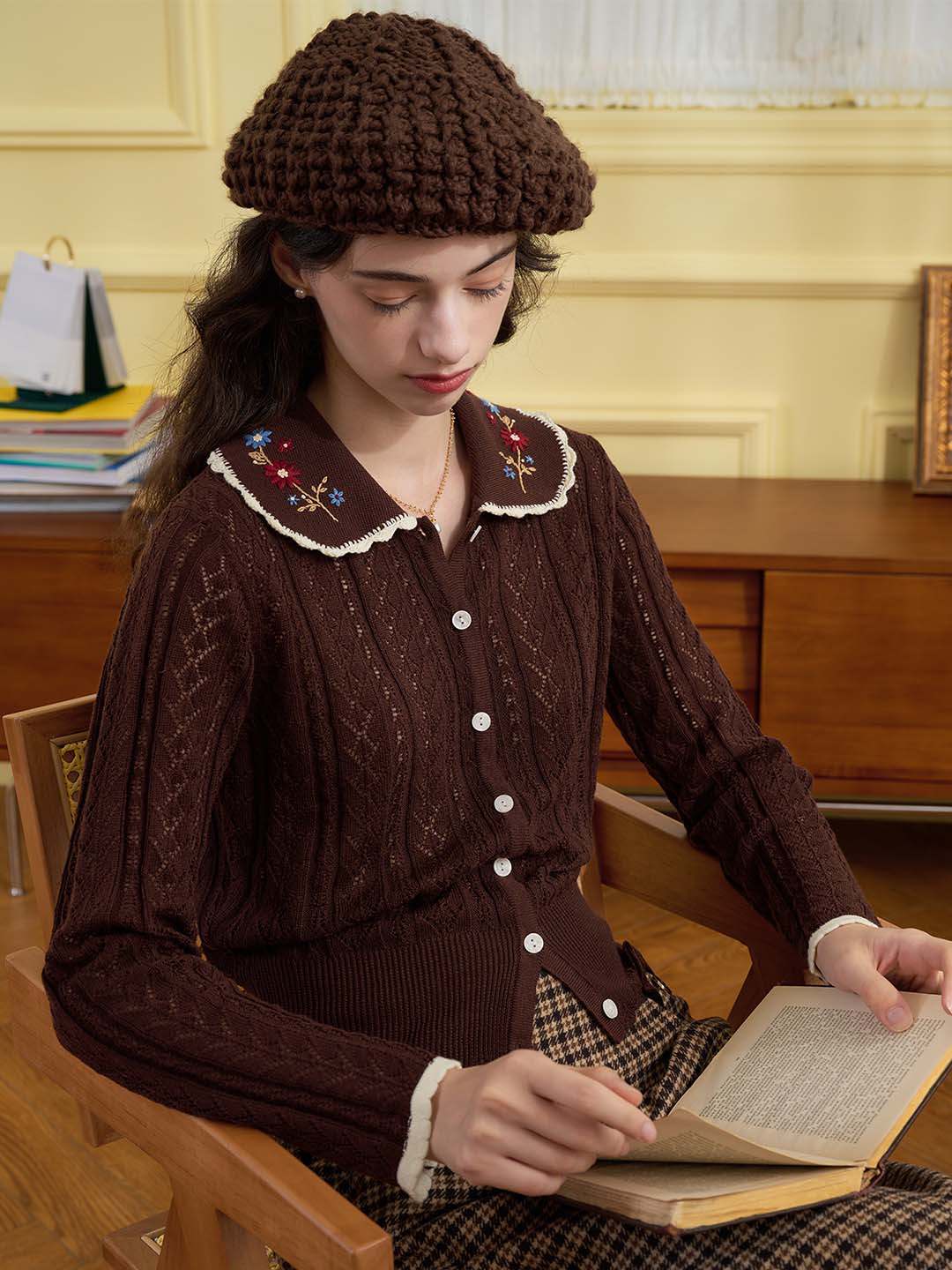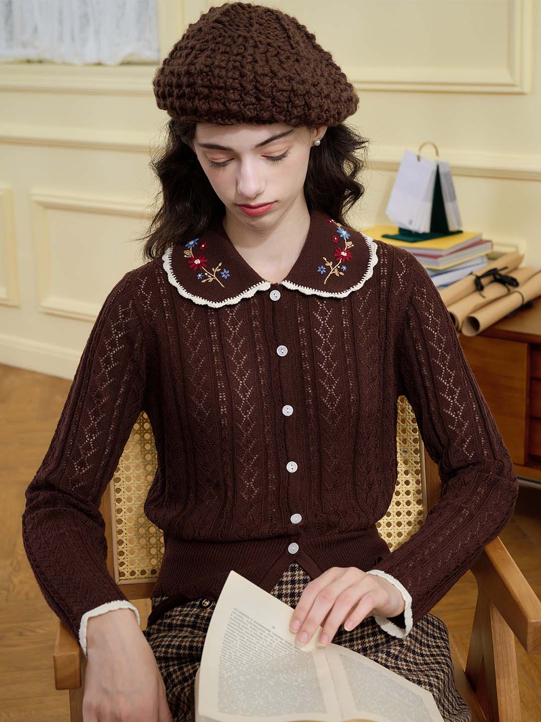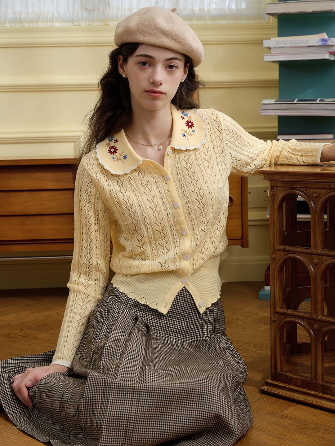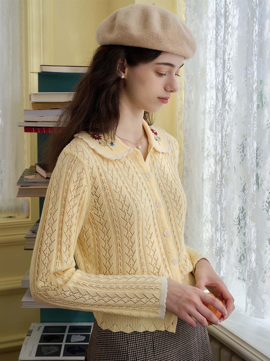 | Detail | The X-shaped waist shape fits the body shape and outlines a slender and curvy figure; the Peter Pan collar & color embroidery design softens the line of the neck, which is exquisite and sweet; the collar and cuffs are designed with wavy black edges, classic colors, and diffuse retro romantic tone; the full-width hollow weave of the cardigan enriches the design and exudes a sweet and flexible temperament; the wool fabric has excellent elasticity, and the texture is online, soft and comfortable | |||