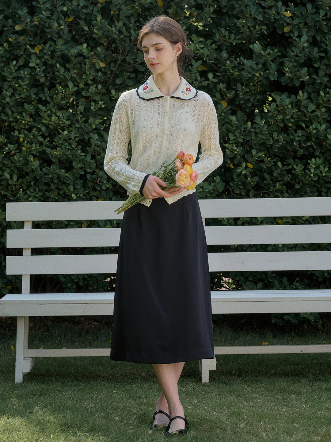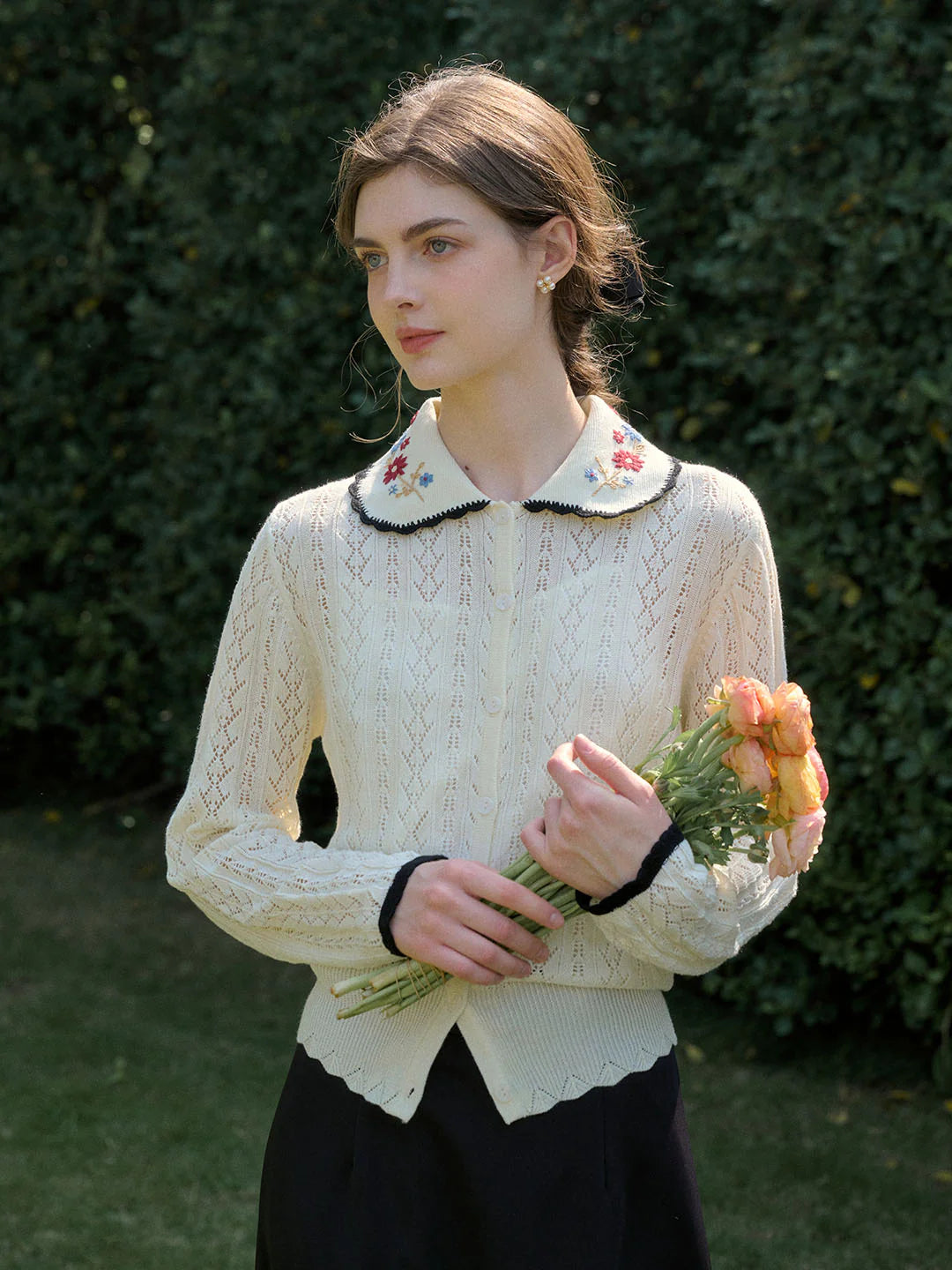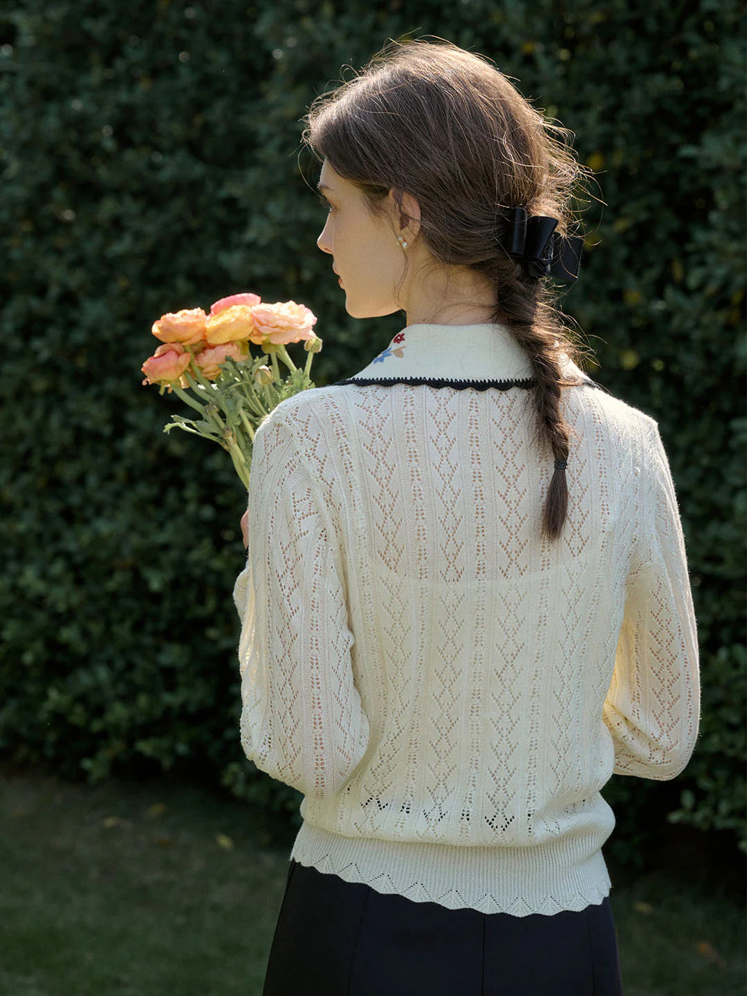 | Detail | The X-shaped waist shape fits the body shape and outlines a slender and curvy figure; the Peter Pan collar & color embroidery design softens the line of the neck, which is exquisite and sweet; the collar and cuffs are designed with wavy black edges, classic colors, and diffuse retro romantic tone; the full-width hollow weave of the cardigan enriches the design and exudes a sweet and flexible temperament; the wool fabric has excellent elasticity, and the texture is online, soft and comfortable | |||