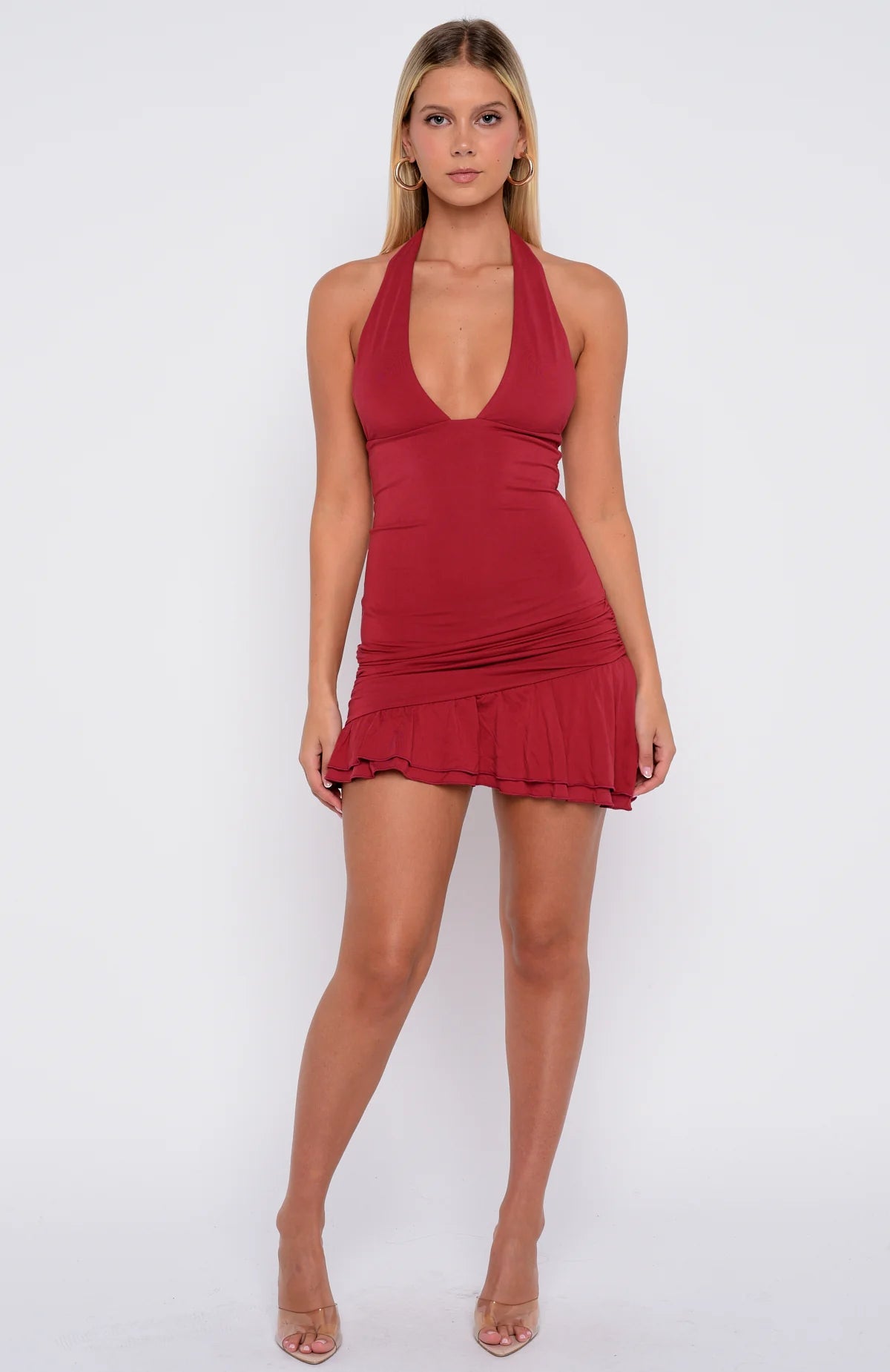 Stand out from the crowd this season in the She’s The Trend Halter Mini Dress in Soft Mulberry. Designed with confident allure, this mini dress showcases bold halter straps, a plunging neckline, and a sculpted bodice, all while offering visual texture and dimension through ruched hips and dainty frill detailing along the hem. Fully lined and crafted in a high-stretch fabric, it’s as comfortable as it is captivating. Pair with kitten heels and layered gold jewellery to let the dress speak for itself.