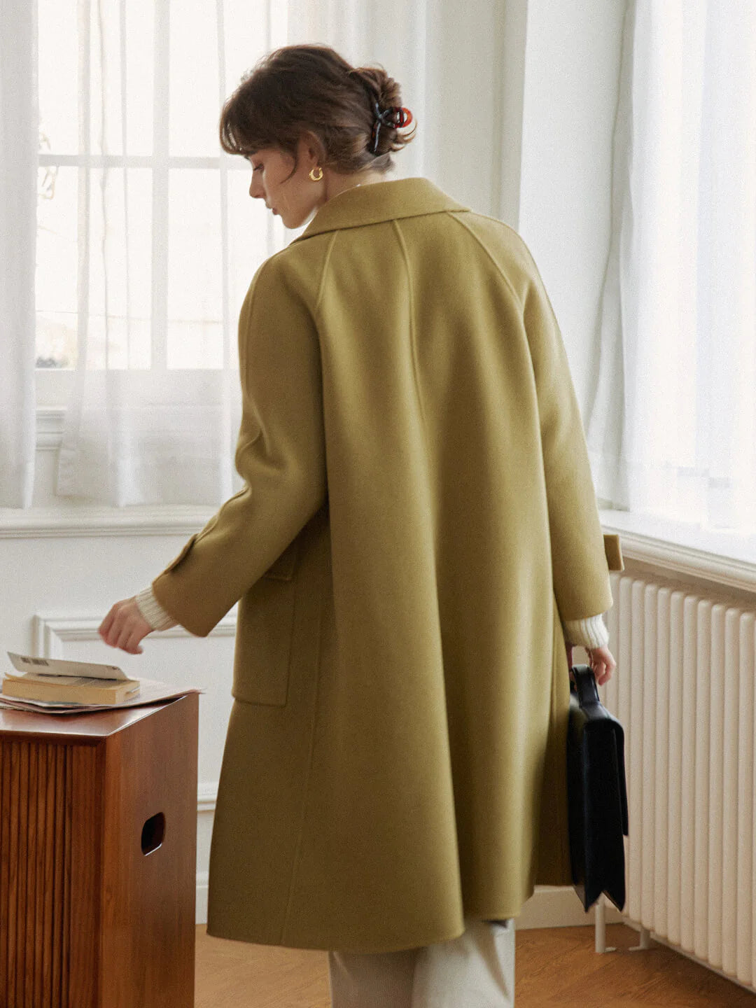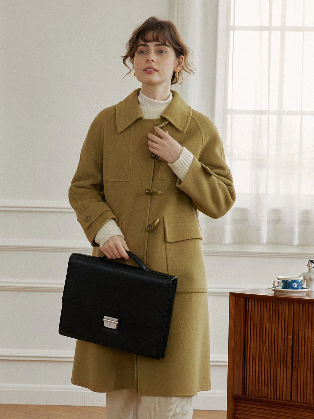 The Kiera Wool Green Long Coat balances classic lines with modern practicality. Its elevated fabric blend, distinctive horn button details, and generous pockets make it as stylish as it is functional—ideal for those who value enduring style with a touch of character.