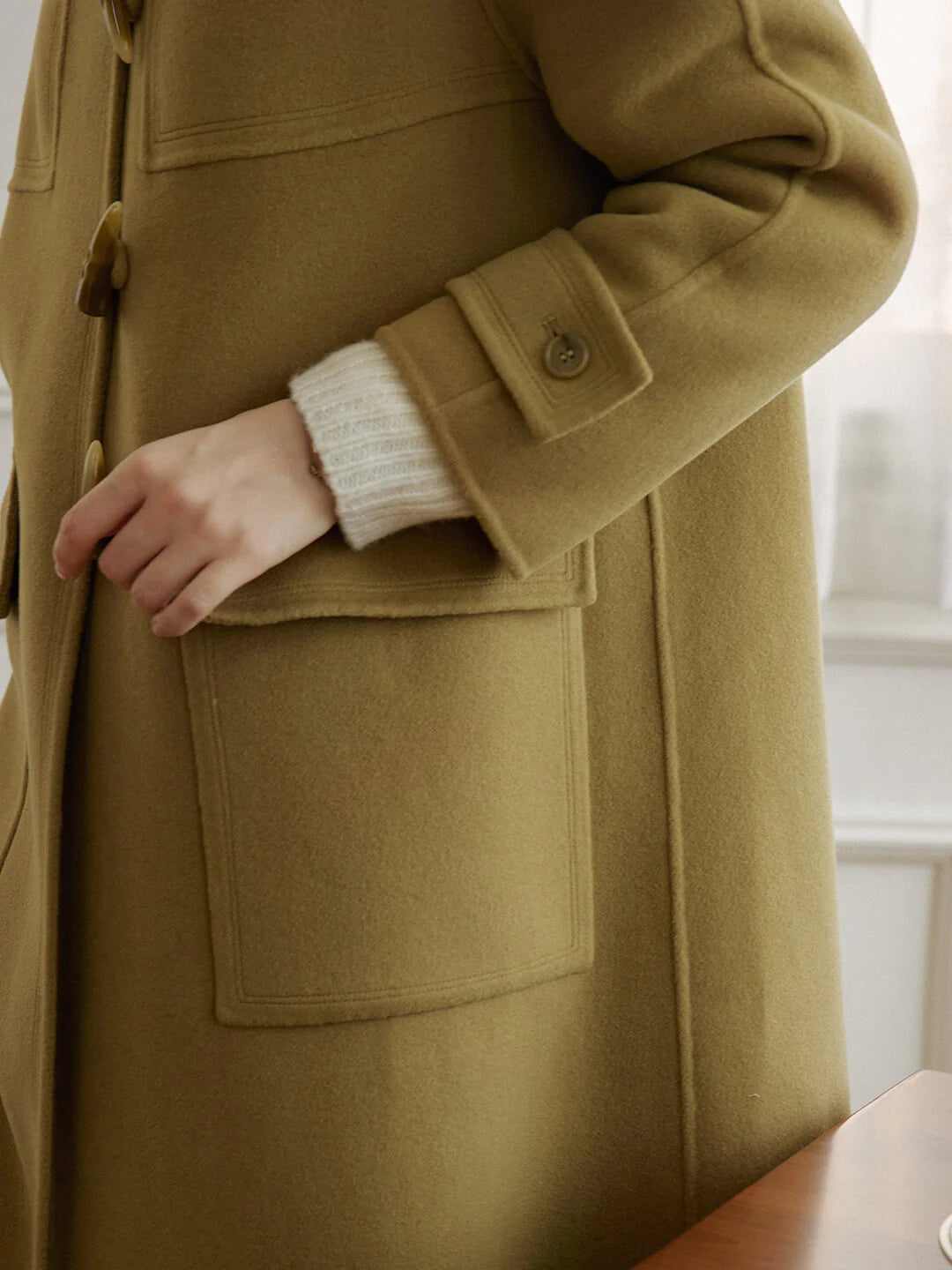 Functional Front Pockets: Symmetrical oversized pockets provide both practical storage and visual interest, balancing the coat’s minimalist design.