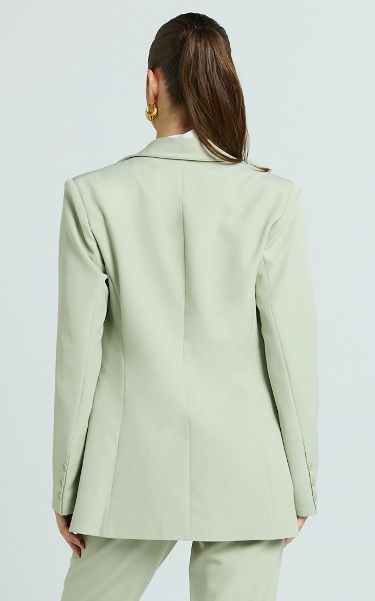 This blazer can make any outfit stand out without being overly flashy. You can style it with a printed satin midi skirt and suede ballet flats for a more elegant look, or keep it simple with a short-sleeve polo top. The sage green color goes well with neutral and metallic tones, and the single-breasted closure ensures a sleek appearance whether you're in a meeting or out for drinks.