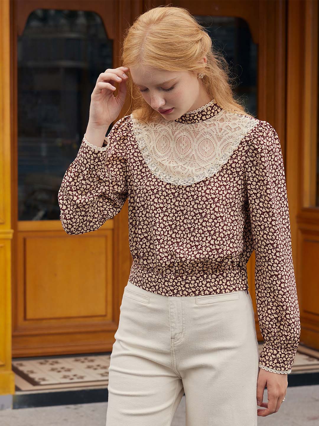 | Detail | Retro red maple leaf print, harmonious color matching, exuding retro literary and artistic temperament; short high collar and waisted version, visually optimizing body proportions; small stand collar design, modifying the line of the neck; hollow positioning semi-circle collar lace splicing, exquisite workmanship, sweet and romantic atmosphere; lace splicing on the collar and cuffs enriches the design highlights of the blouse; the fabric feels delicate, soft and elegant, comfortable and breathable | |||