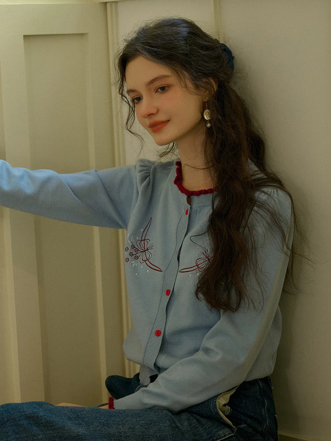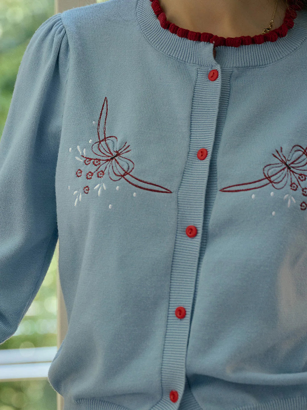 Details: Embroidery, Contrast Binding, Button Front