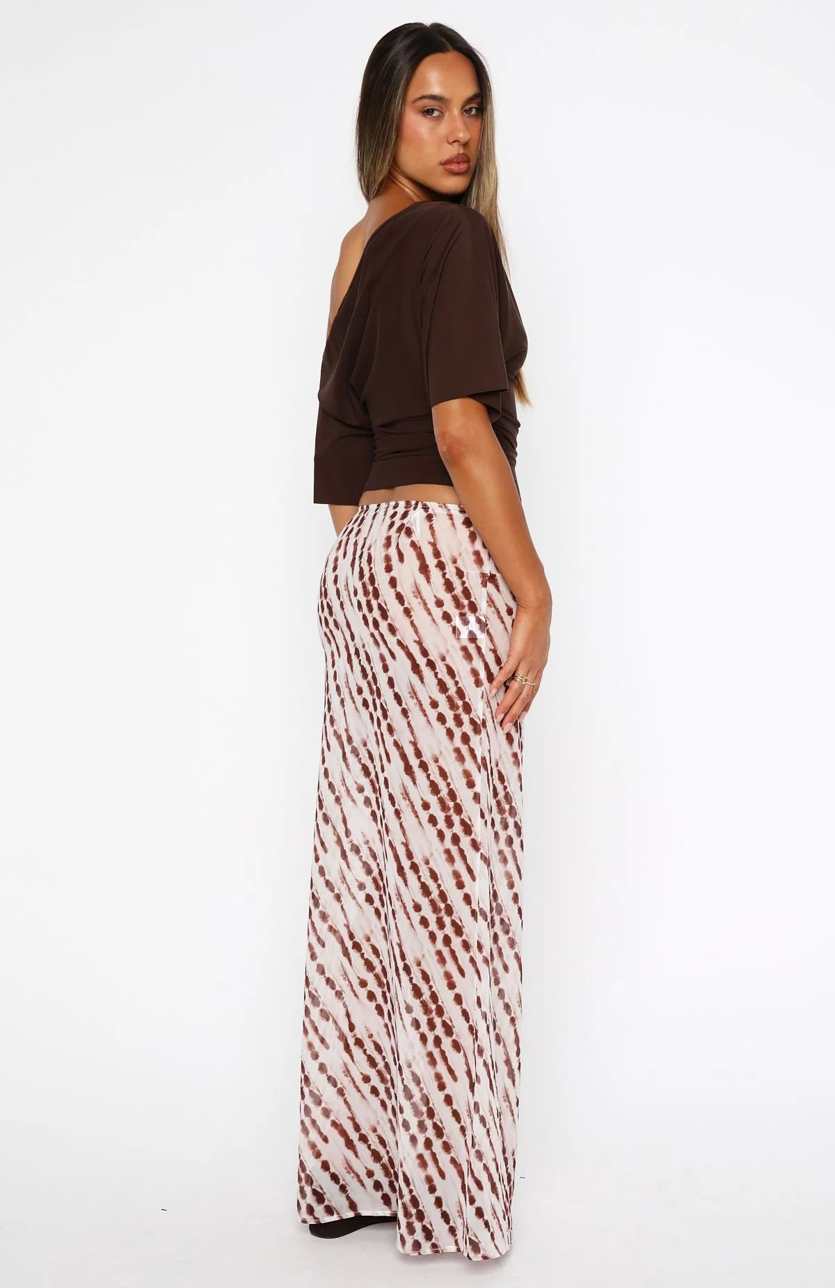 Elevate your look with a hint of grace. The Sunday Strolls Maxi Skirt Espresso Mist features a sleek fixed waistband, flowing A‑line silhouette, sheer draped fabrication, and a discreet side zipper with hook‑and‑eye closure for a clean finish. Style with a statement top and simple flats for an effortless look.