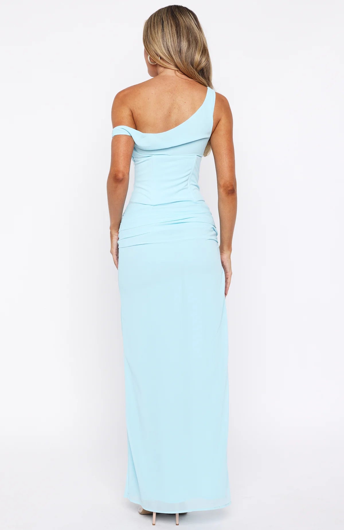 A bold take on feminine elegance, the Unavailable Energy Maxi Dress in Ice Blue is designed to captivate. Features a one-shoulder neckline complemented by built-in bust cups and internal boning at waist. A cut-out at the waist adds a touch of allure, while side ruching and a high leg split enhance its sultry appeal. The fully lined silhouette and the invisible side zipper ensures comfort. Pair with your tallest heels and dainty gold jewellery to complete this statement-making fit.