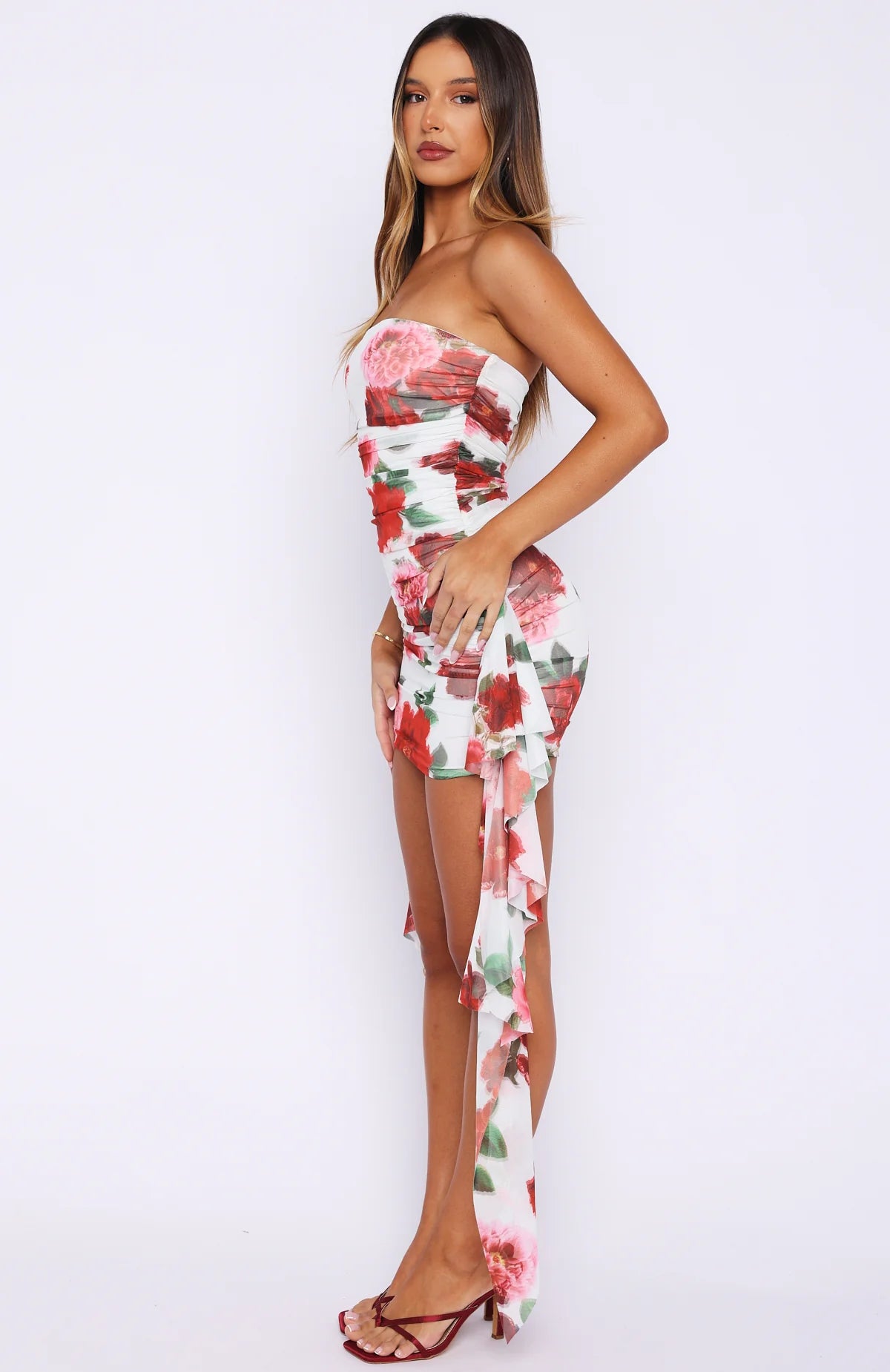 Turn heads in our newest mini that's as fun as it is flirtatious. The Valentine Muse Strapless Mini Dress Heirloom Bloom features a strapless design with a gel grip at bust keeping you secure all night long, fully lined material, stretch fabric that hugs your curves in all the right places, side ruched detailing and a cascading ruffle waterfall design. Whether you're celebrating love or just feeling yourself, this dress is meant for you!