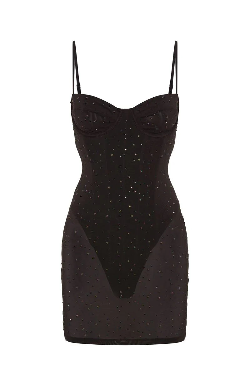 Make midnight memorable in the Want to Party Embellished Mini Dress in Chocolate Featuring thin, adjustable straps, a sweetheart neckline with underwire bust cups, and an integrated bodysuit with a hook‑and‑eye crotch closure. Its sheer fabrication glitters with diamanté embellishments and internal boning down the bodice ensures flawless structure. Style with heels and layered gold jewellery for the ultimate night‑out look.