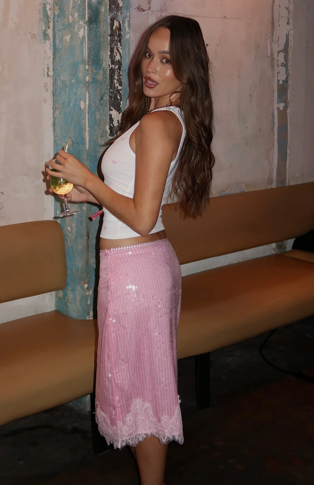 Aloha Summer! The Whispered Promise Sequin Midi Skirt Candy Pink features a fixed waistband, A-line silhouette and shimmering sequin fabric. The delicate lace trim adds a touch of femininity, and the side invisible zipper, featuring a hook-and-eye closure and lining, ensures a seamless look. Style with a basic tank, kitten heels and layered gold jewellery to let the skirt do all the talking.