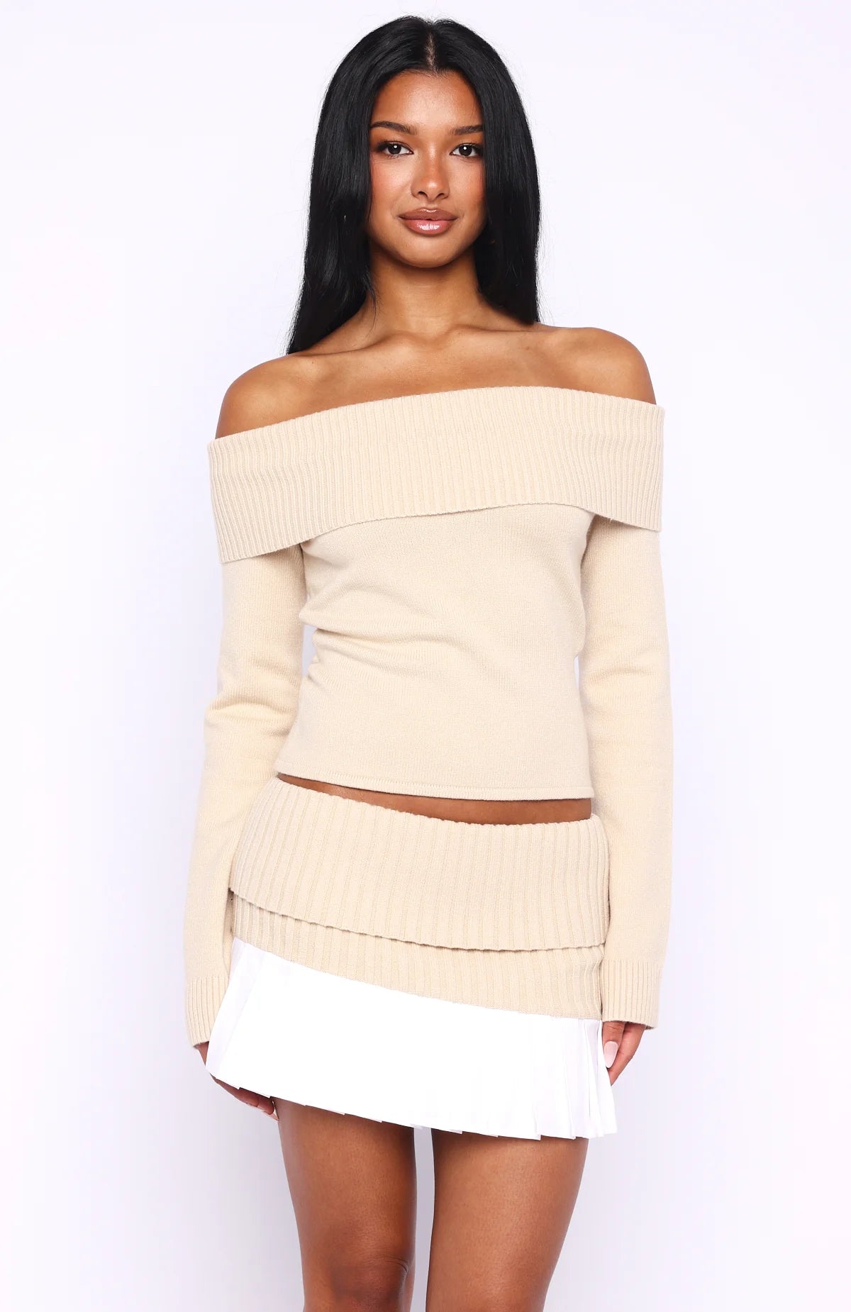 Fall in love with the You Did It Again Mini Skirt Beige. Soft knit fabric folds gently at the waist over a slim elastic band for a comfortable, flattering fit. With a playful pleated hem and a light semi-lining, it moves beautifully with you. Style with the matching Casually Perfect Long Sleeve Knit Top Beige, kitten heels and statement earrings.