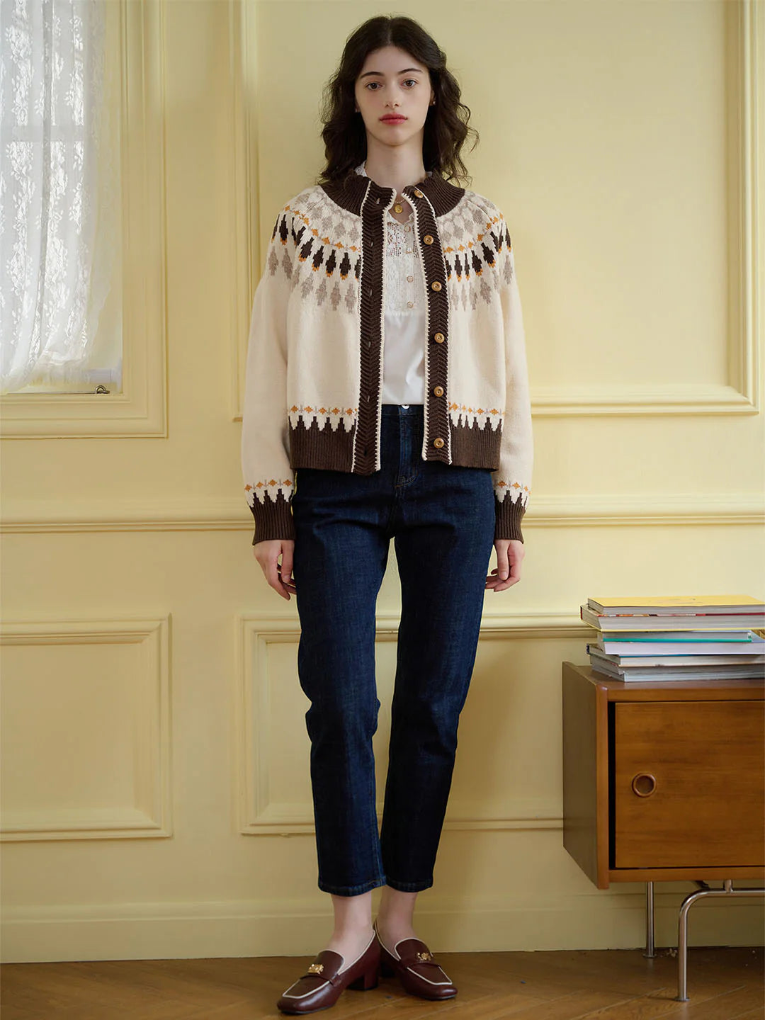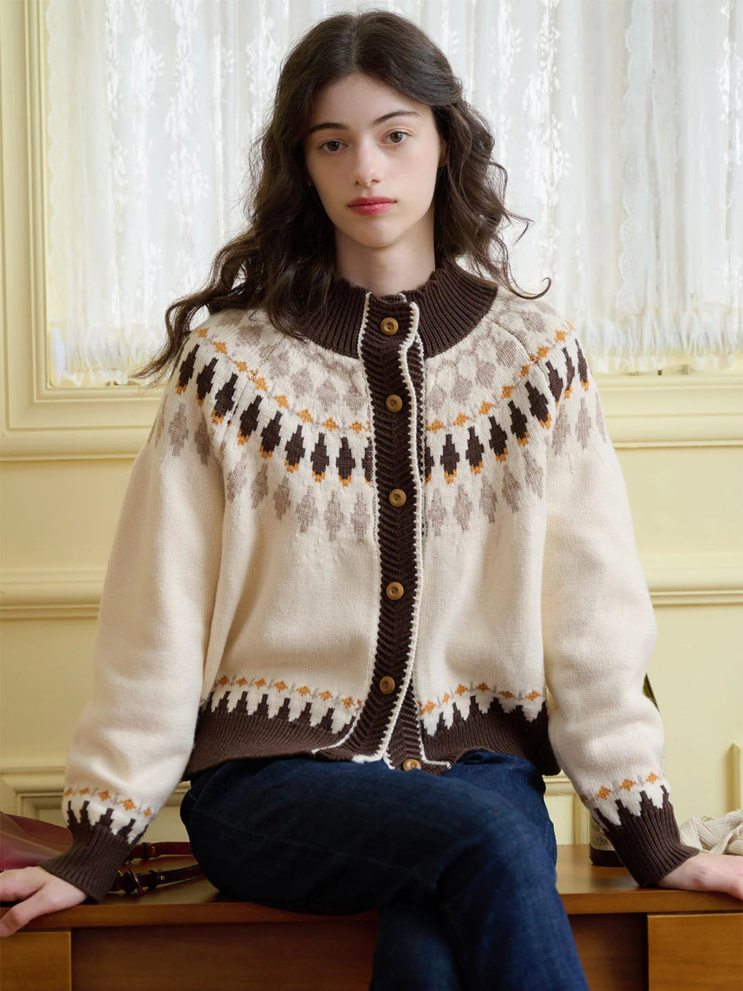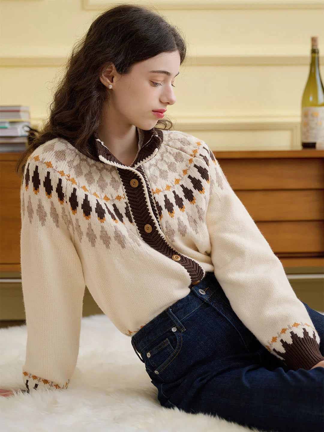 | Detail | Loose cardigan style, wavy round neck, graceful curvature, softening the line of the neck; classic rhombus Fair Isle pattern, artistic healing; harmonious color scheme of apricot and coffee brown, exquisite embellishment of retro wooden buttons, with a warm autumn and winter atmosphere; The fabric has excellent elasticity, full hand feel and thermal insulation performance, is soft but not stiff, crisp and stylish, and not easy to pilling | |||